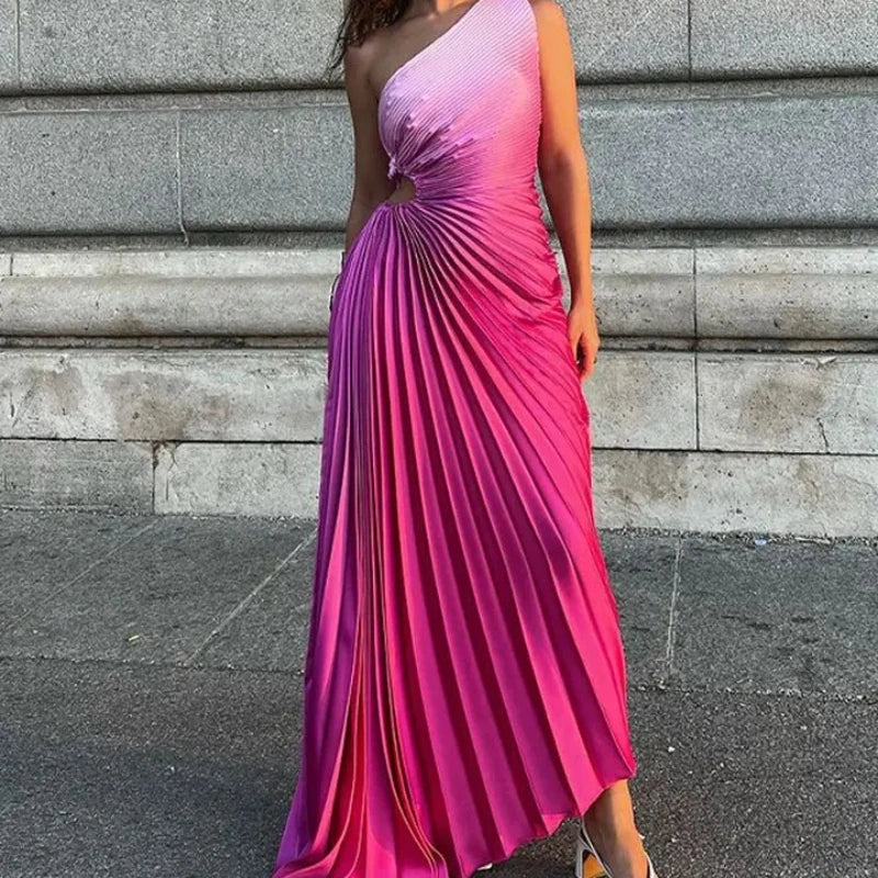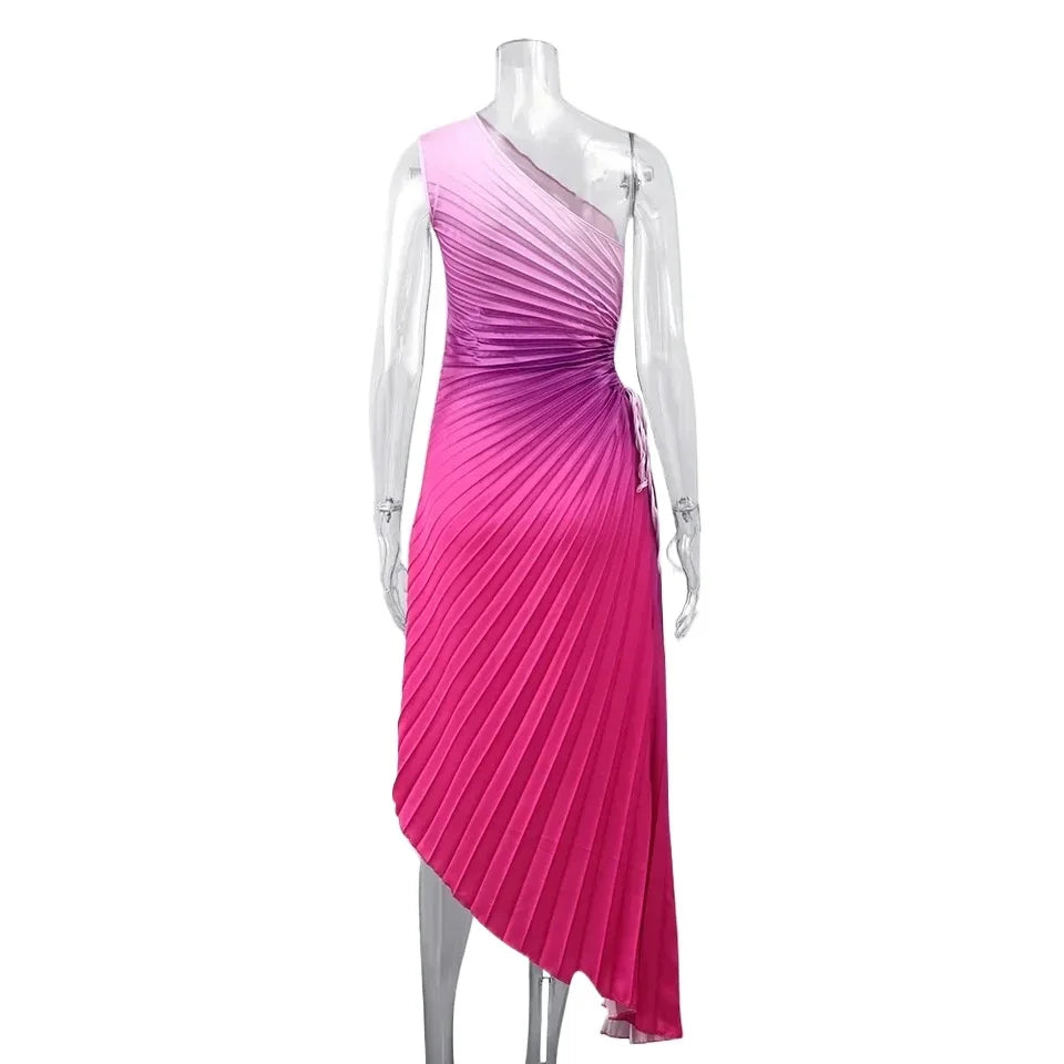 MQTIME - One Shoulder Pleated A-line Party Dress Sleeveless Elegant Evening Vestidos Backless Gradient Color Femme Club Dress
