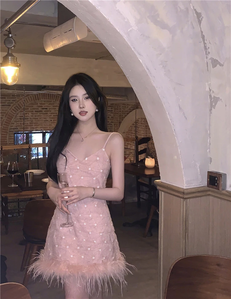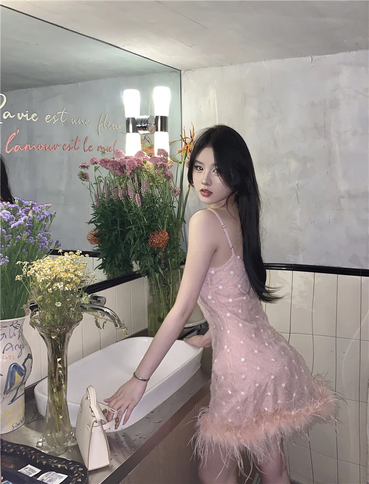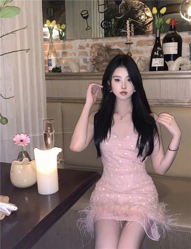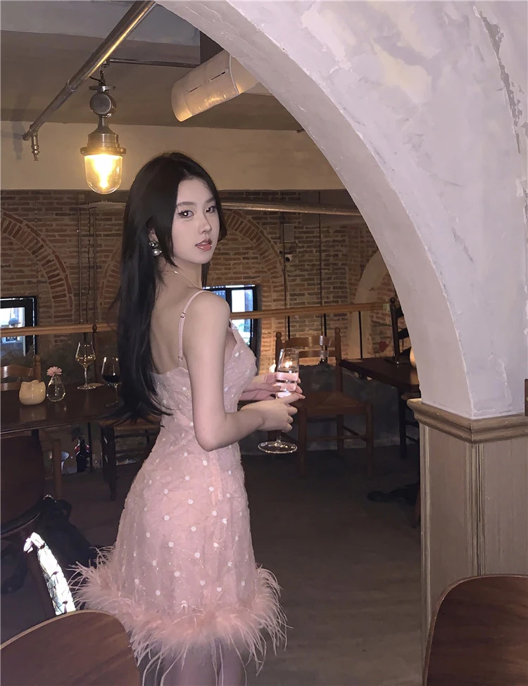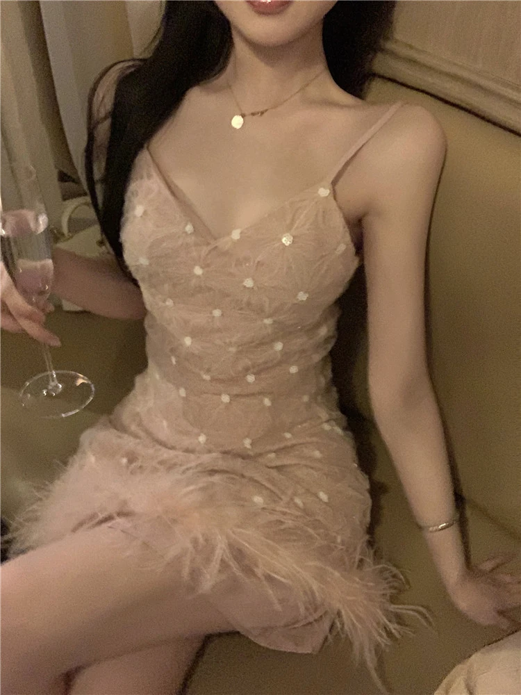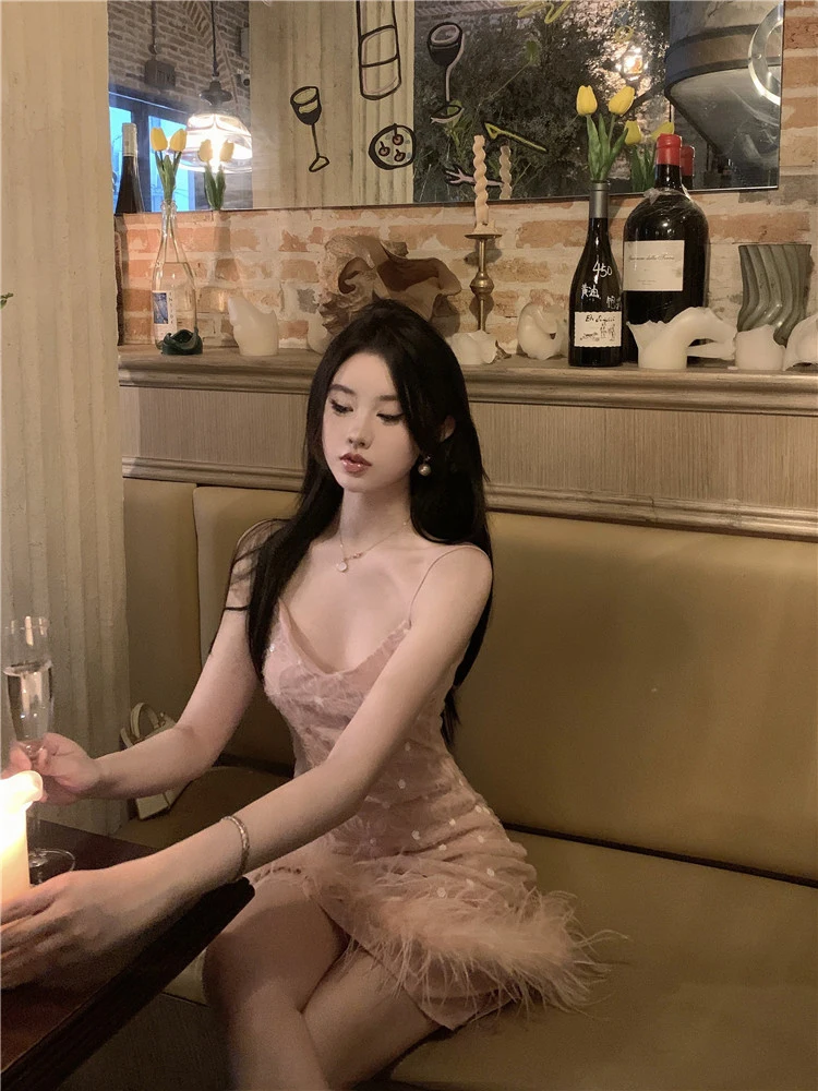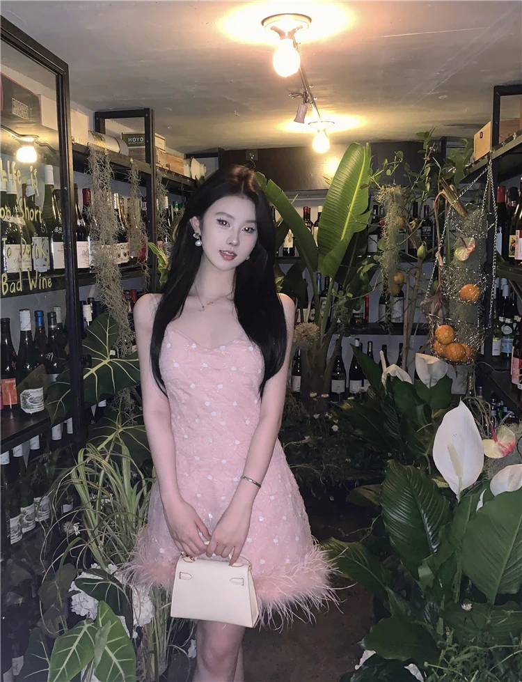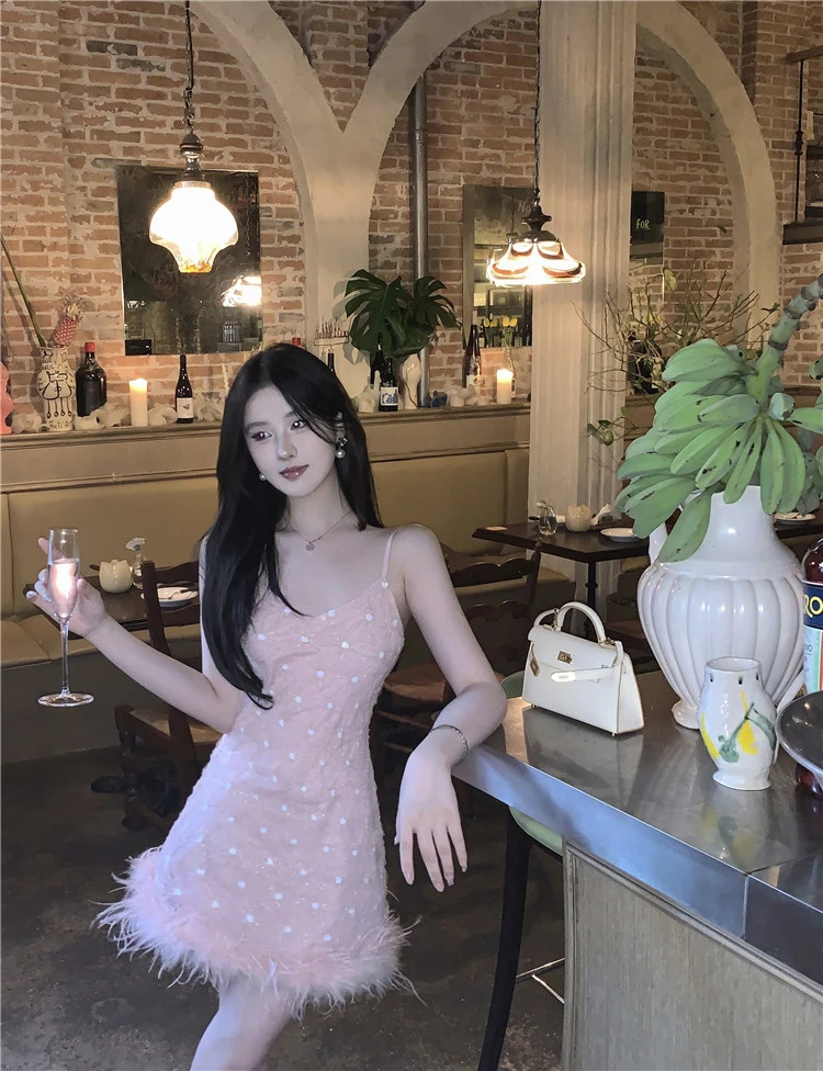 MQTIME - Party Dress Women Sexy Slim Sequins Spliced Fur Strapless Dresses Spring Summer Sleeveless Fashion Vestidos