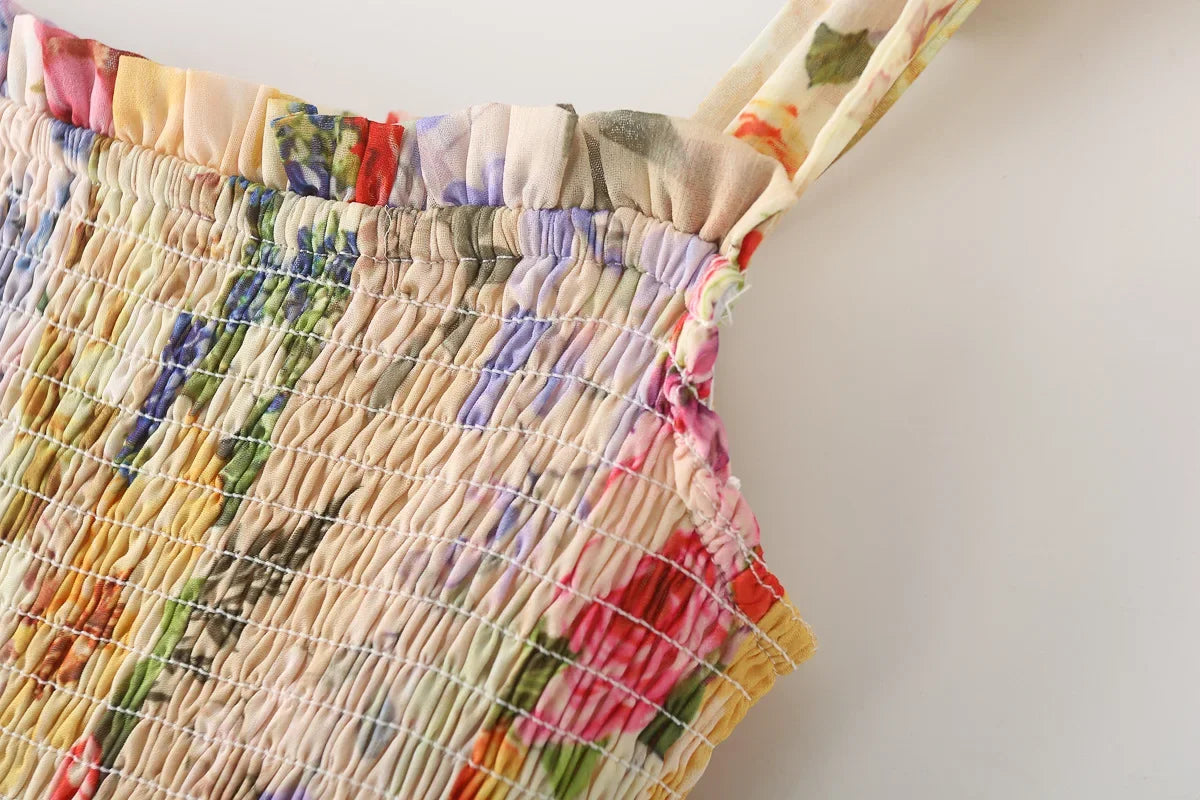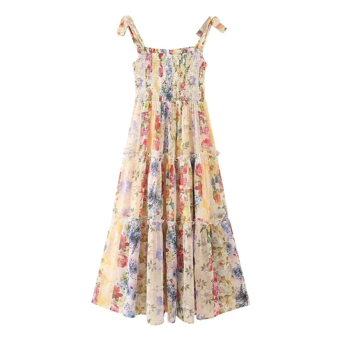 MQTIME - Printing Boho Dress Lace-up Straps Maxi Dress A-line Floral Pleated Vestidos Chiffon Holiday Dresses Hippie Robes
