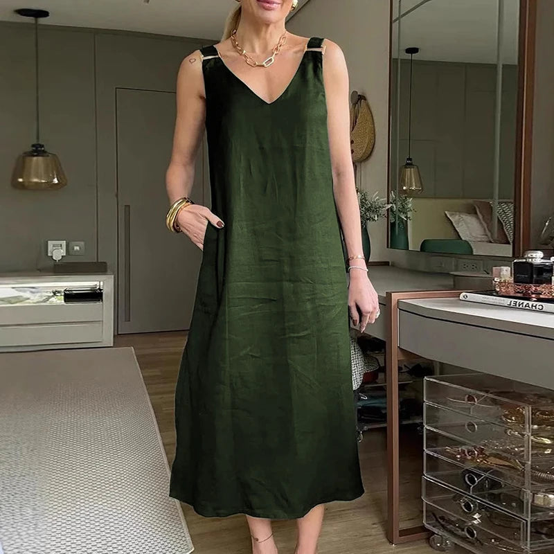 MQTIME  -  Retro Solid Color Lady V Neck Loose Suspenders Dress Sexy Hollow Out Sleeveless Summer Dress Casual Street Pocket Pullover Dress