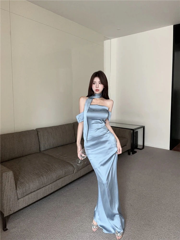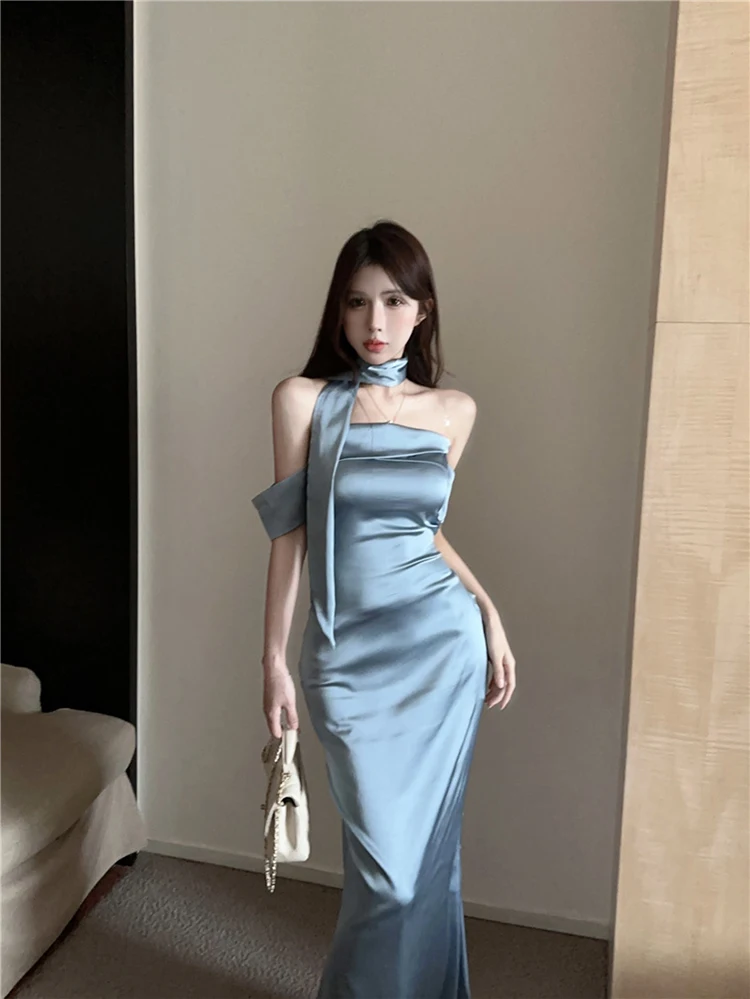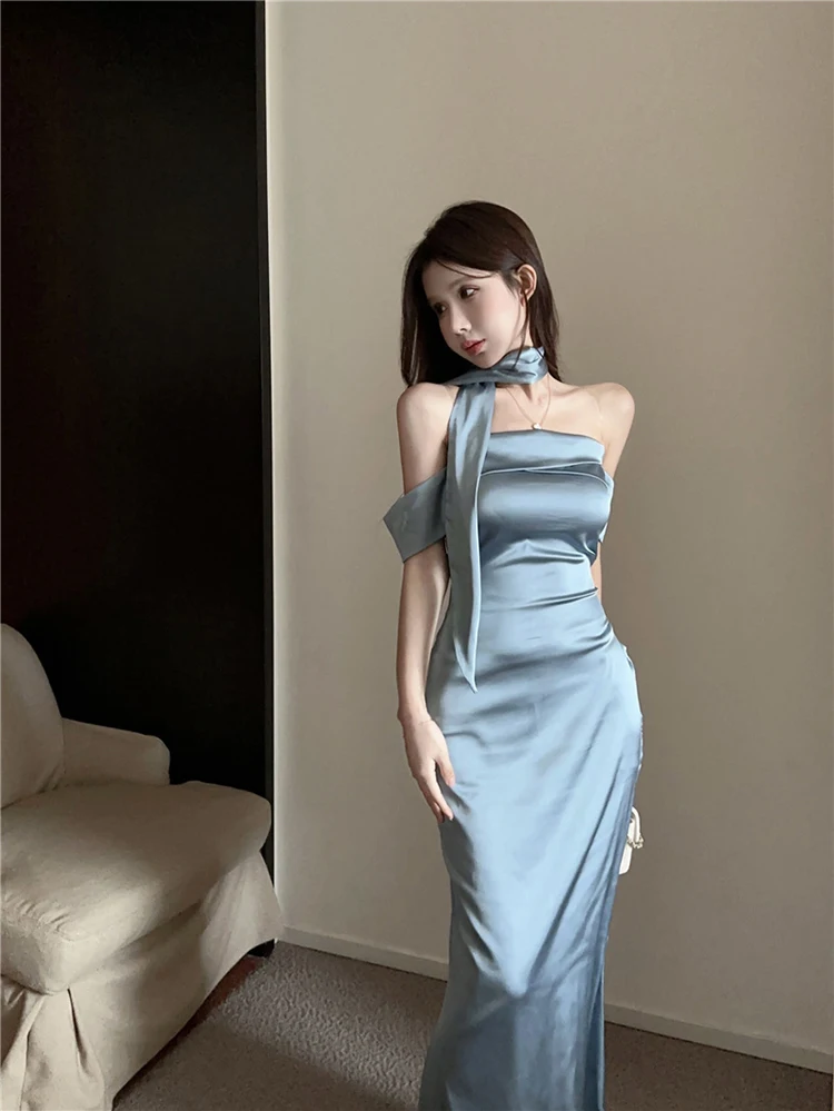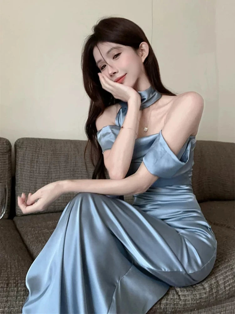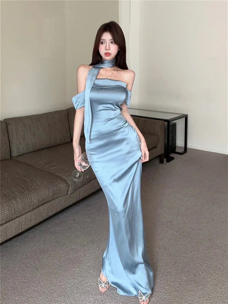 MQTIME - Satin Halter Sleeveless Transparent Slip Solid Zip Up Elegant Sexy Maxi Prom Dress Summer Women Wedding Party Vestido Outfit