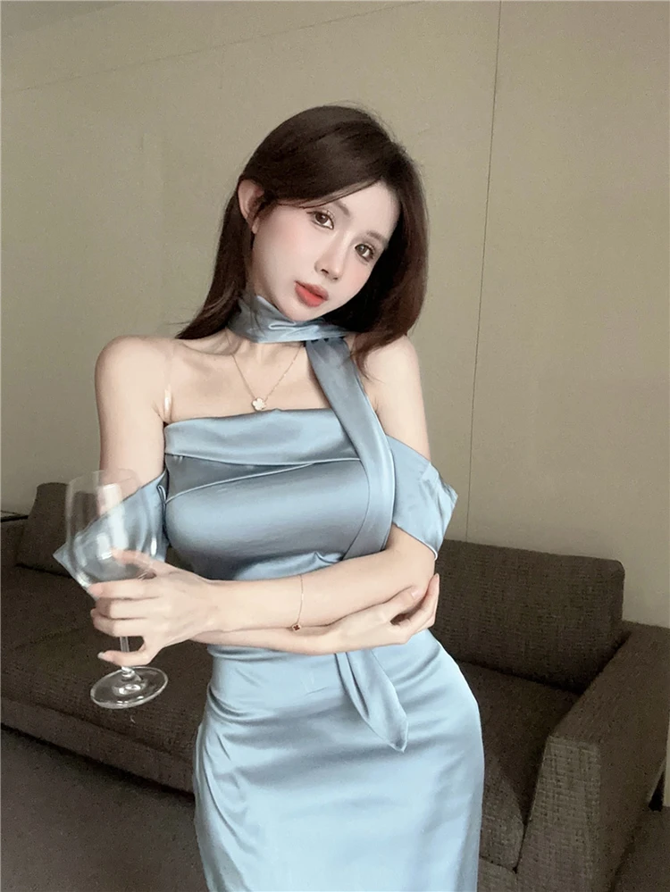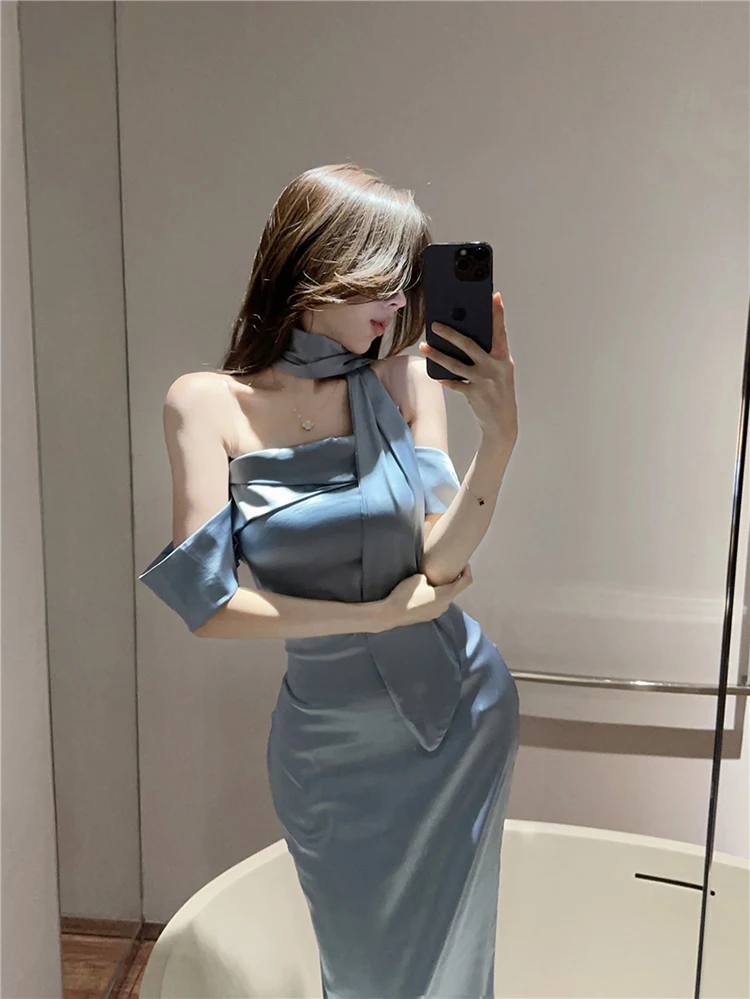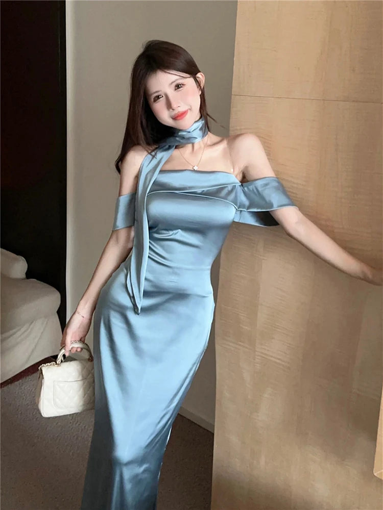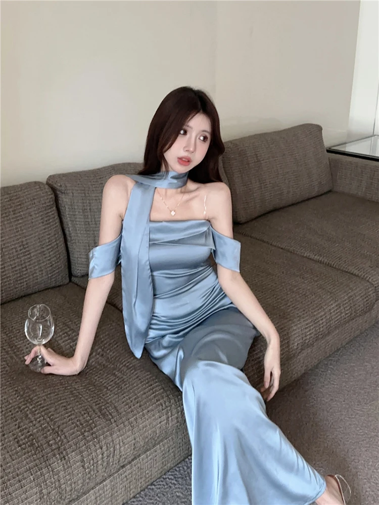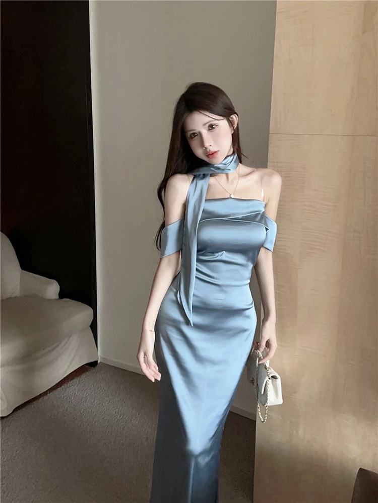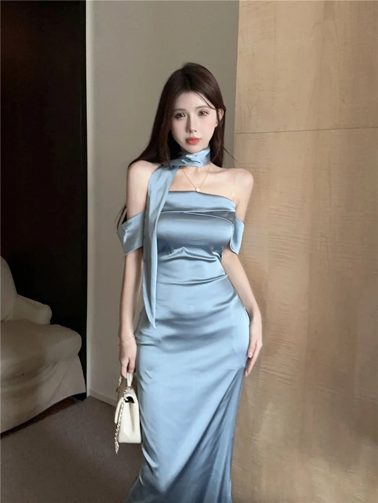 MQTIME - Satin Halter Sleeveless Transparent Slip Solid Zip Up Elegant Sexy Maxi Prom Dress Summer Women Wedding Party Vestido Outfit