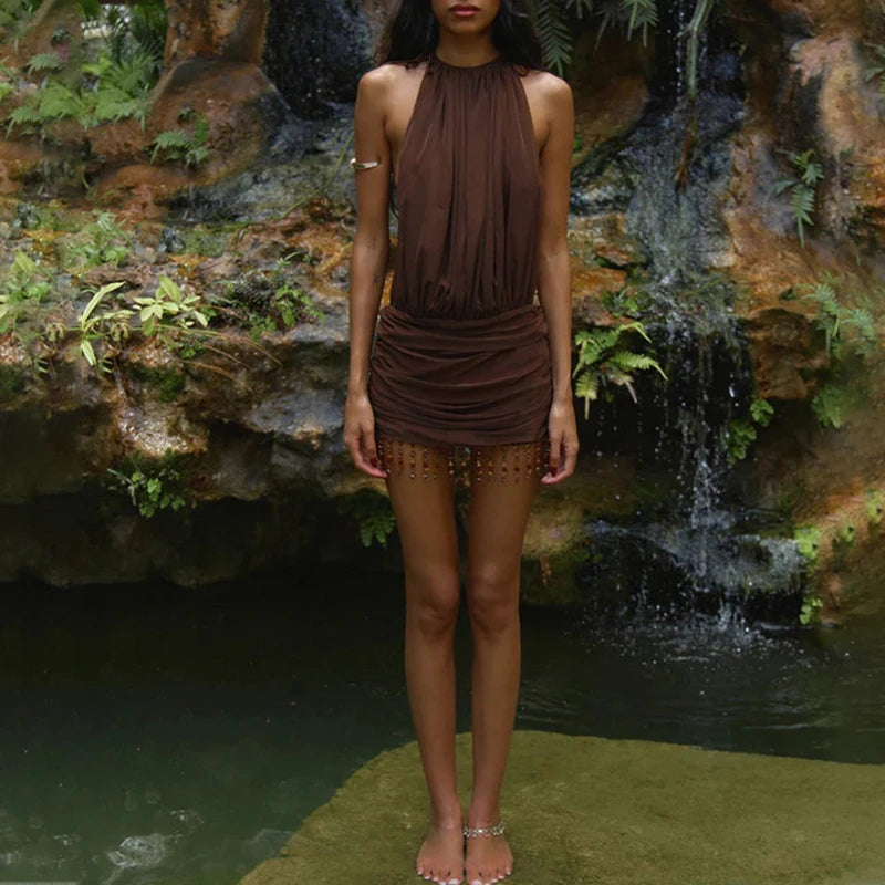 MQTIME - Sea Yacht Cocktail Sleeveless Fringe Summer Dress Lace Up Halter Hollow Solid Color Dress Mini Slim Backless Women's Beach Dress