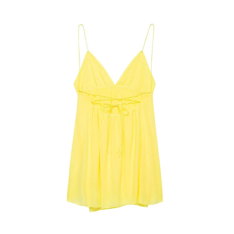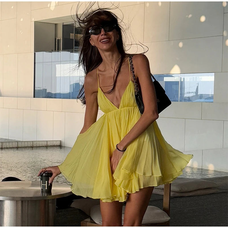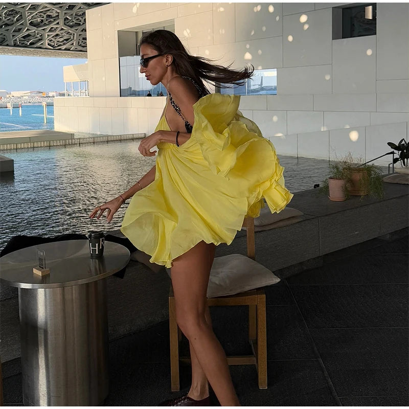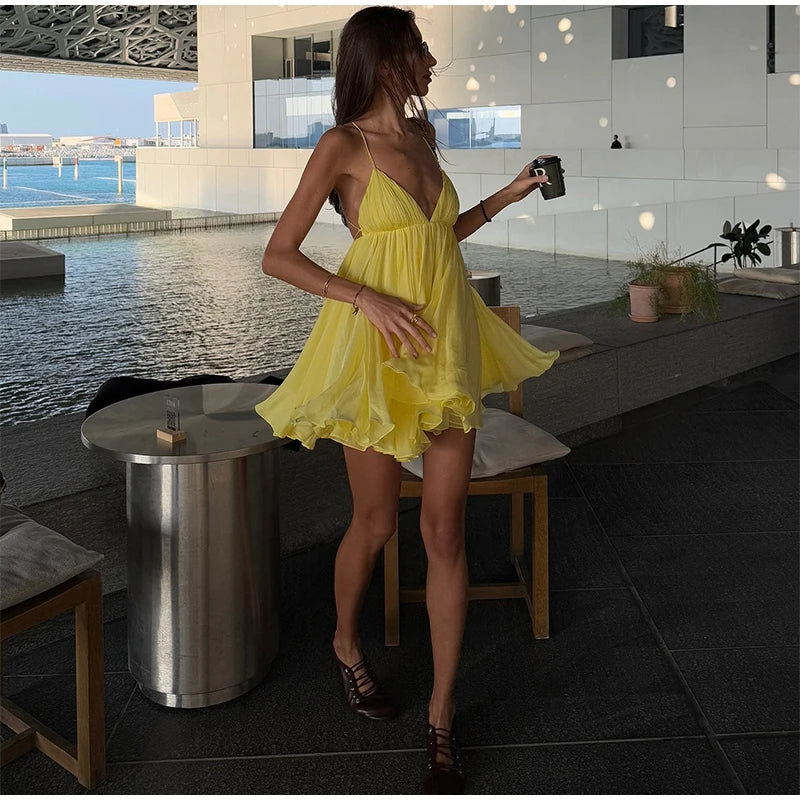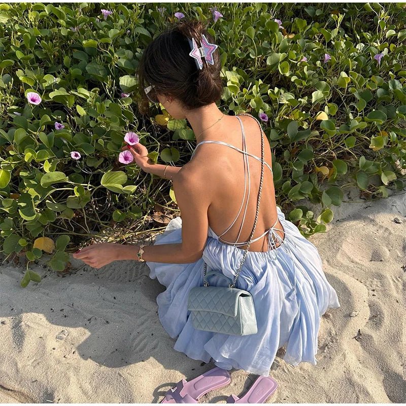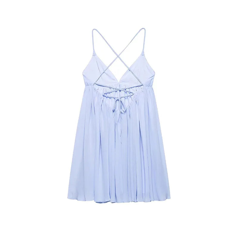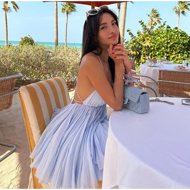 MQTIME - Sexy Backless Short Puffy Dress Women Lace Up Halter Sleeveless Pleated Female Beach Dresses 2025 Summer Lady Solid Holiday Robe