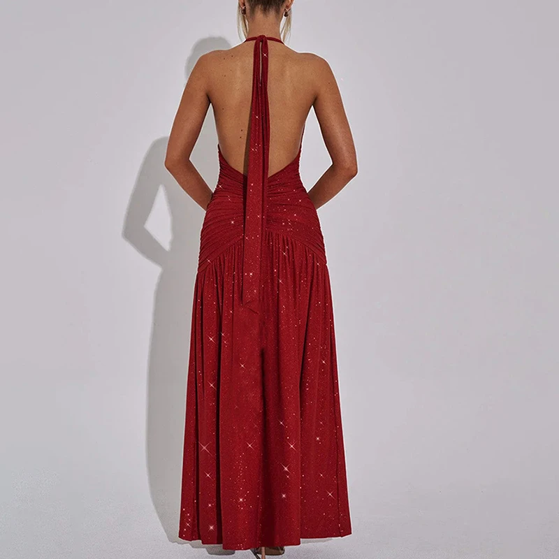 MQTIME  -  Sexy Deep V-neck Halter Slim Evening Dress Women Fashion Bright Silk Hight Waist Long Dress Elegant Sleeveless Split Party Dress
