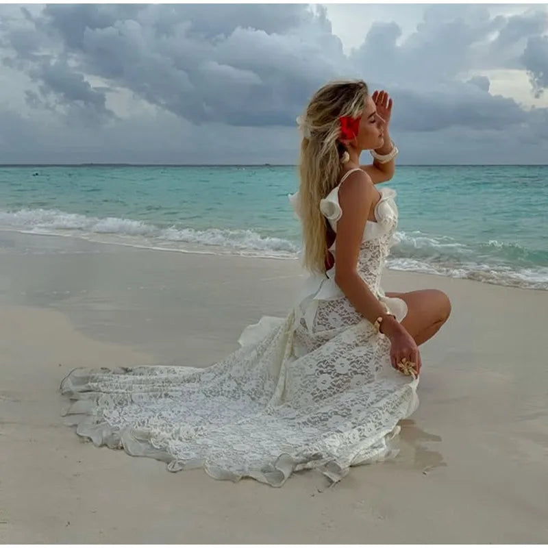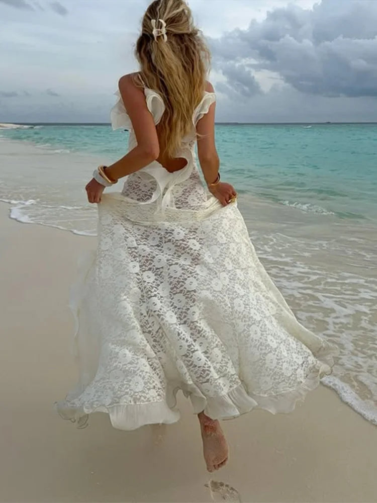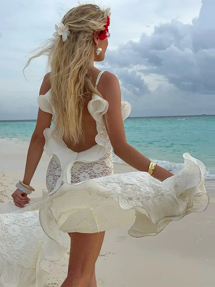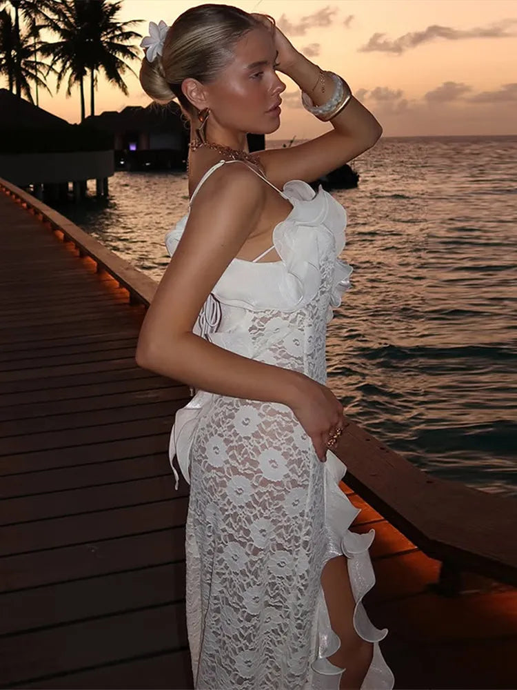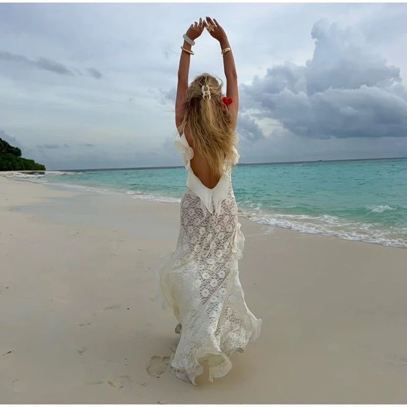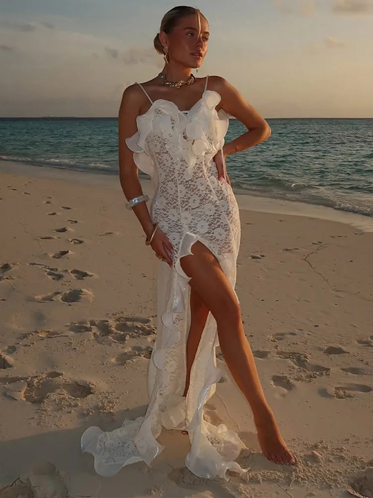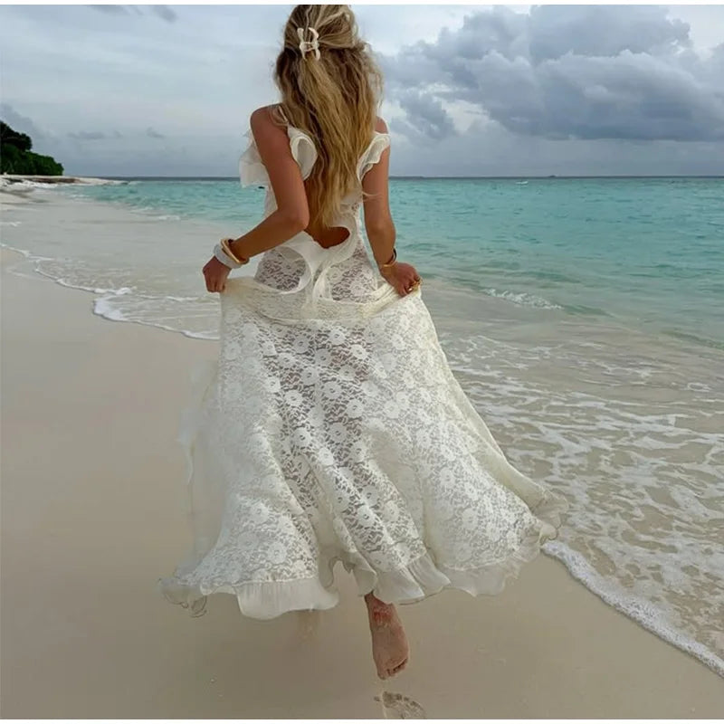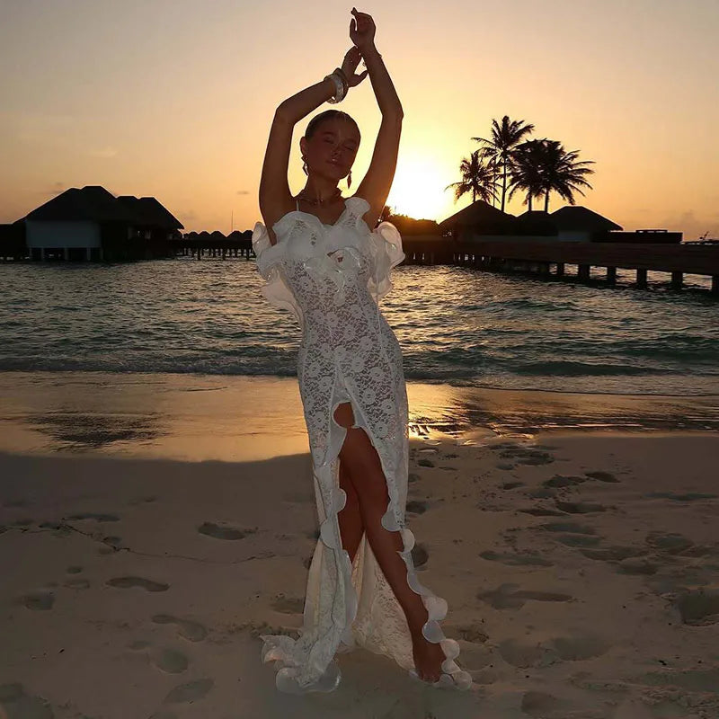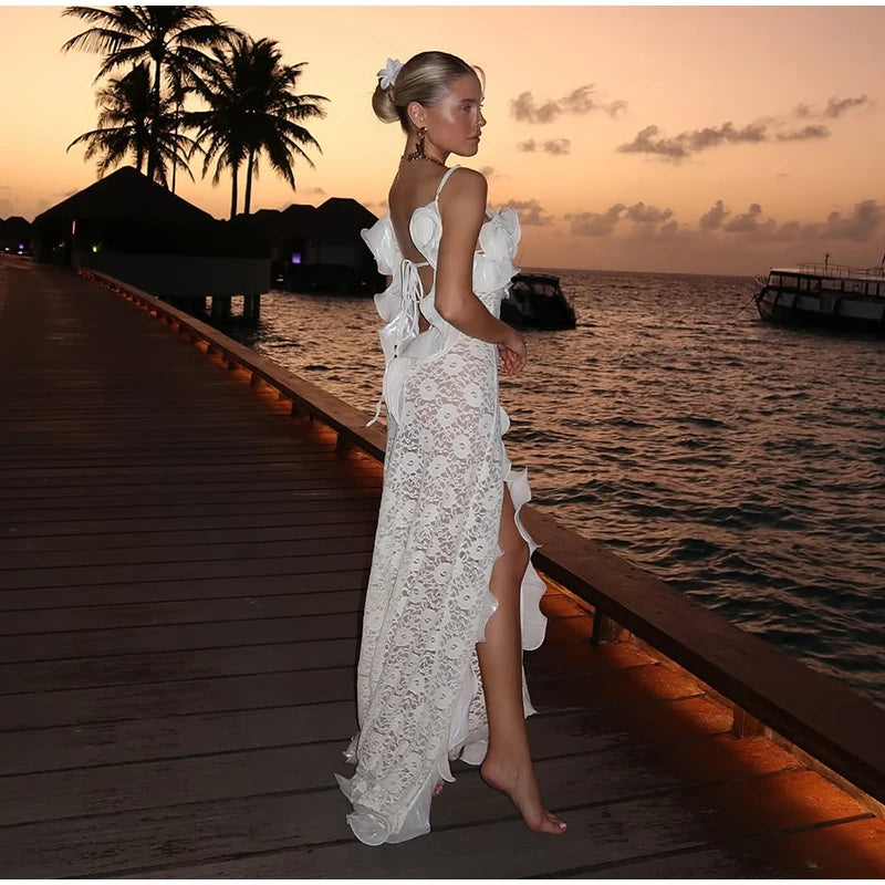 MQTIME - Sexy Hollow Out Ruffles Split Long Dress Women Backless See Through Slim Beach Holiday Dresses 2025 Summer Slim Party Lady Robe