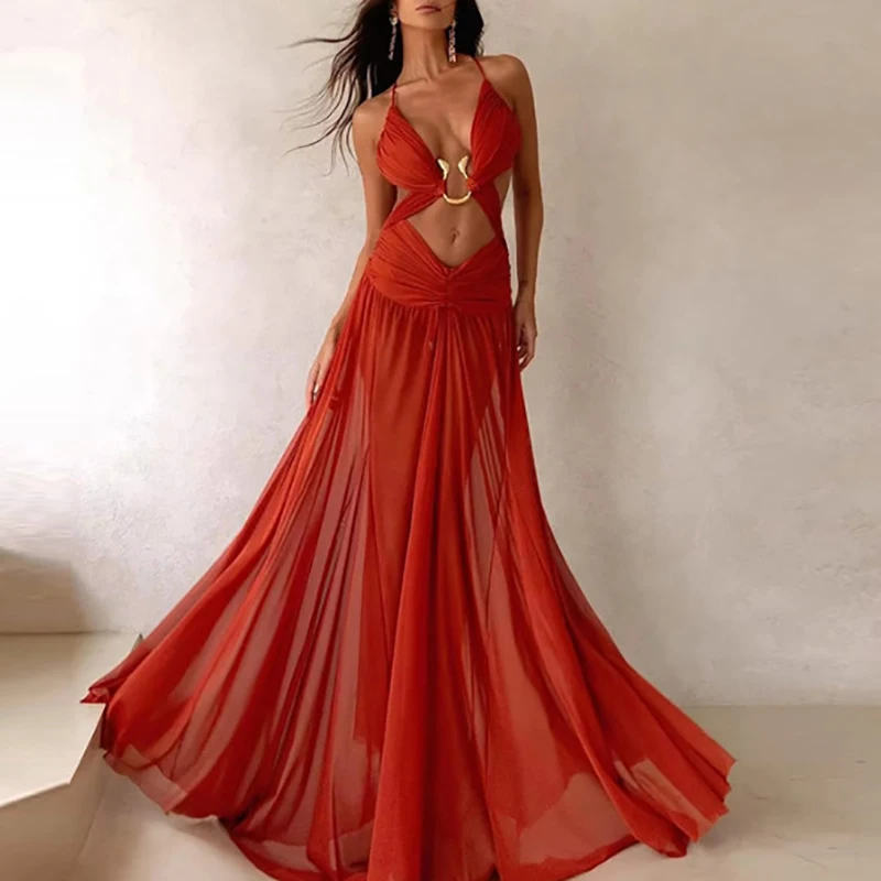 MQTIME - Sexy Ladies Deep V Hollow High Waist Long Dress Mesh Backless Suspender Evening Dress Elegant Sleeveless Pleats Robe Dress Mujer