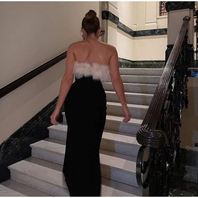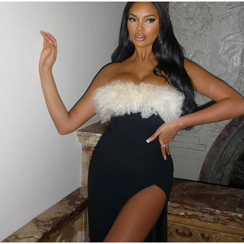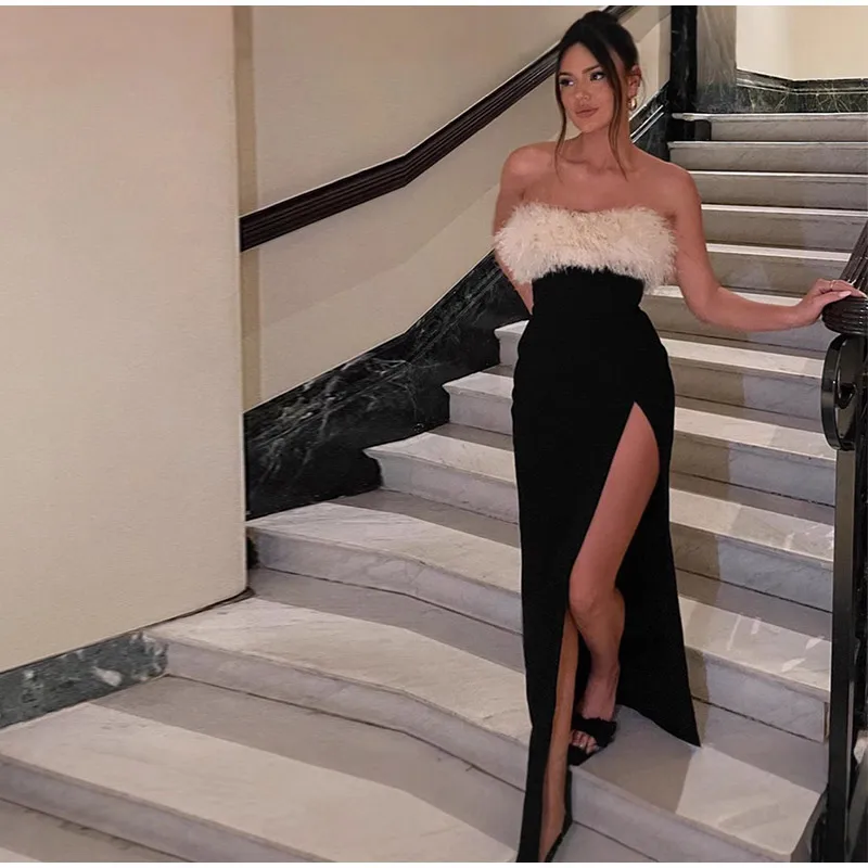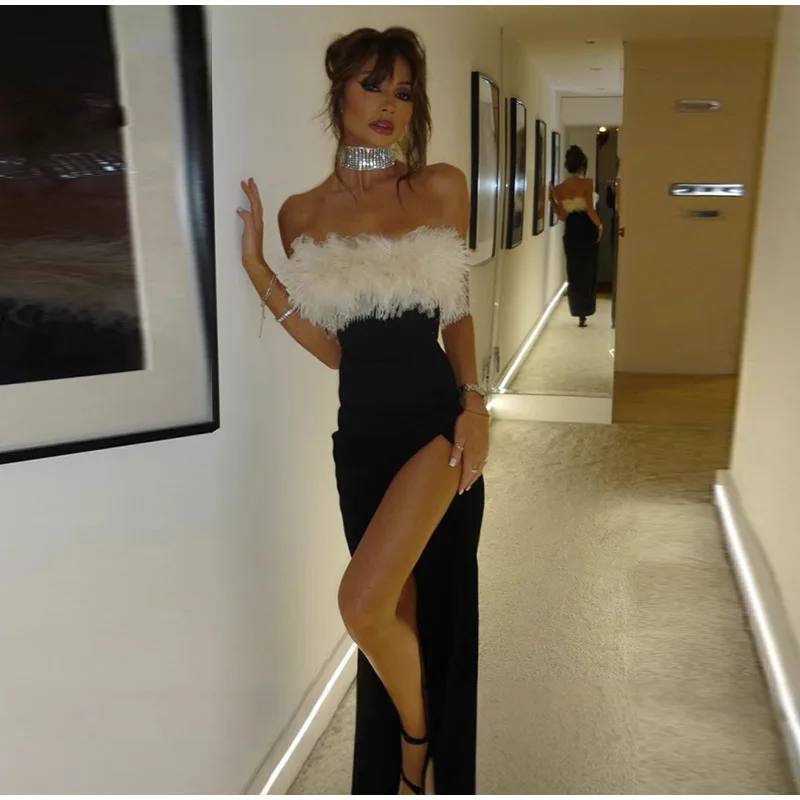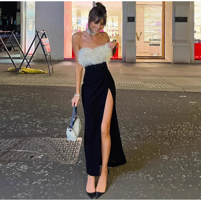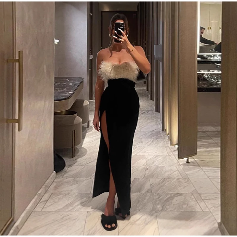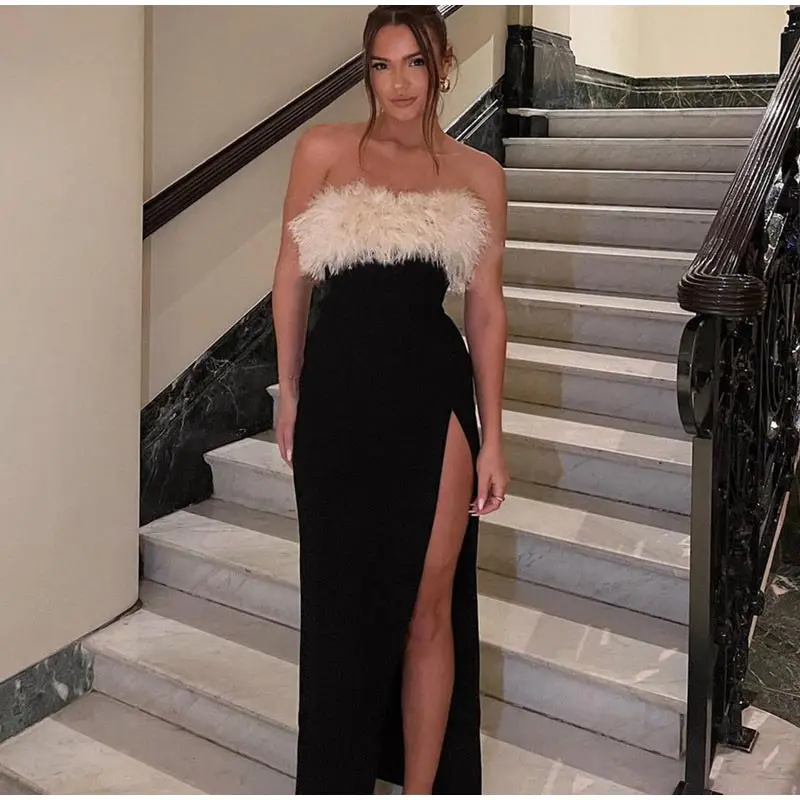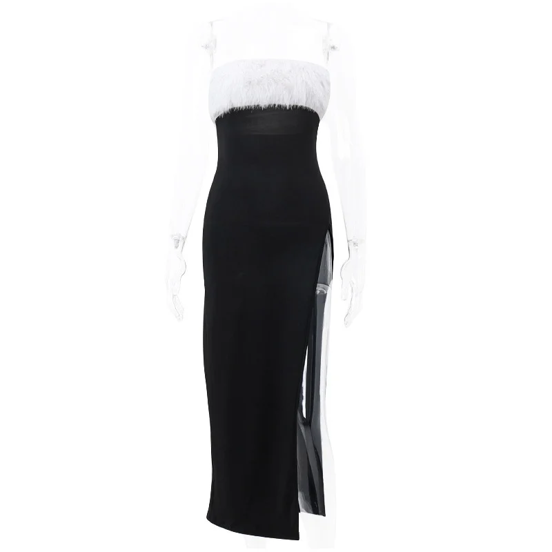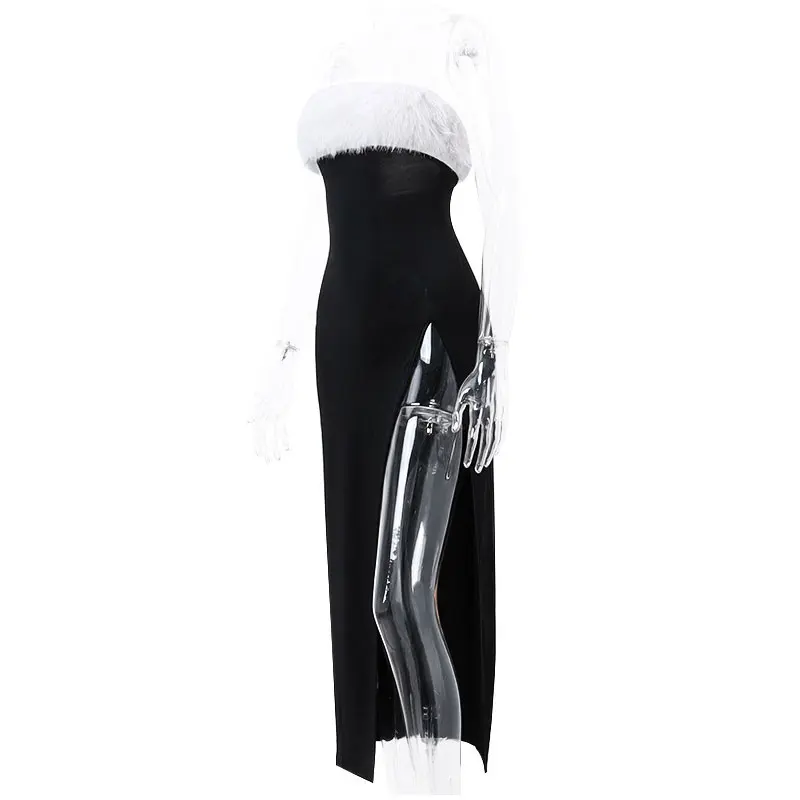 MQTIME - Sexy Plush Off Shoulder Long Dresses Women Vintage Black Slit Slim Fit Sleeveless Evening Dress Female Spring Chic Street Party