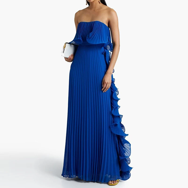 MQTIME - Sexy Strappyless Maxi Evening Dress 2025 Women Solid Color Lotus Edge Formal Dress Luxury One Shoulder Pleat Party Dress Vestido