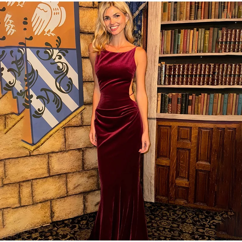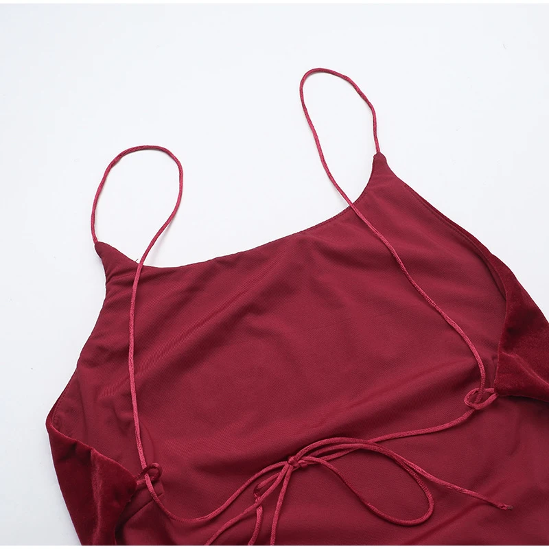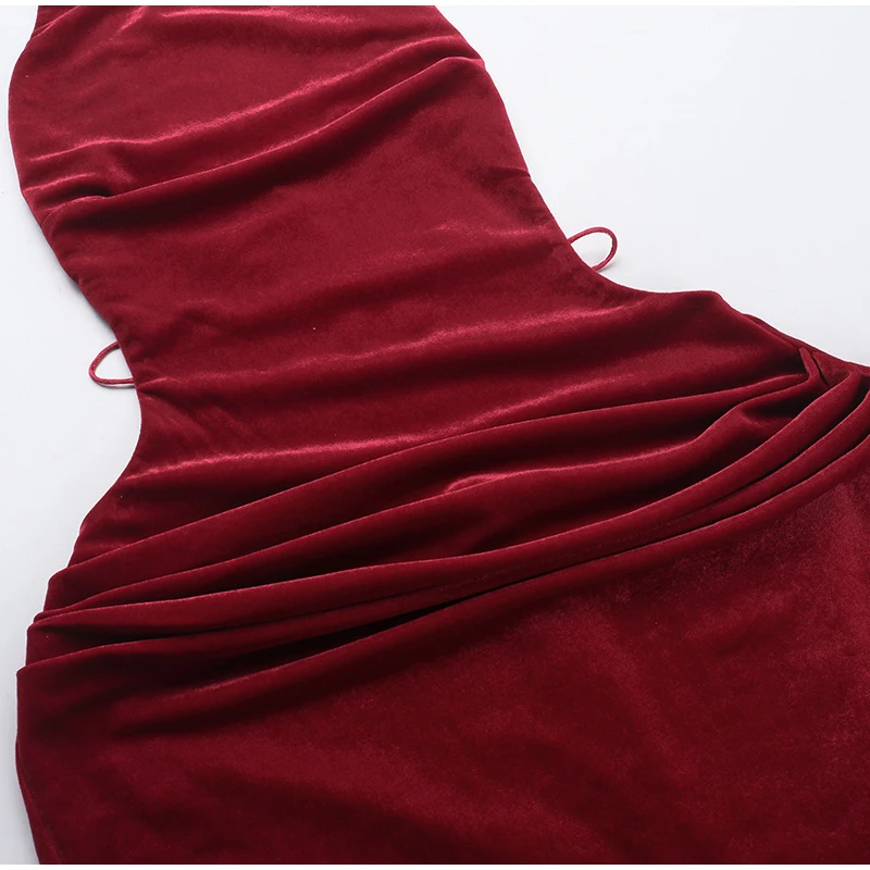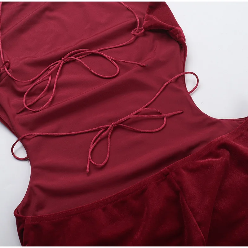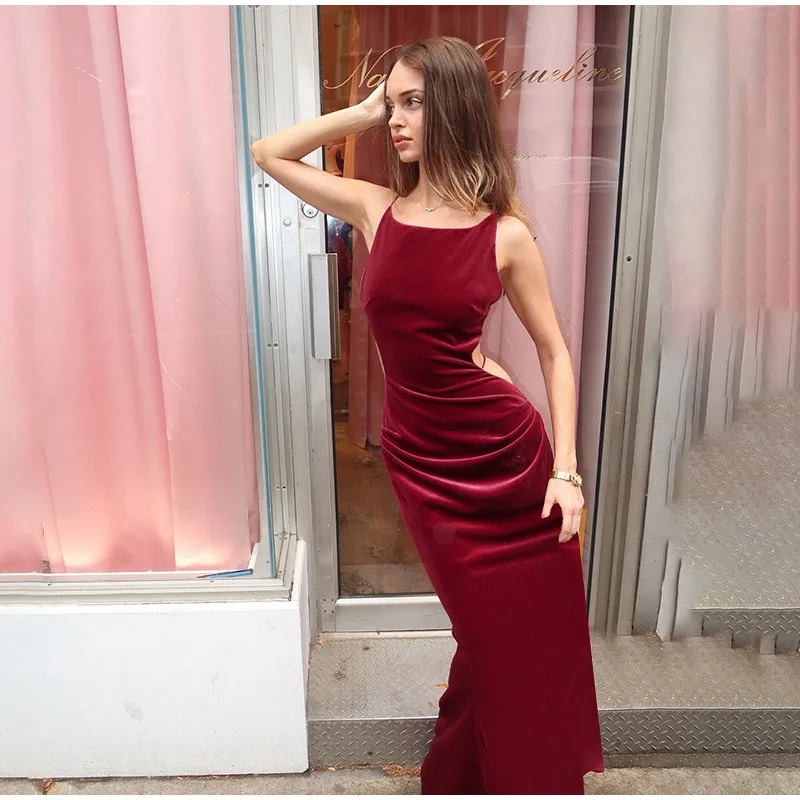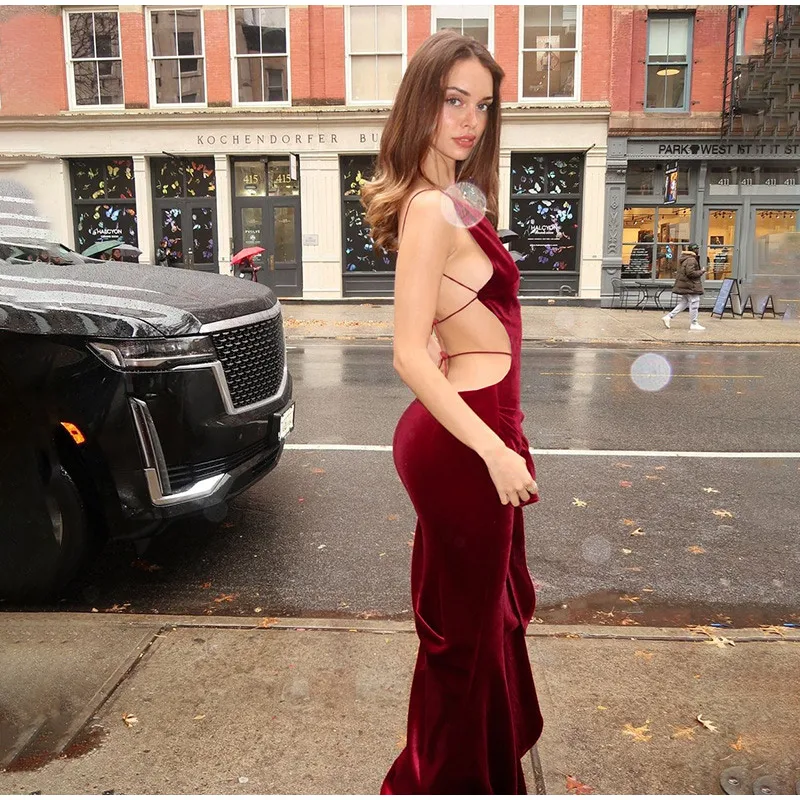 MQTIME - Sexy Velvet Backless Sling Long Dress Women Retro Solid Sleeveless Lace Up Slim Evening Dresses Female Elegant Chic Party Street