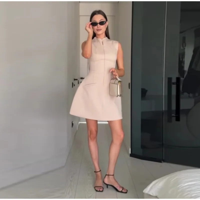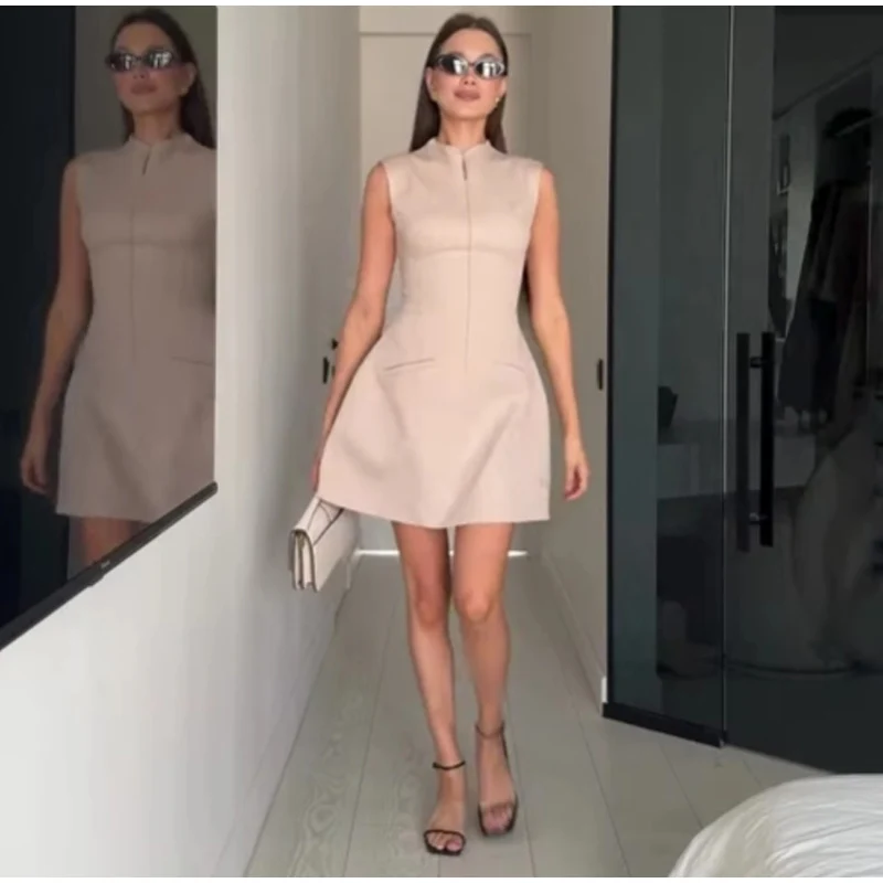 MQTIME - Sexy Zipper Short Dress Women Slim Waist O-neck Sleeveless A-line Party Dresses 2025 Summer Lady Street Commute Robes