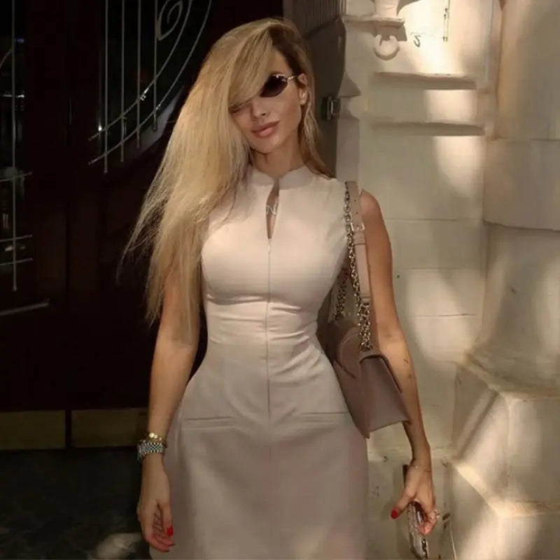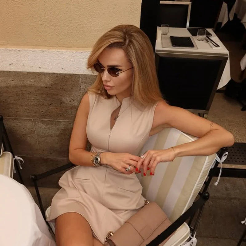 MQTIME  -  Sexy Zipper Short Dress Women Slim Waist O-neck Sleeveless A-line Party Dresses 2025 Summer Lady Street Commute Robes