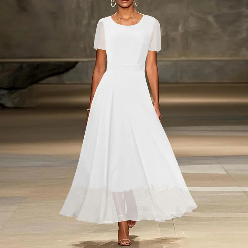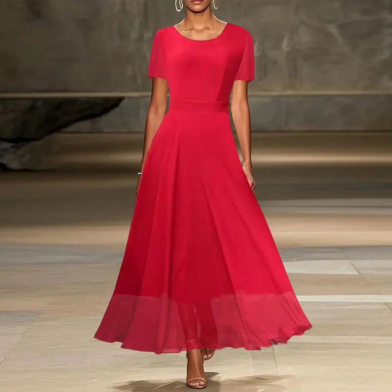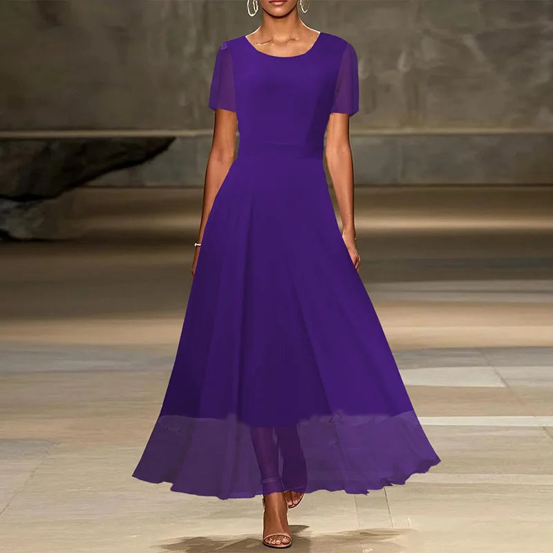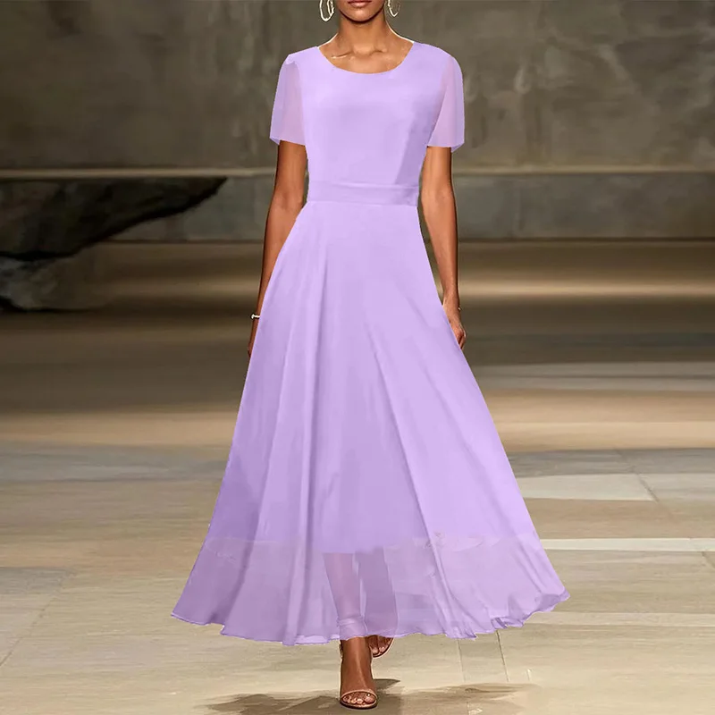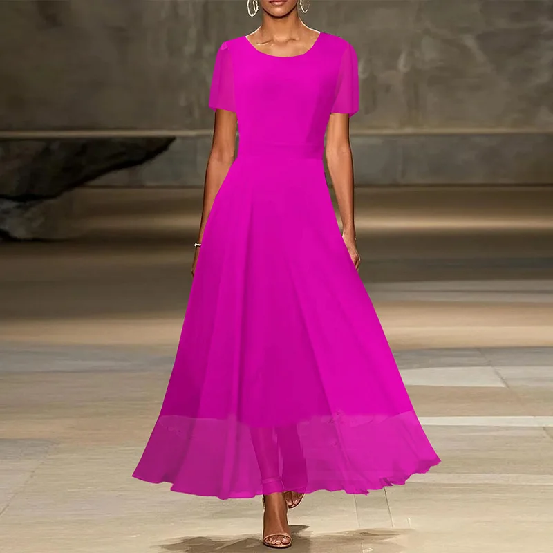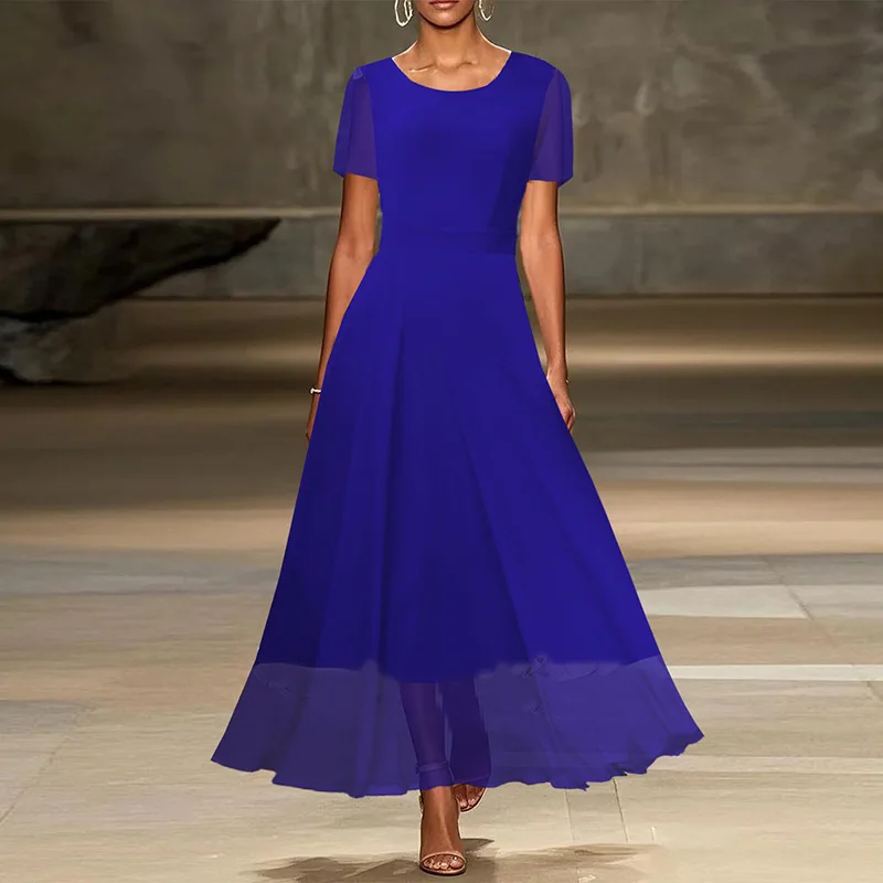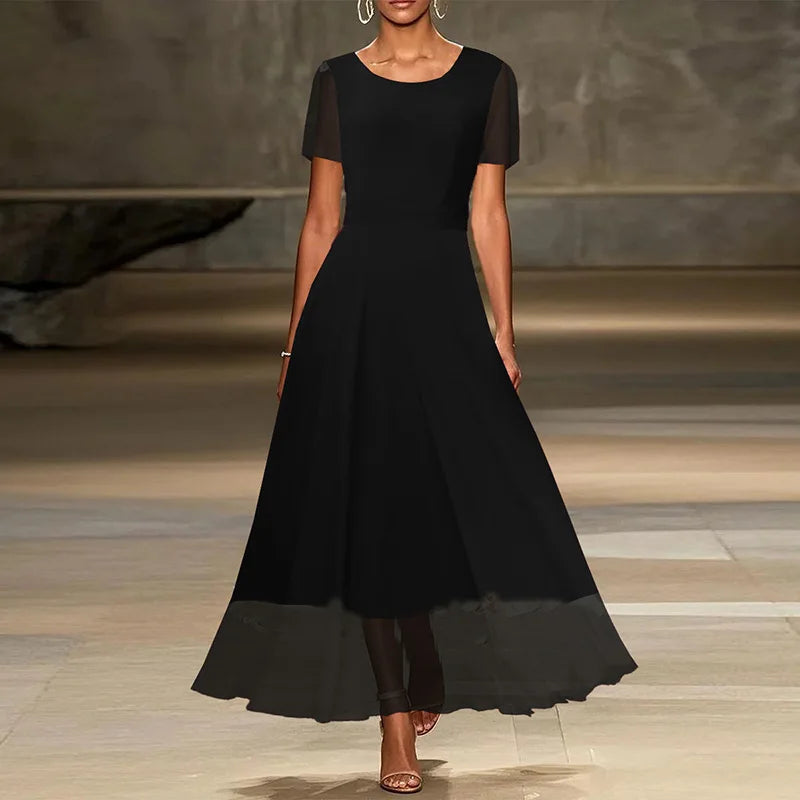 MQTIME - Show Style Stitching Mesh A-line Dress 2025 Solid Color High Waist Party Dress Casual Women Short Sleeve Temperament Long Dress