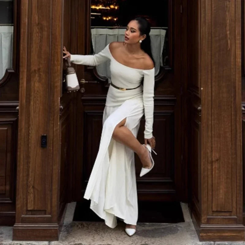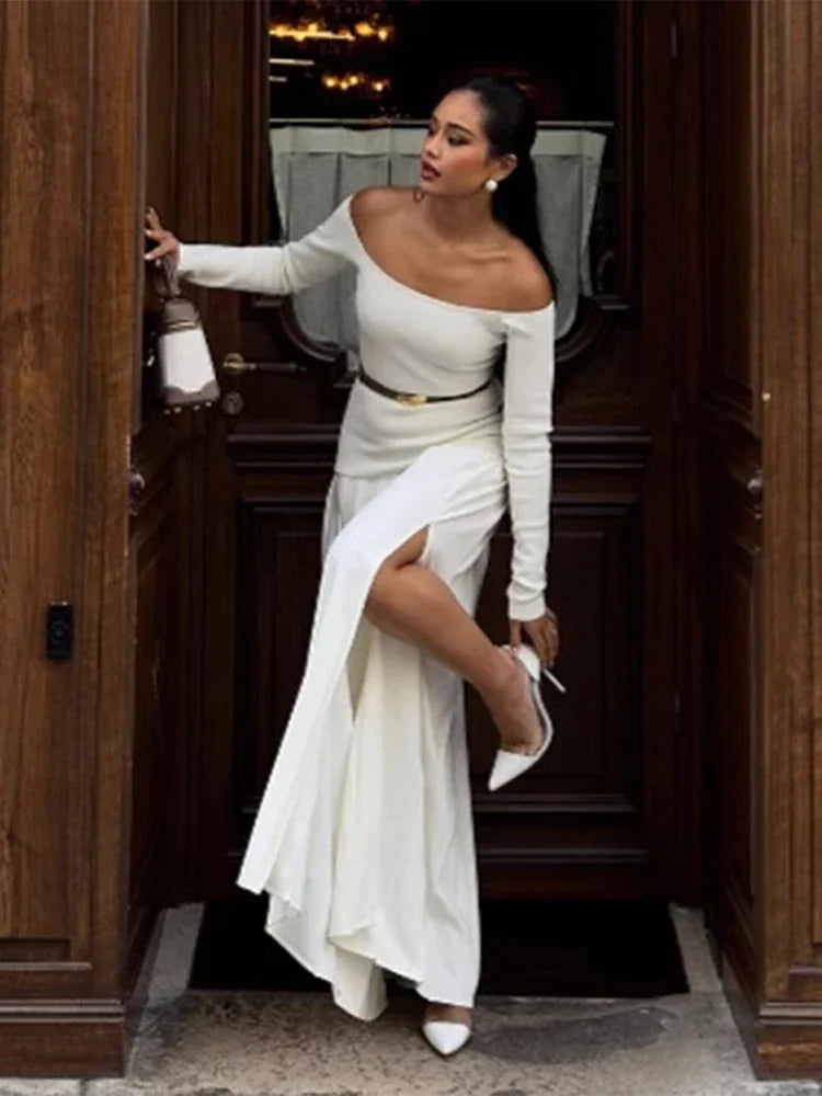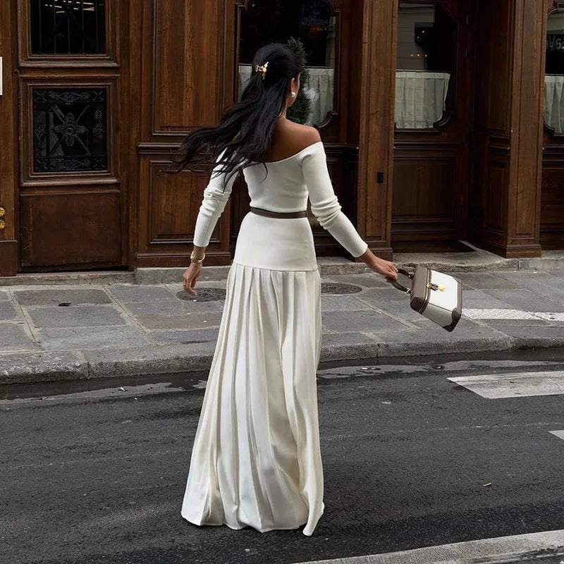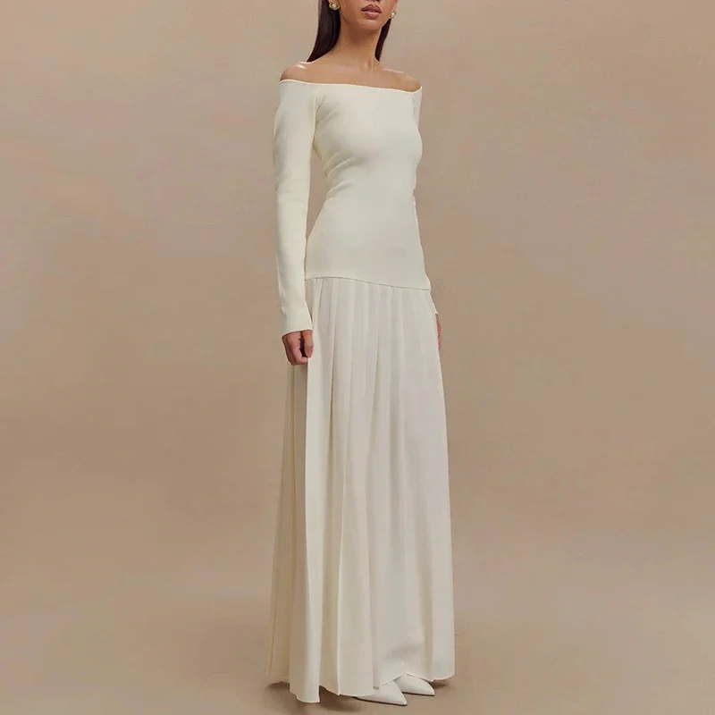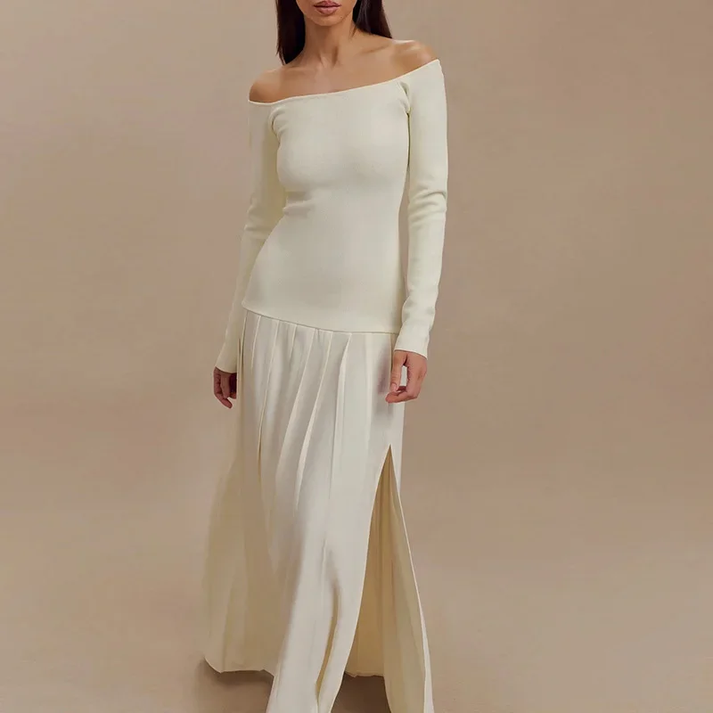 MQTIME - Slash Neck Solid Women Dresses Split Pleated A Line Female Long Dress 2024 Elegant Fashion High Waist Slim Party Lady Vestidos