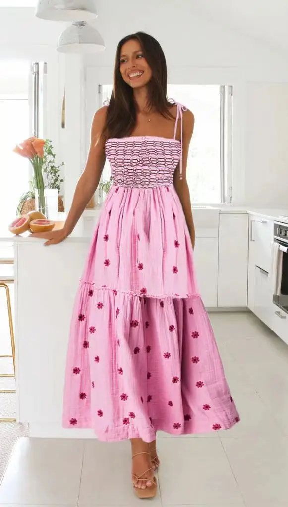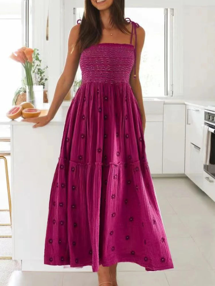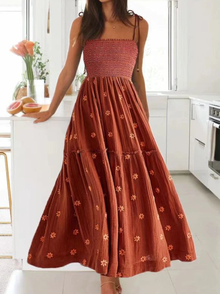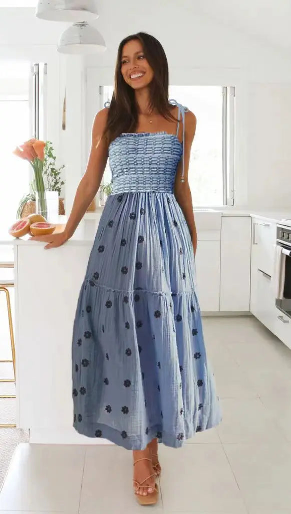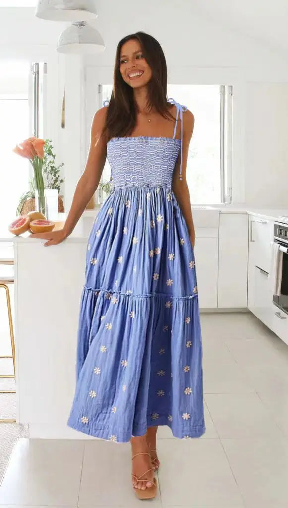 MQTIME  -  Strap Long Dress Summer Wrapped Embroidery Dress A-line Sunflower Design Ruffled Midi Length Vestidos Boho Robes