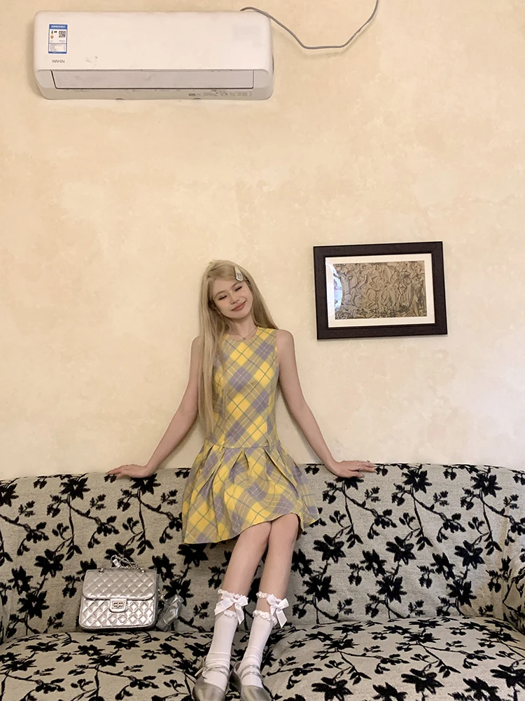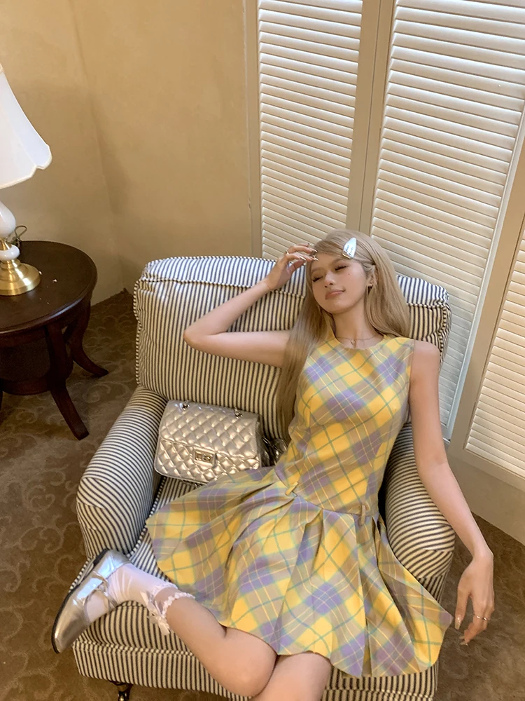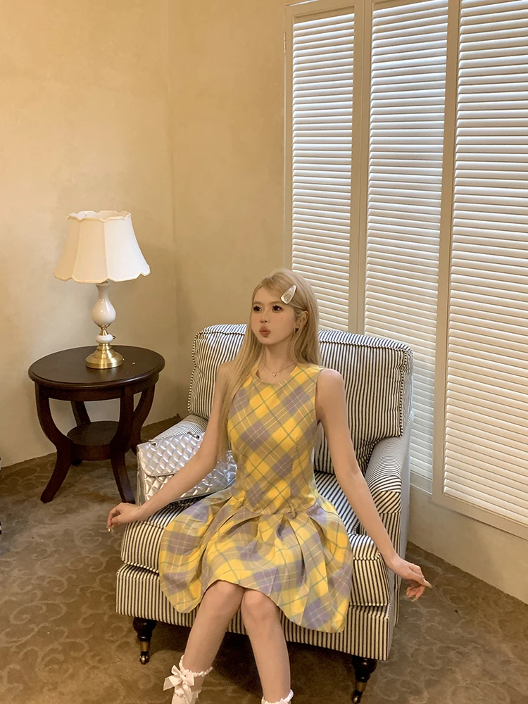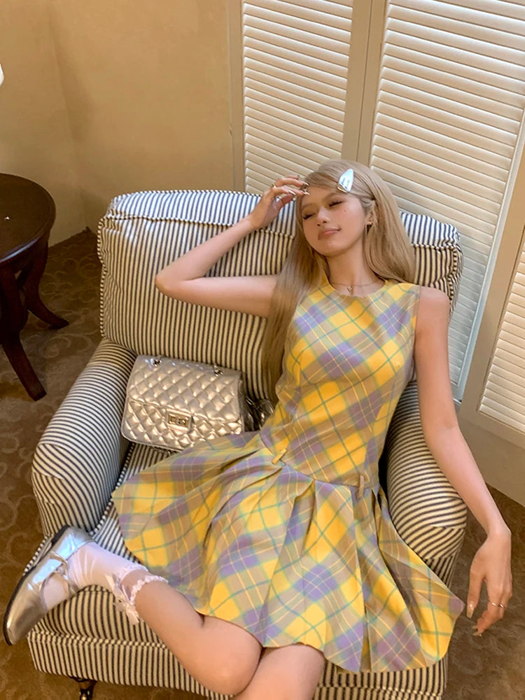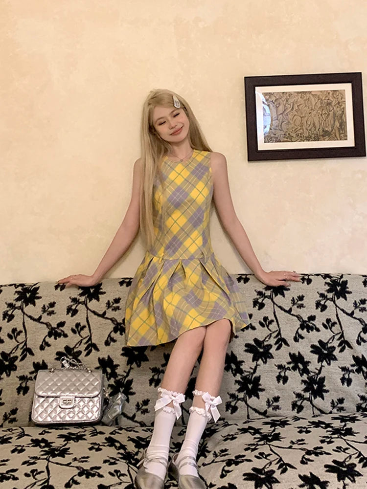 MQTIME - Streetwear Yellow Palid A-Line Dress Design Sleeveless Fairy Dress Vintage Classical Plaid Prom Gown Fashion Office Lady