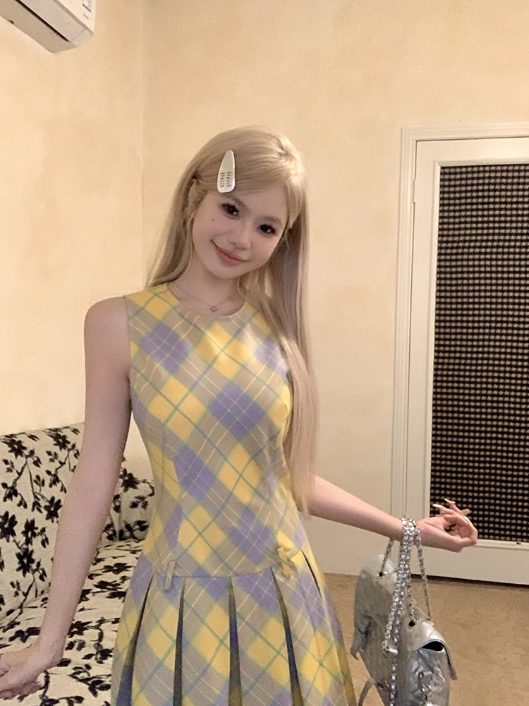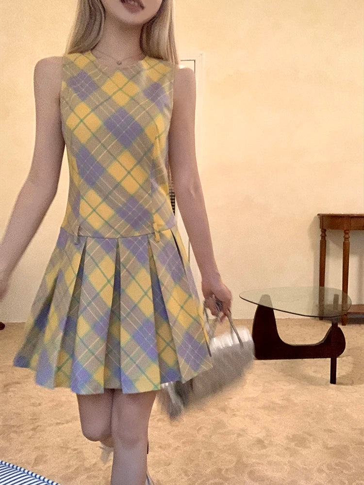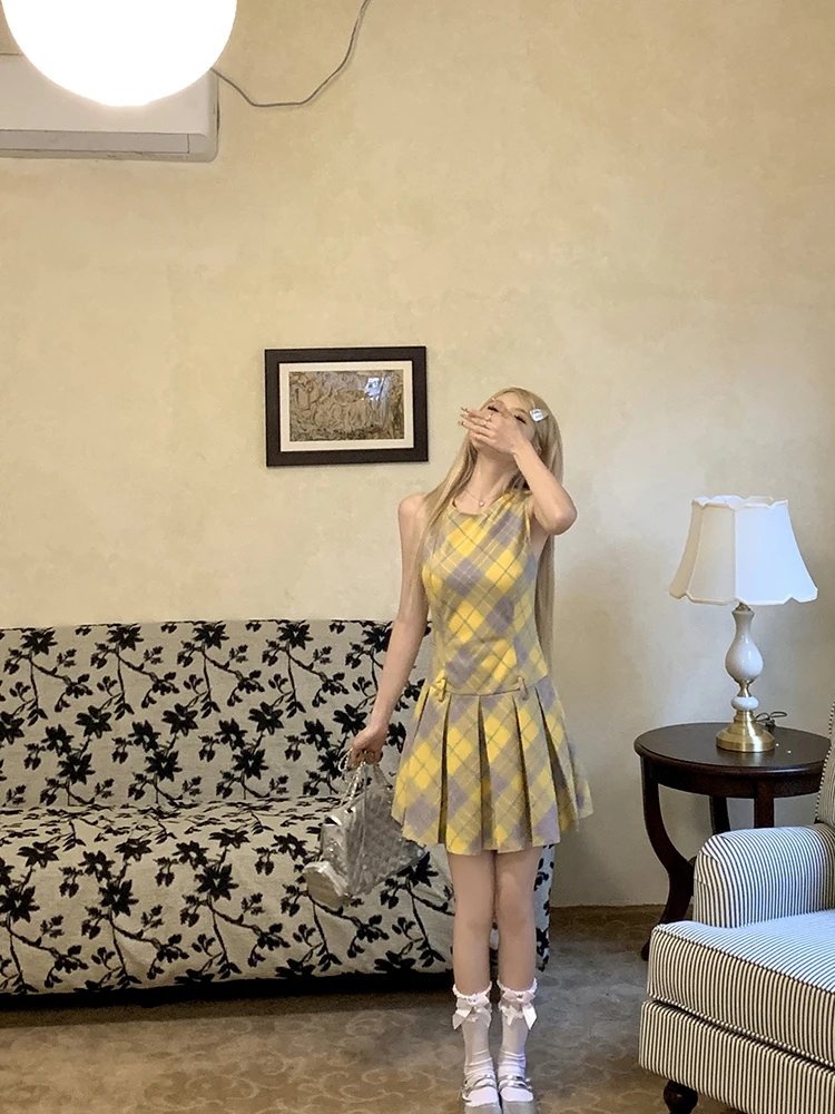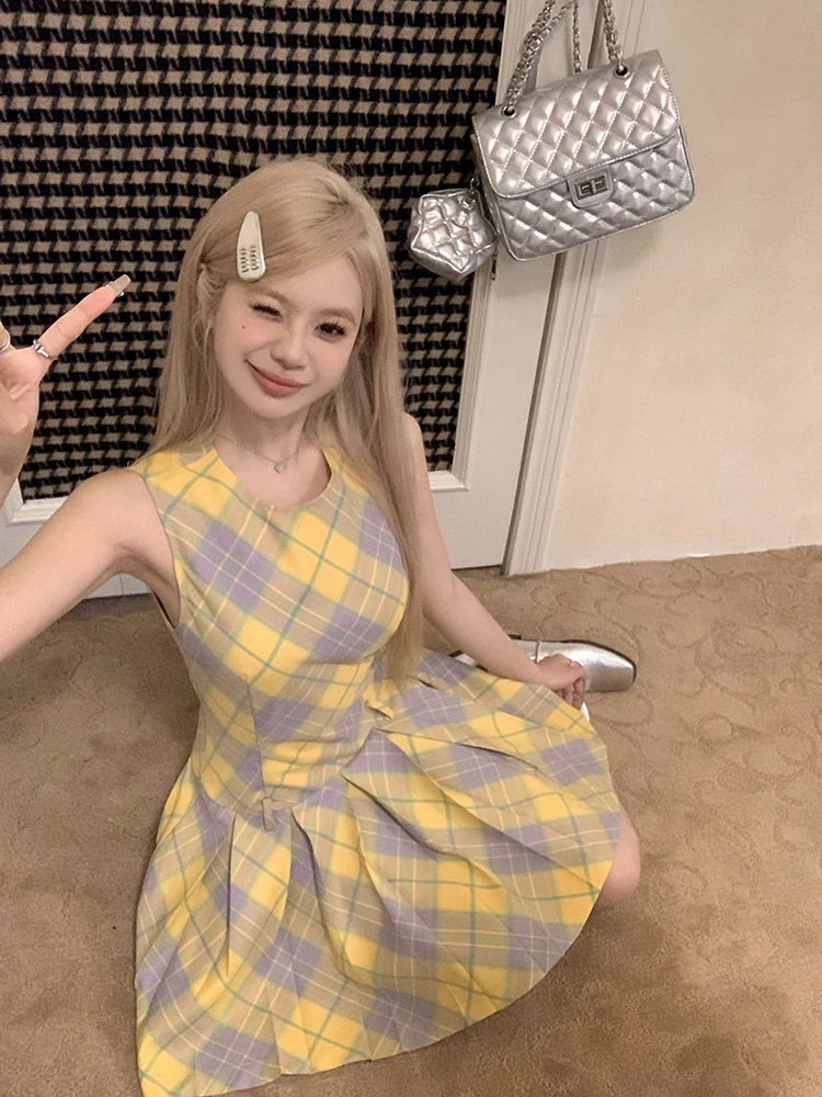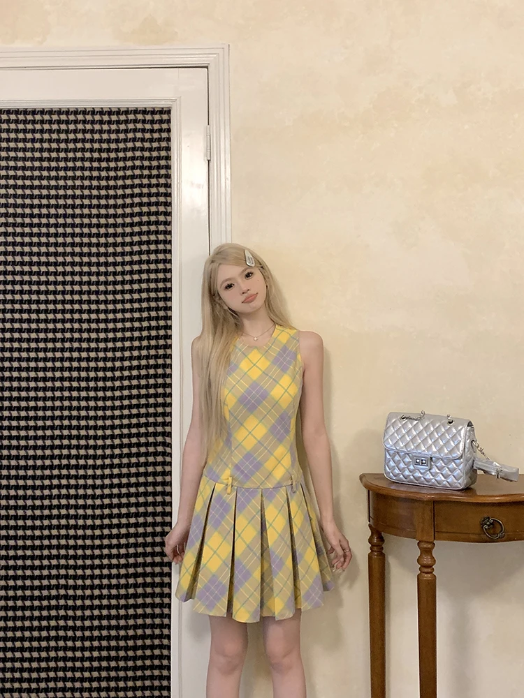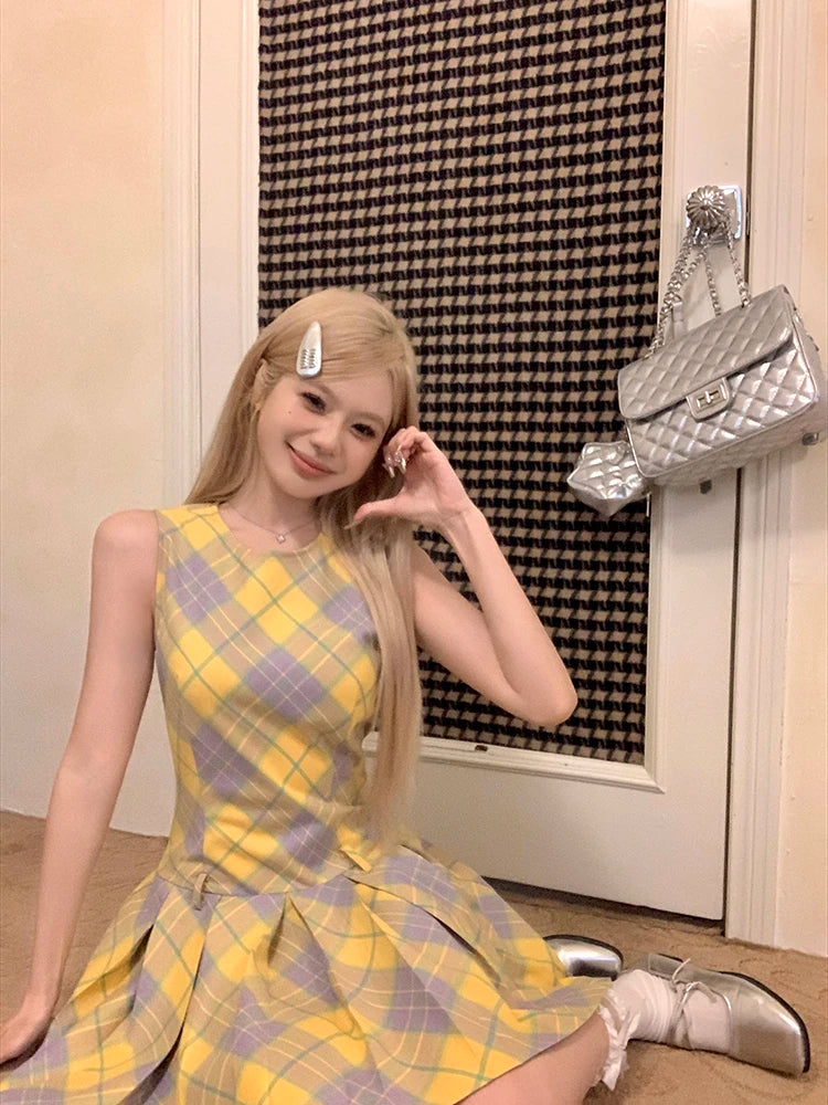MQTIME - Streetwear Yellow Palid A-Line Dress Design Sleeveless Fairy Dress Vintage Classical Plaid Prom Gown Fashion Office Lady