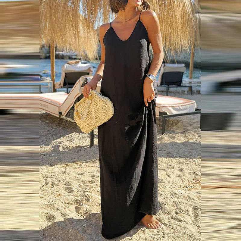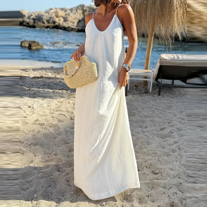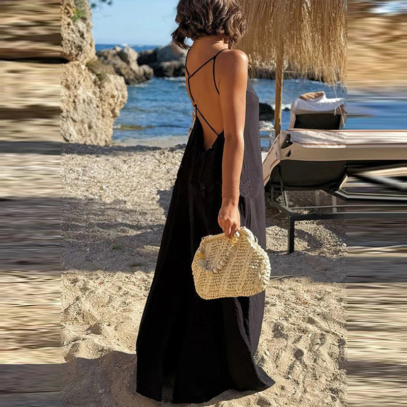 MQTIME - Stylish Leisure Backless Sleeveless Long Sling Dresses Summer Holiday Solid Color Beach Dress Women Casual Simple Camisole Dress