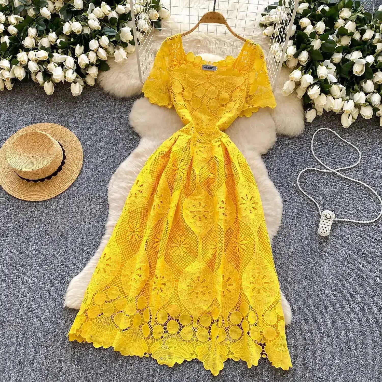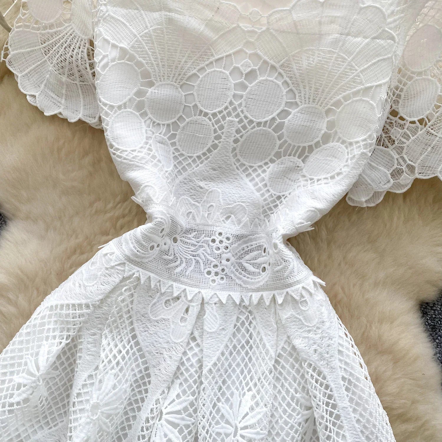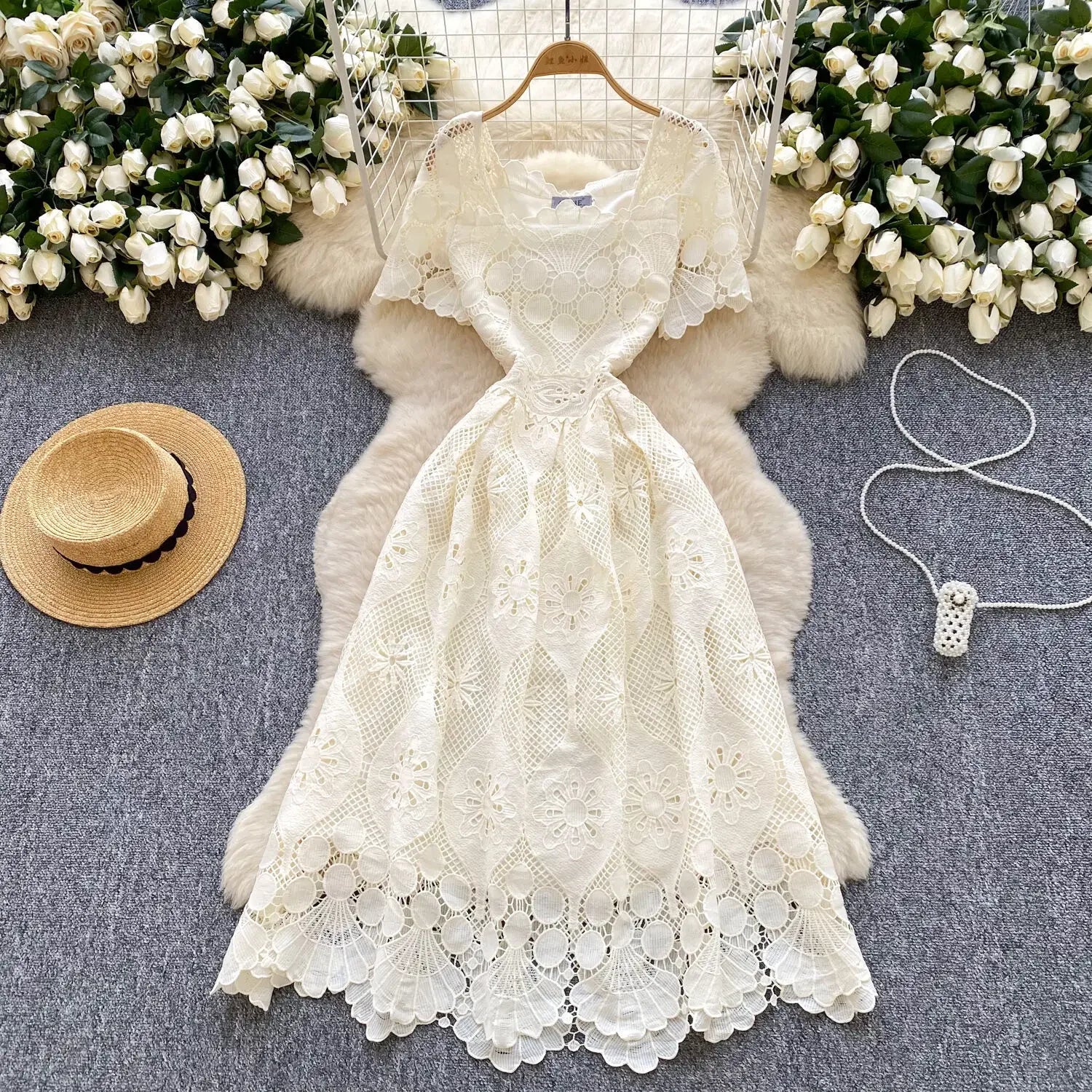 MQTIME - Summer Elegant Hollow Out Embroidery Lace Long Dresses Women Holiday Short Sleeve Flower Retro Evening Party Female Vestidos