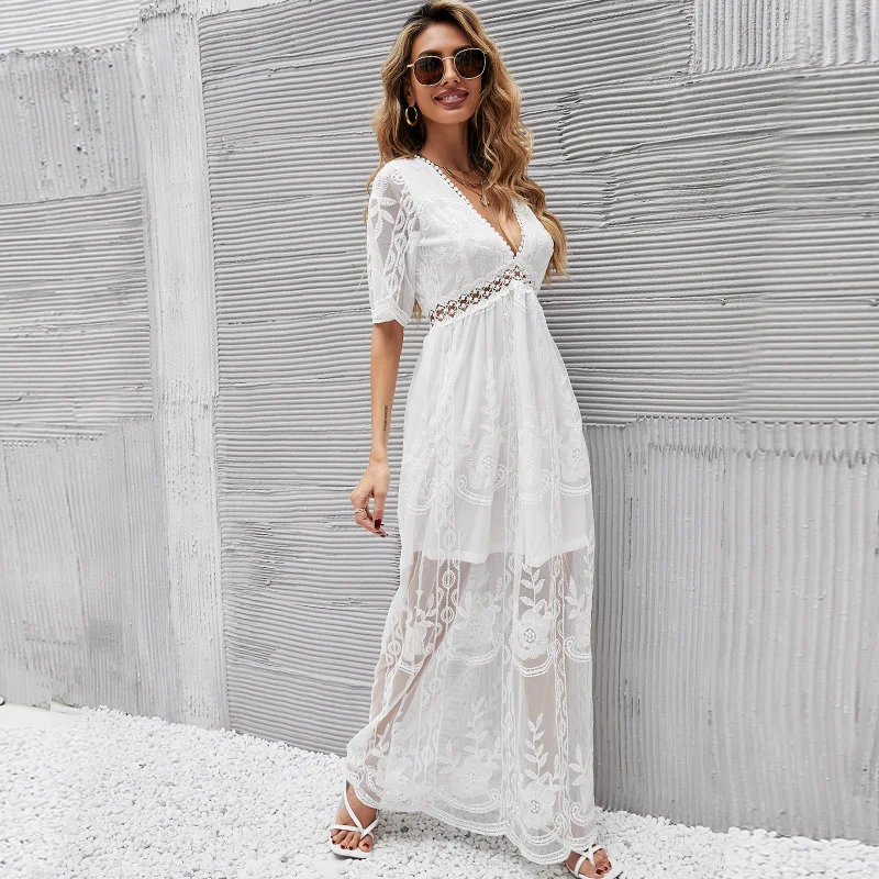 MQTIME - Summer Lace Maxi Dress V Neck Short Sleeve Embroidery Elegant Vestidos Vacation White Floor Length Dress Party Robes