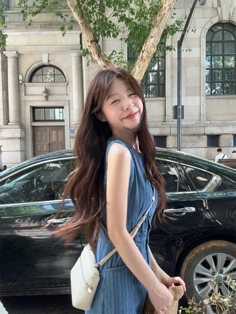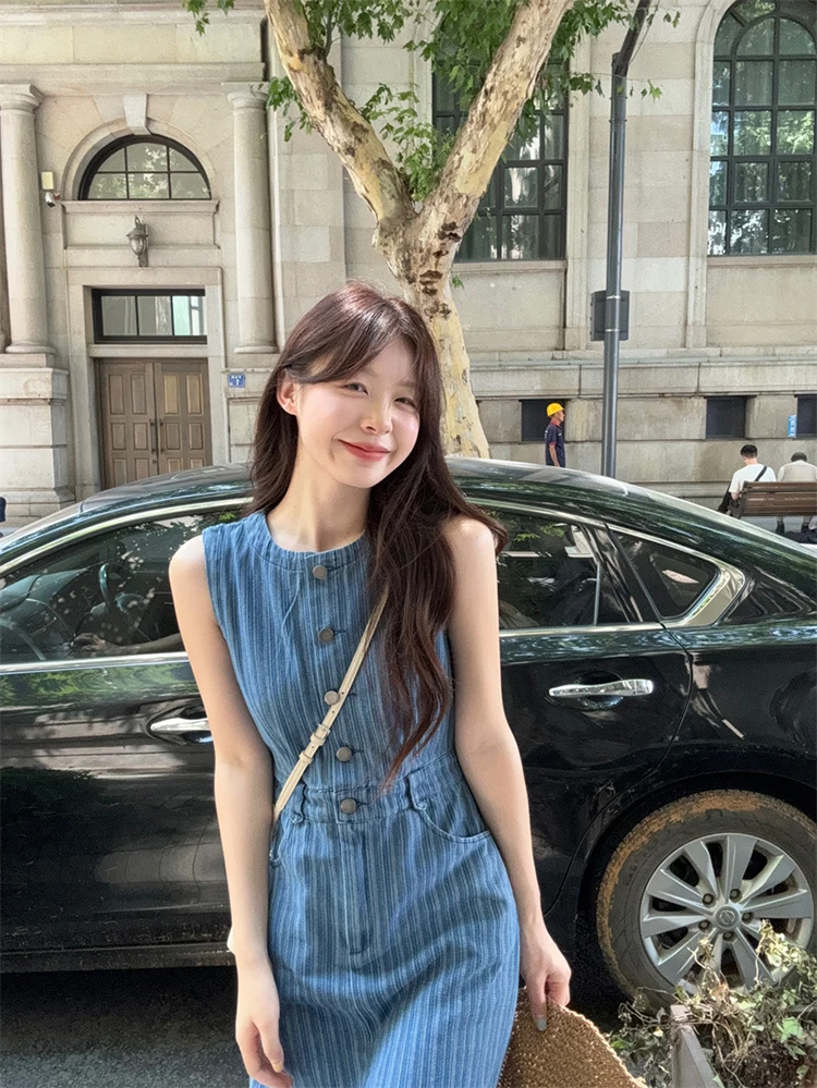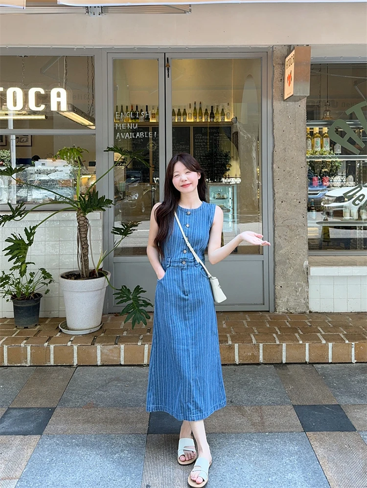 MQTIME  -  Summer Long denim Dress Women's Korean V-neck Sleeveless Stripe Printed High Waist A-line Dress