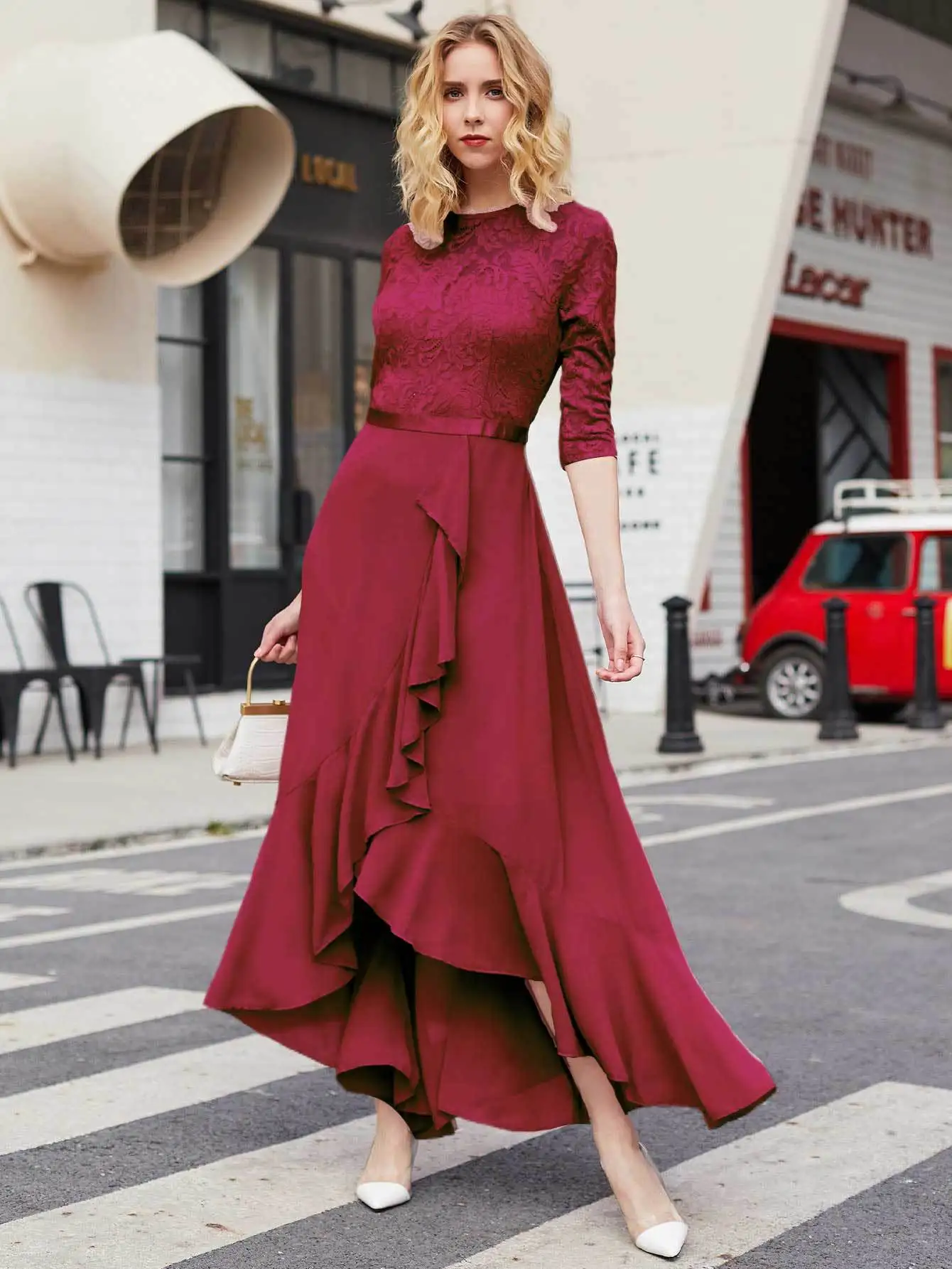 Mqtime Summer Maxi Dress Women Clothing Birthday Party Solid Color Lace Chiffon Dresses Women's Irregular Cascading Ruffle Femme Robe