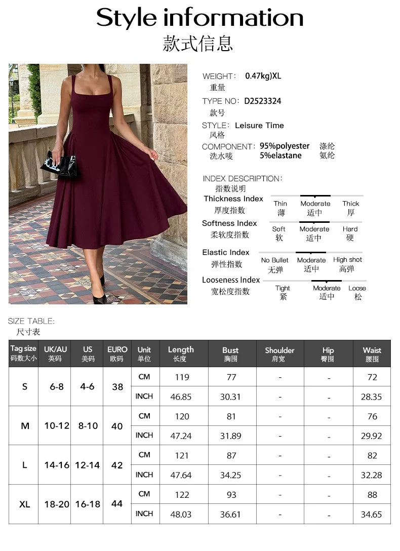MQTIME - Summer New French Square Neck Women Elegant Strap Dress Simple Solid Color Female Banquet Grand Display Long Dresses