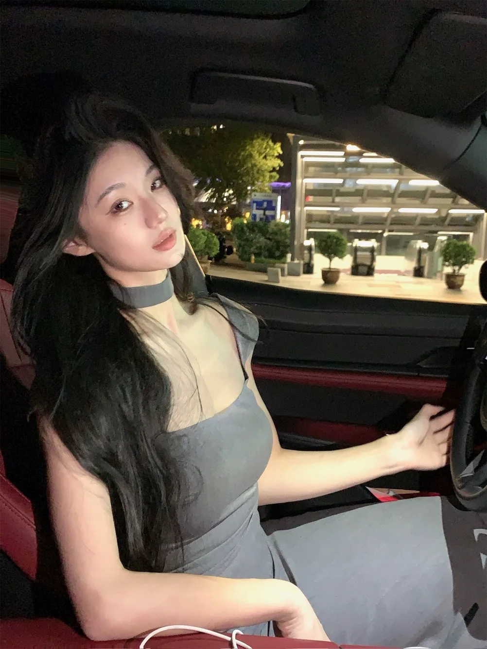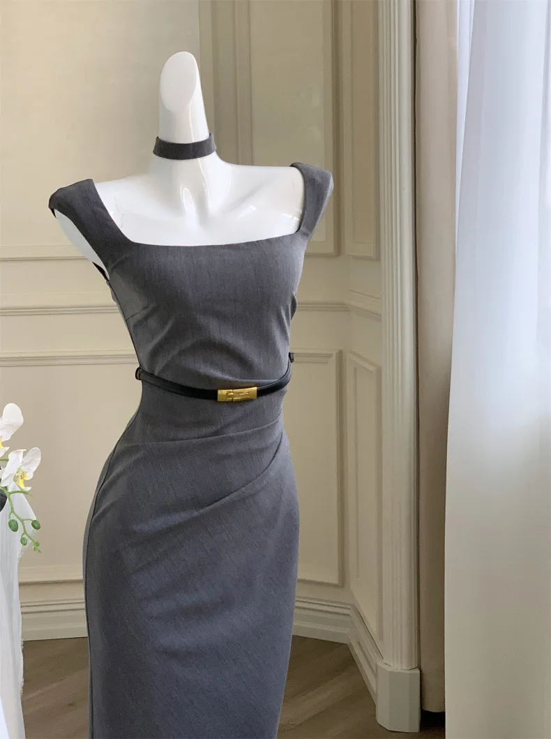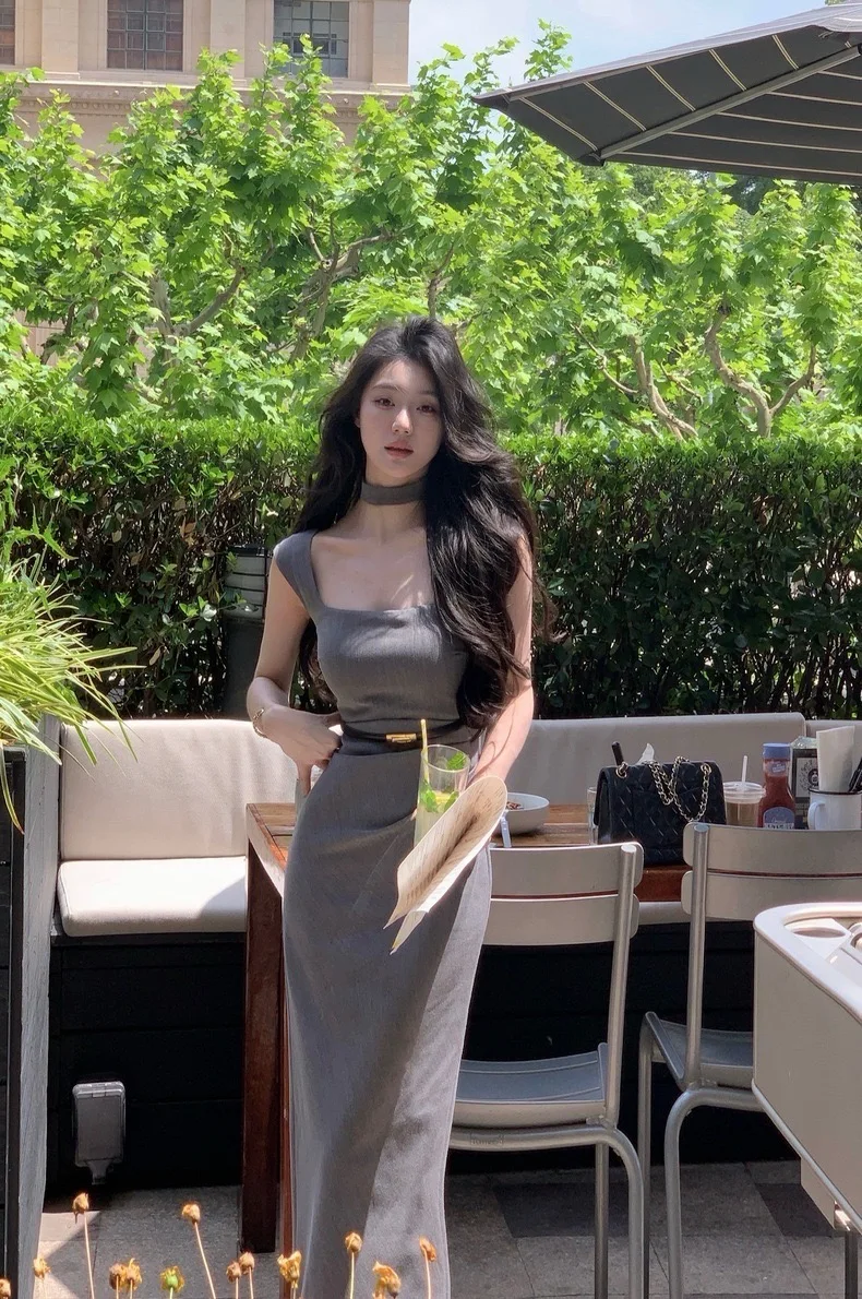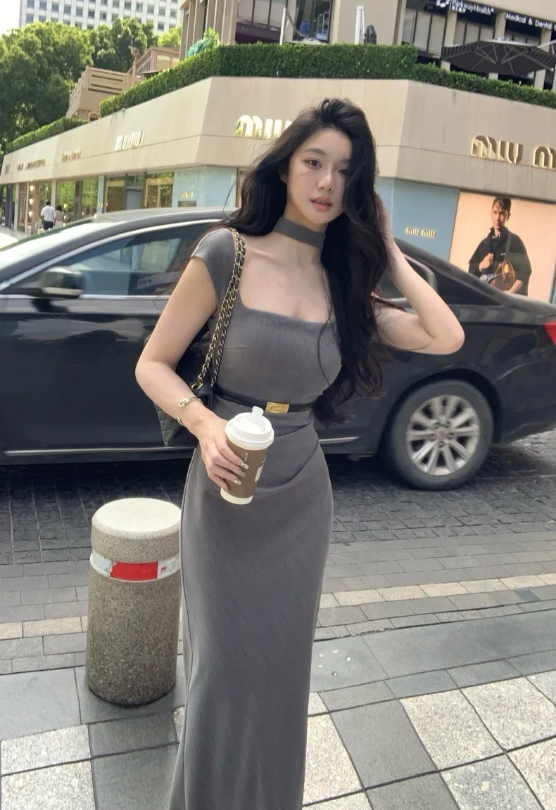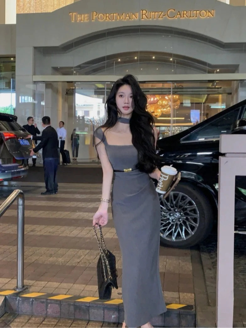 MQTIME - Summer New Korean Elegant Sex Appeal Dresses Simple Solid Color Evening Party Prom Vestidos Women Chic One Piece Clothing