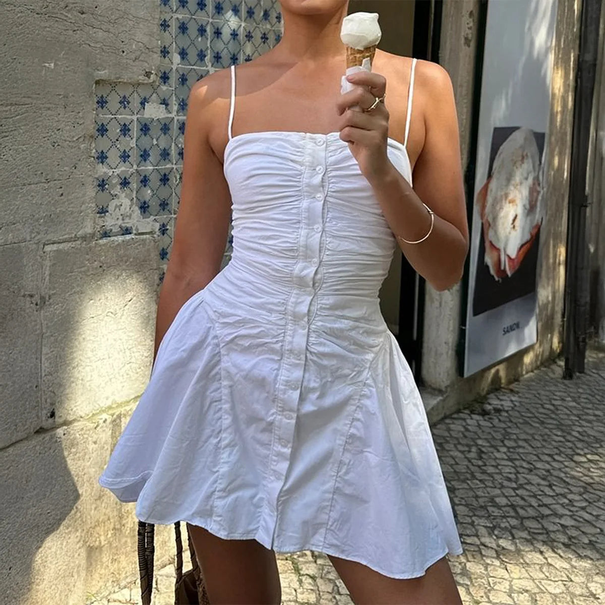 MQTIME - Summer New Simple Solid Color Women Strap Short Dress Fashion Square Collar Female Button Dresses