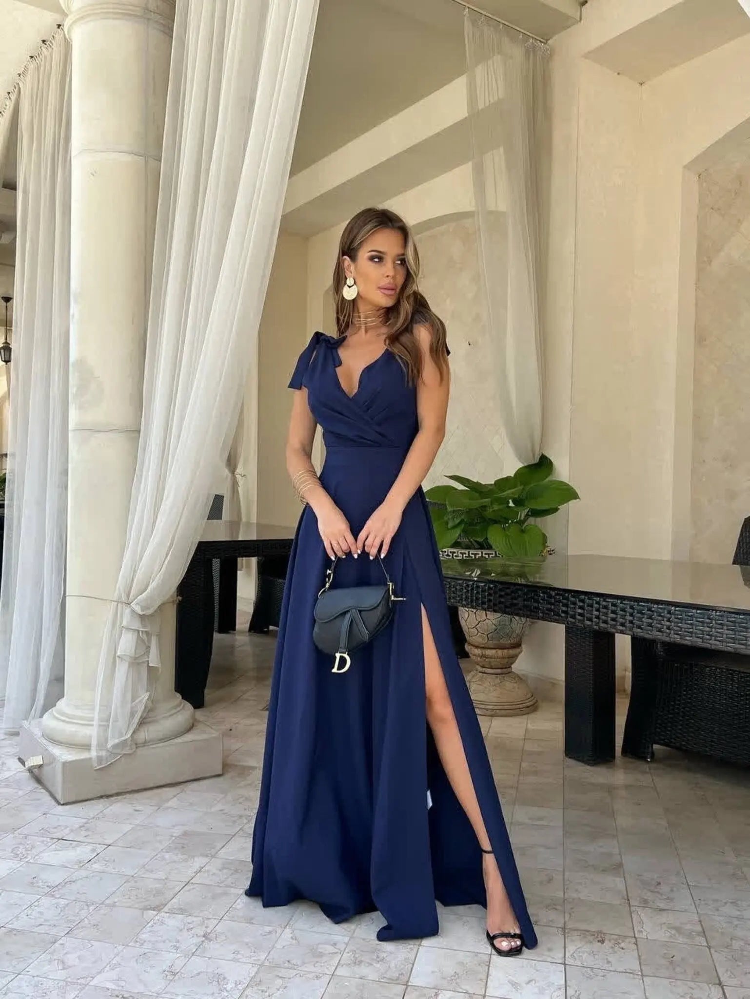 MQTIME  -  Summer Women Party Dress High Waist Cross V-neck Bowknot Strap X-long Evening Dress Female Side Split Elegant Lady Maxi Dresses