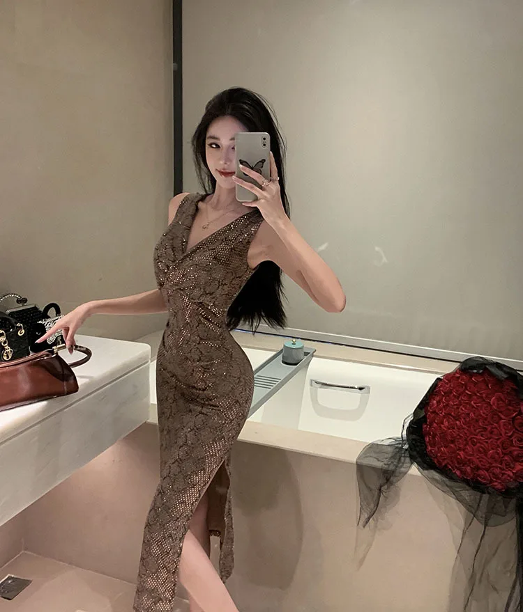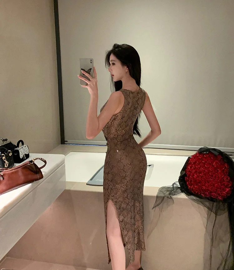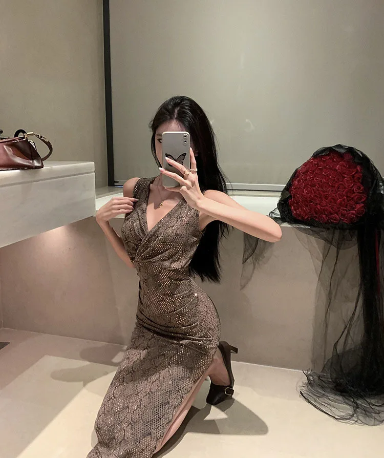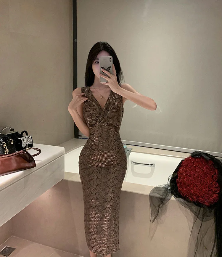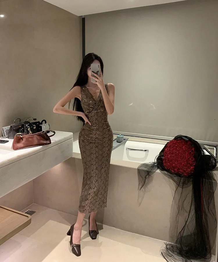 MQTIME - Summer Women Sequined Tank Dress New Sexy V Neck Sleeveless Printed Slim Fit Bodycon Evening Party Long Dress Robe