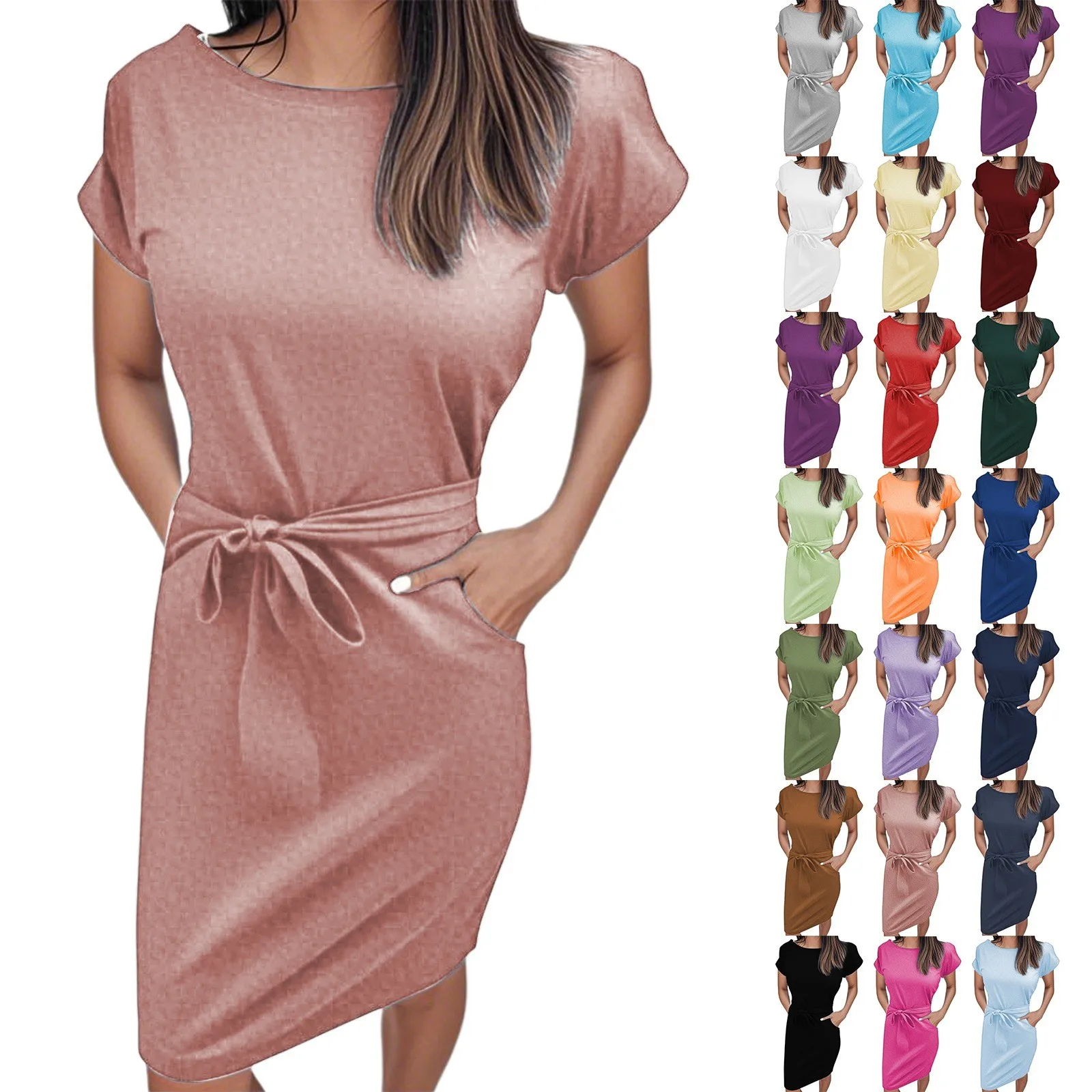 MQTIME - Summer Women Versatile Dress With Belt Casual Short Sleeve Round Neck Fashionable Dress Outfits Holiday Midi Sundress Vestidos