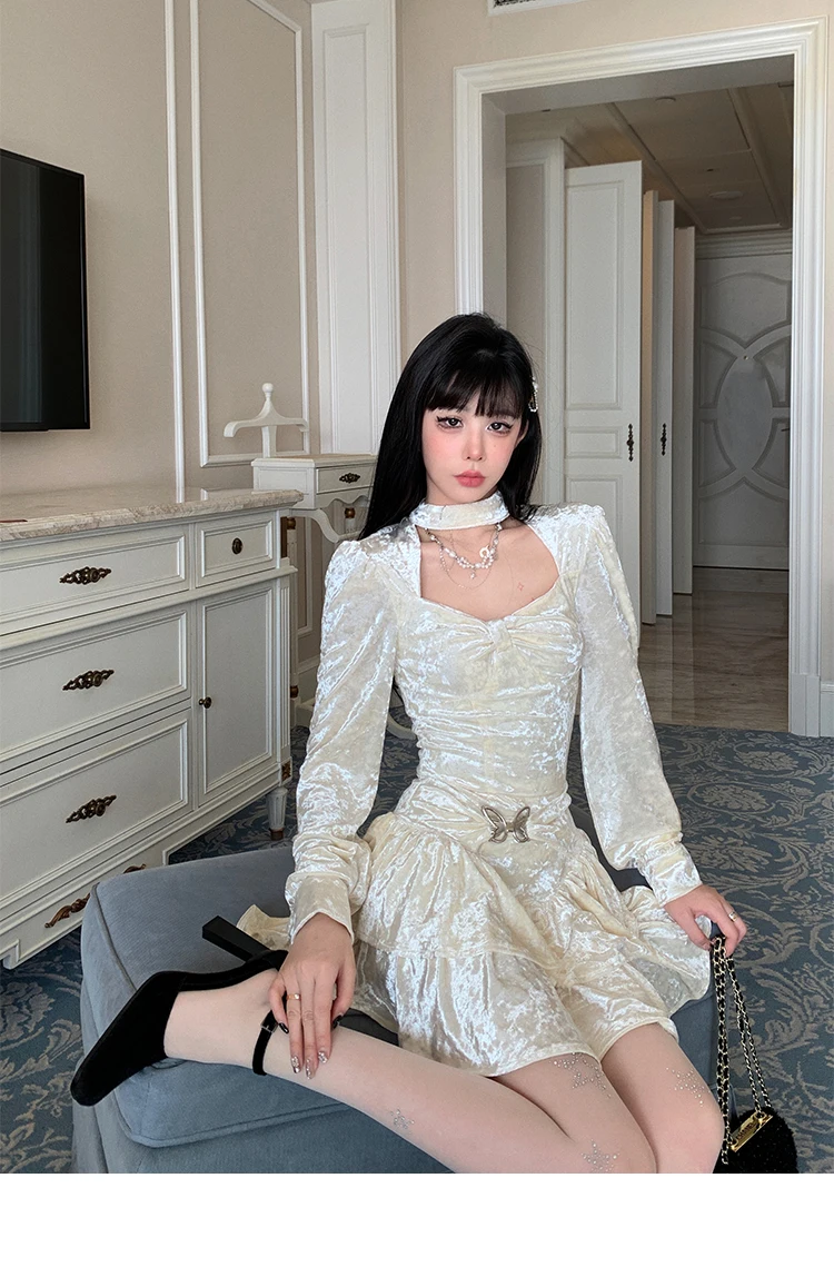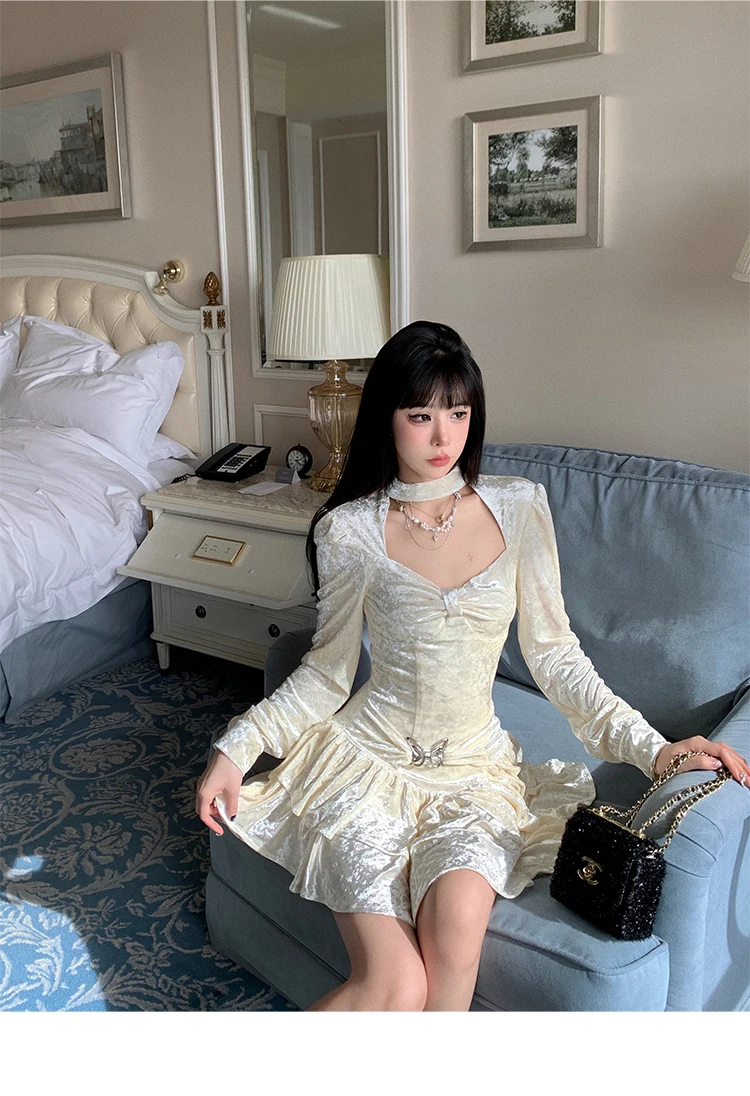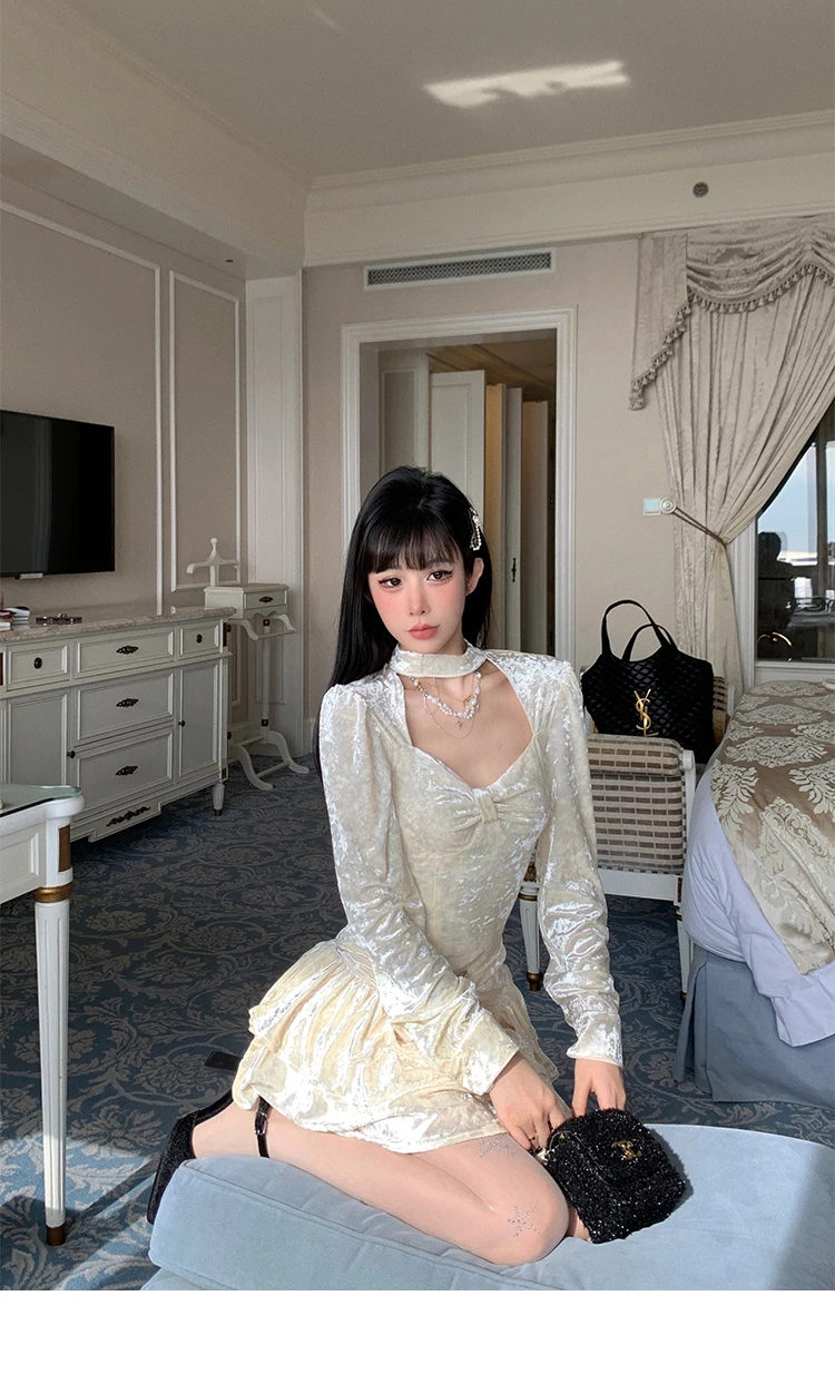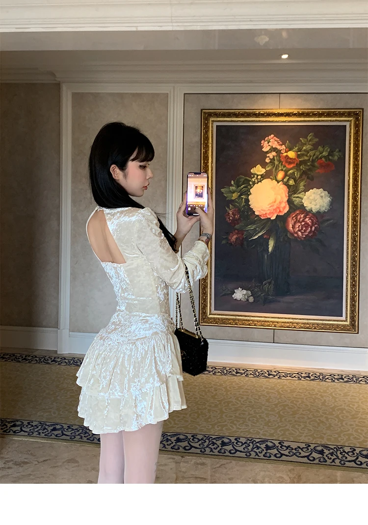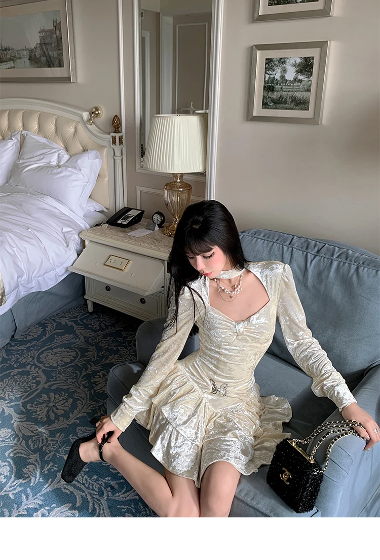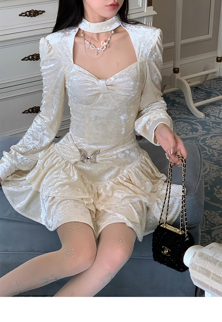Mqtime Sweet Solid Velvet Mini Dress Women Square Collar Long Sleeve Halter Autumn Winter A-line Cake Dresses Birthday Party Vestidos