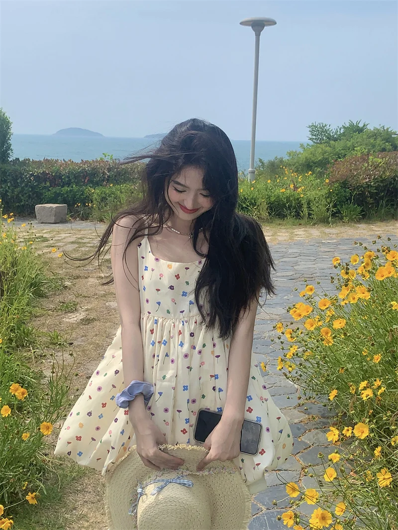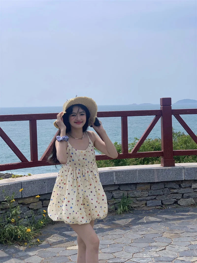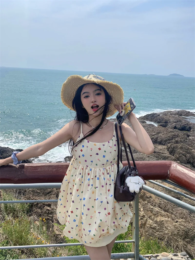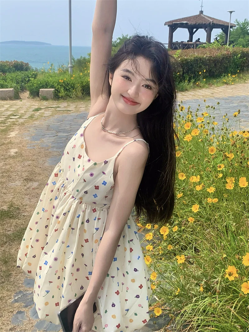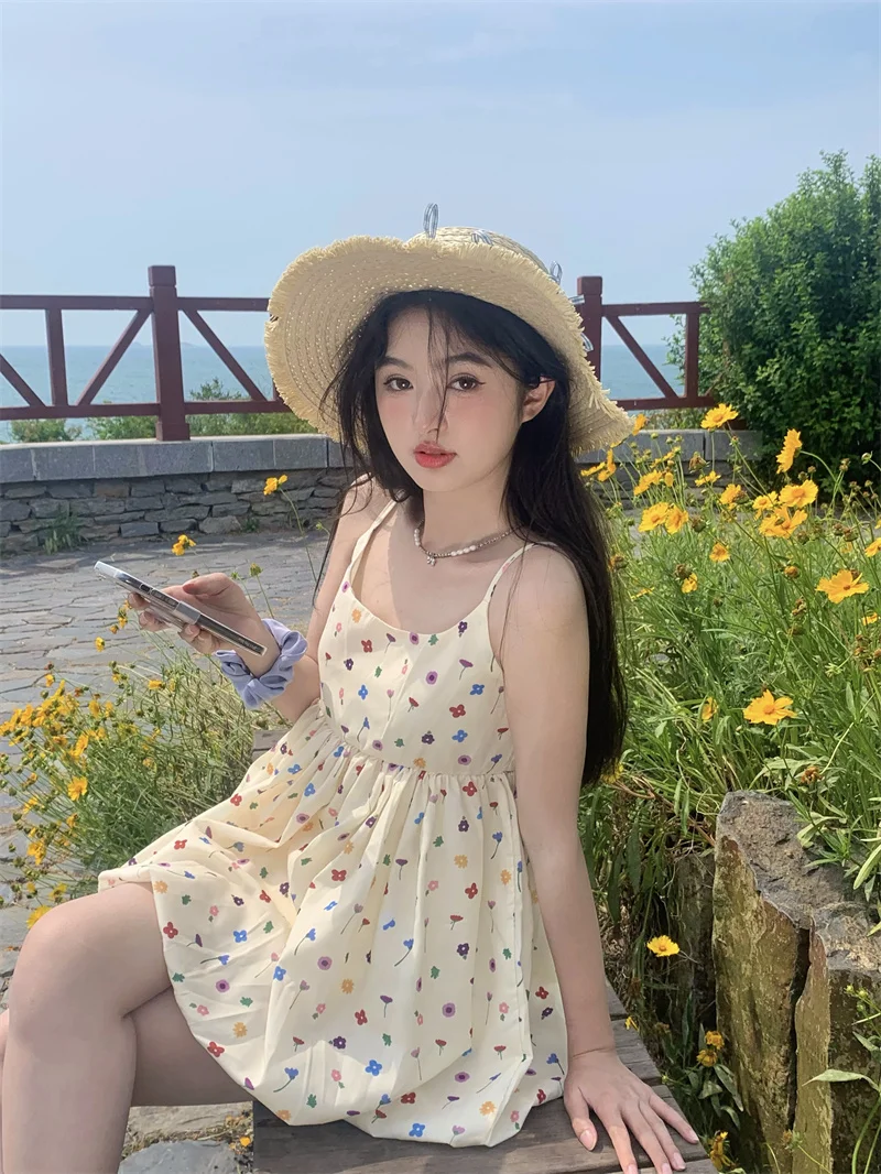 MQTIME - Sweet Young Lady Summer Bud Dress Fashion Printing Women's Strap Dress High Waist Sleeveless Female Floral Dress Holiday Clothes