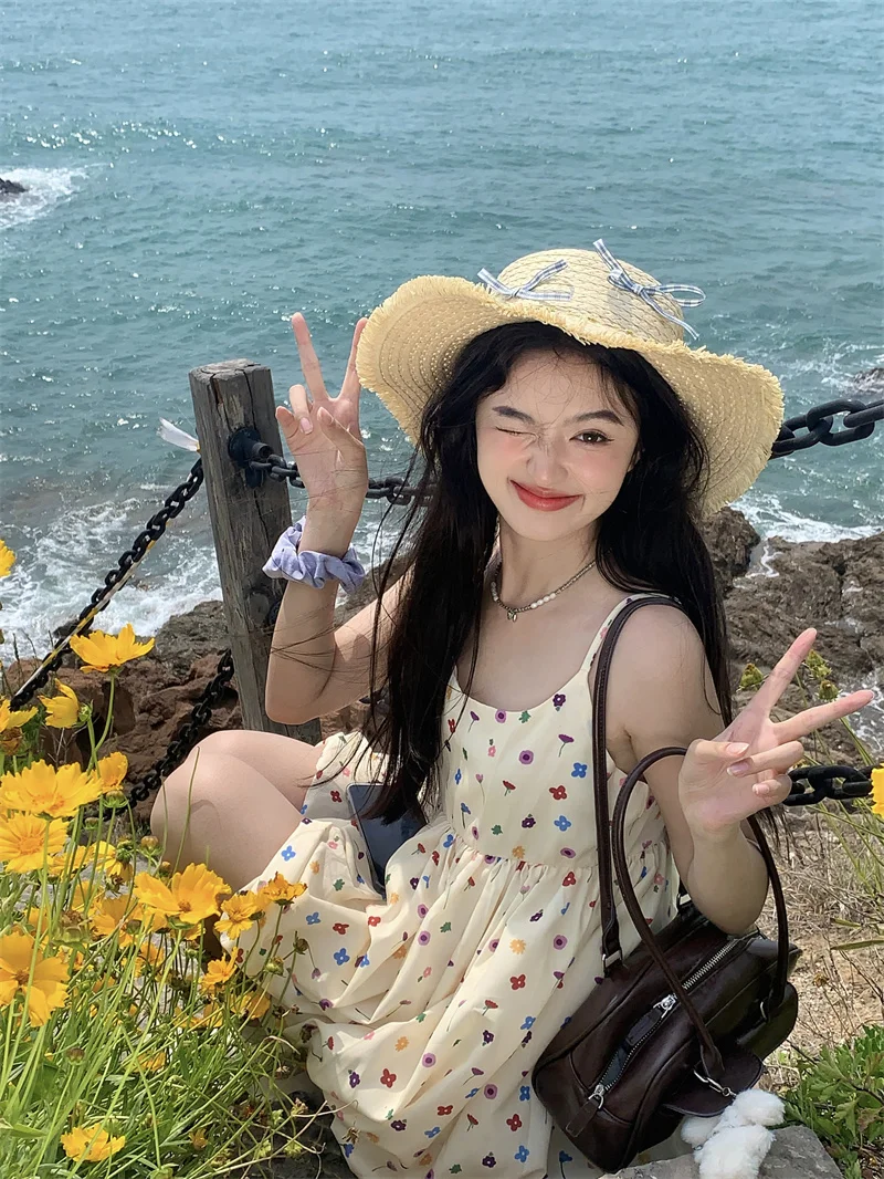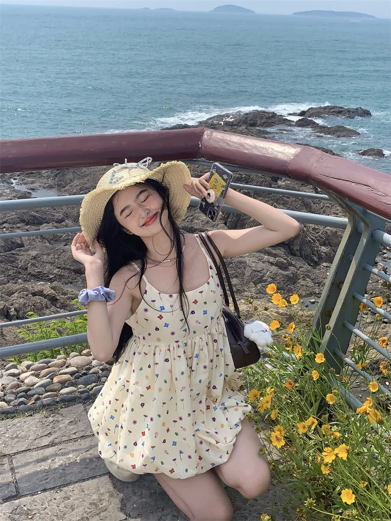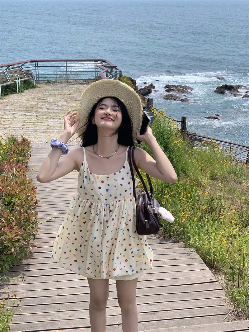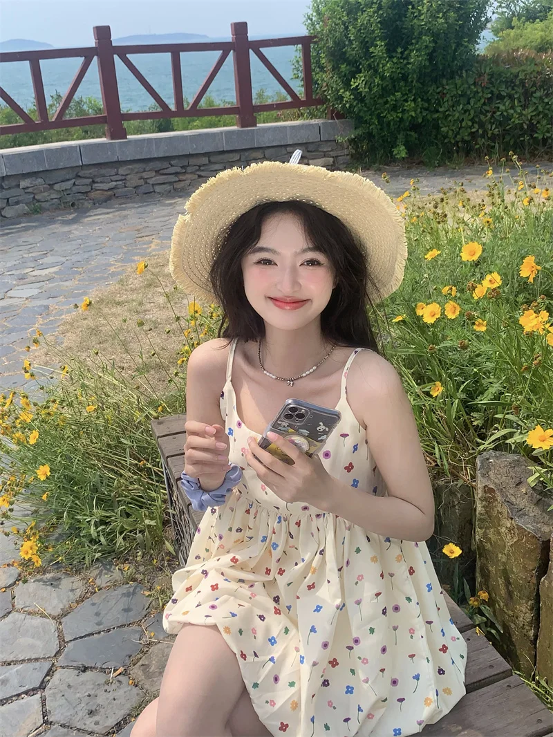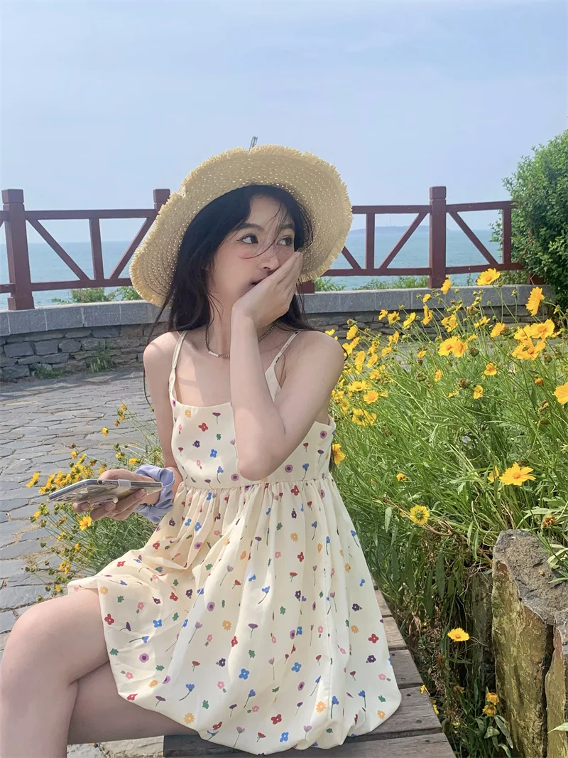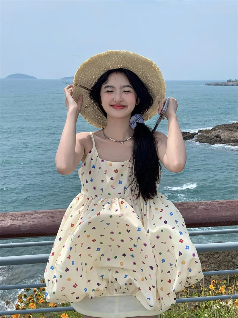 MQTIME - Sweet Young Lady Summer Bud Dress Fashion Printing Women's Strap Dress High Waist Sleeveless Female Floral Dress Holiday Clothes