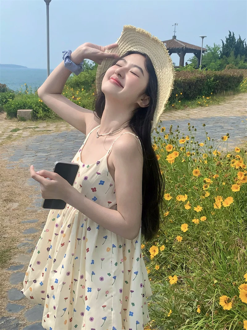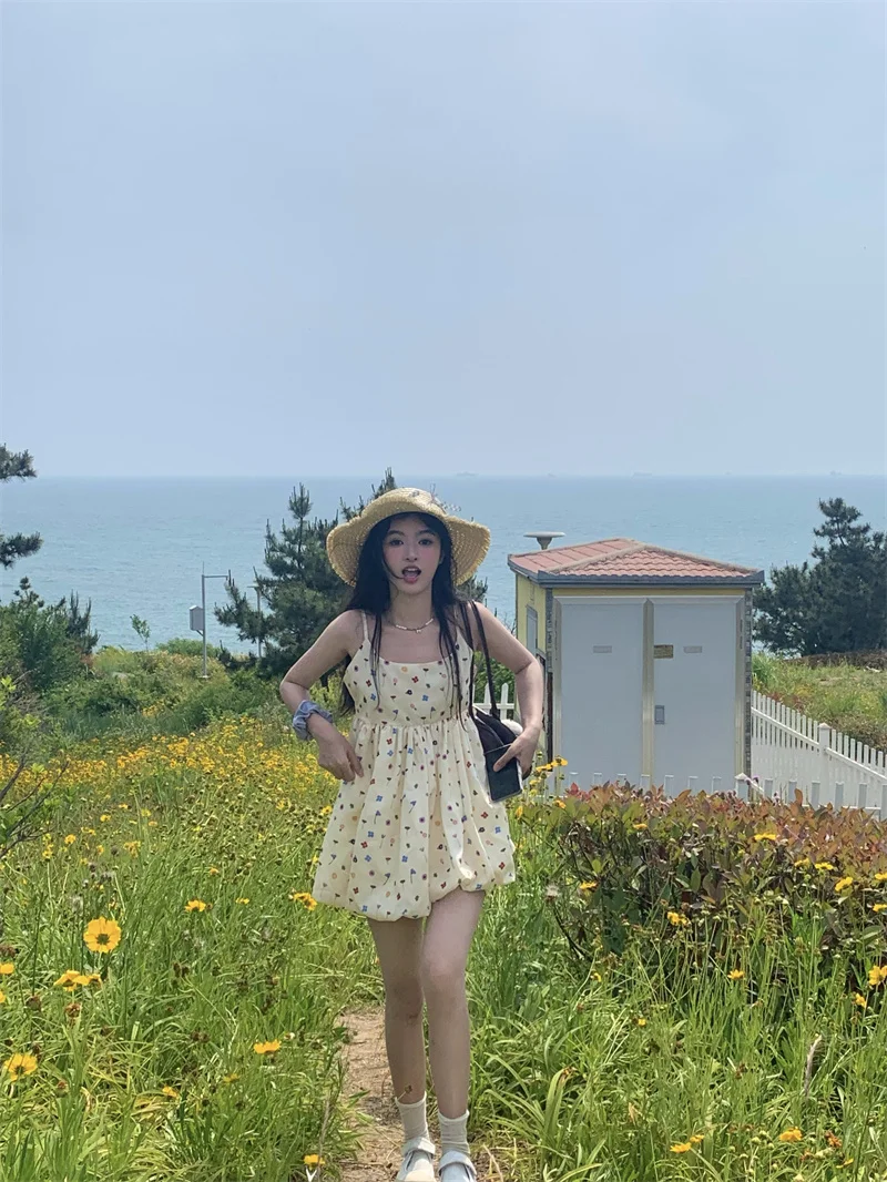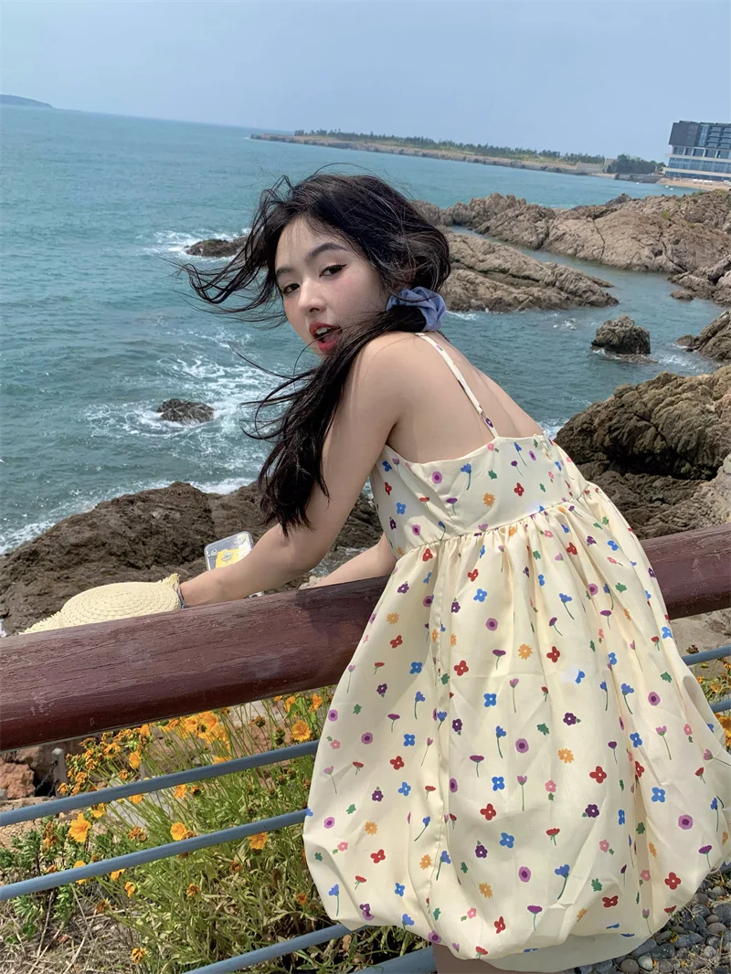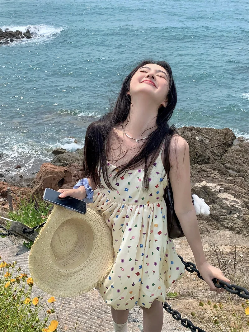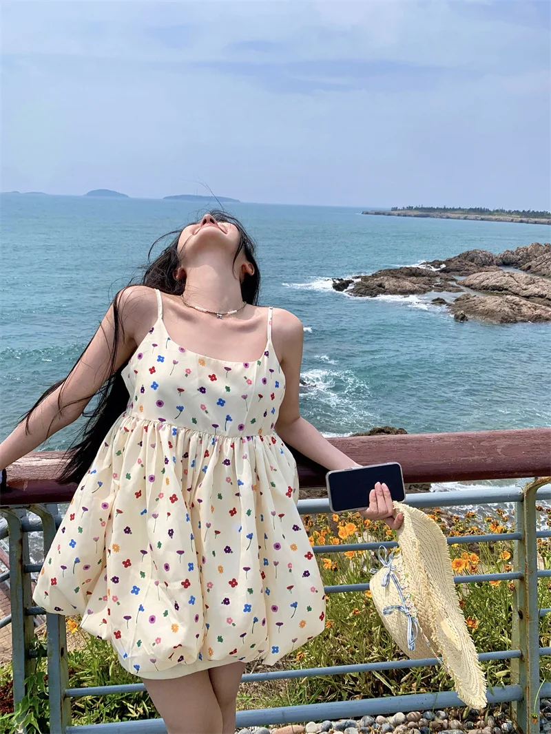 MQTIME - Sweet Young Lady Summer Bud Dress Fashion Printing Women's Strap Dress High Waist Sleeveless Female Floral Dress Holiday Clothes