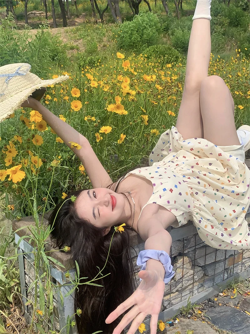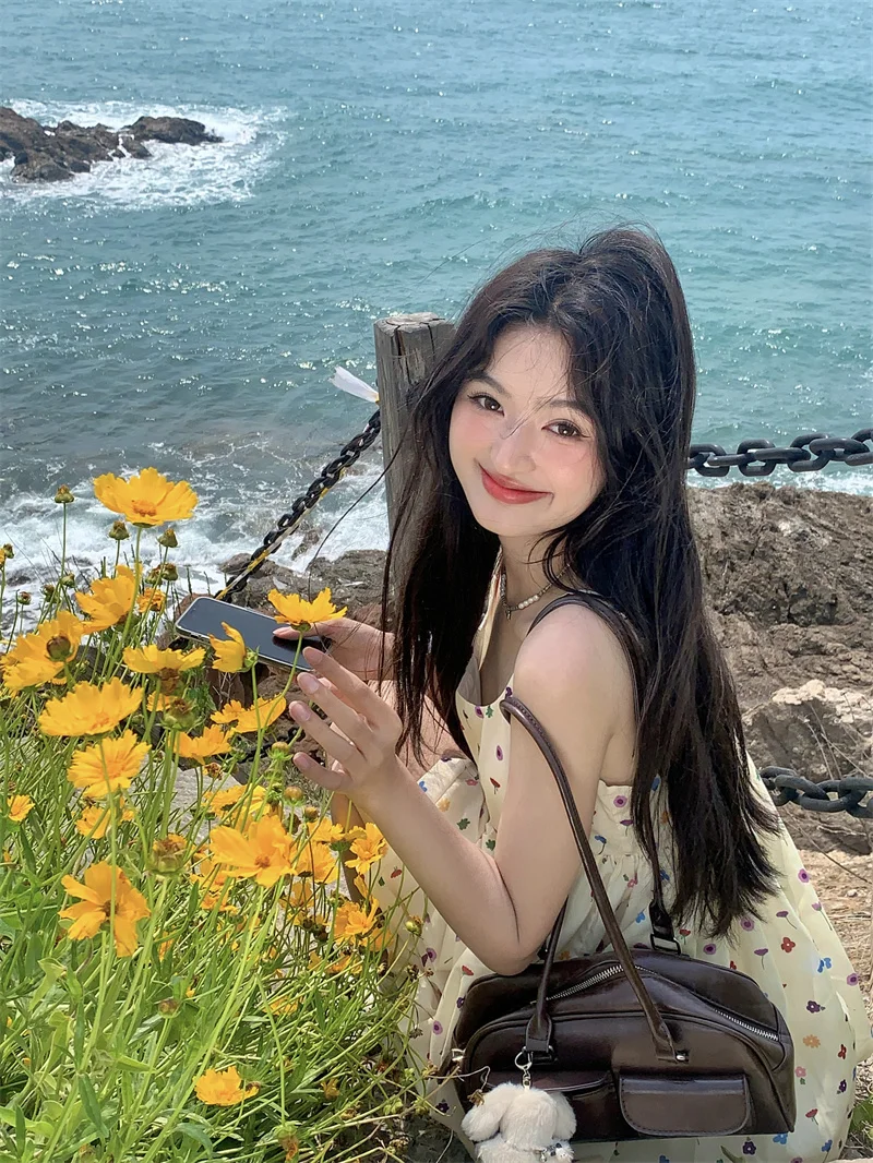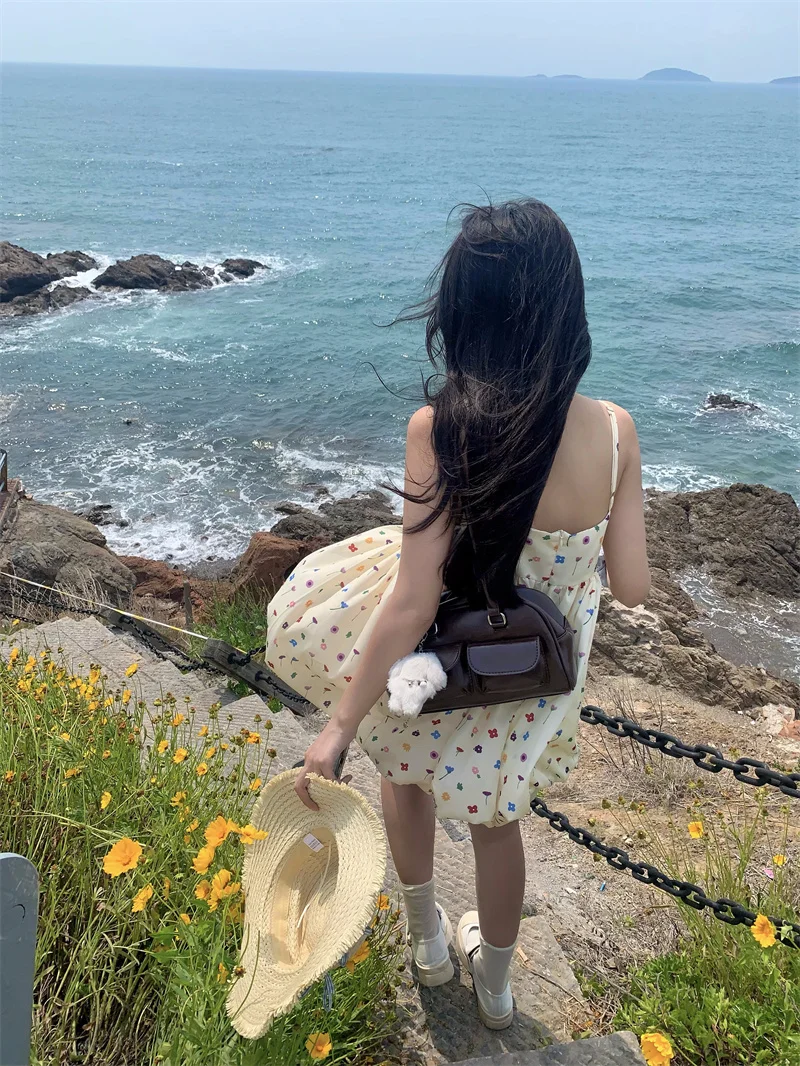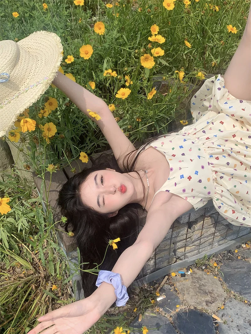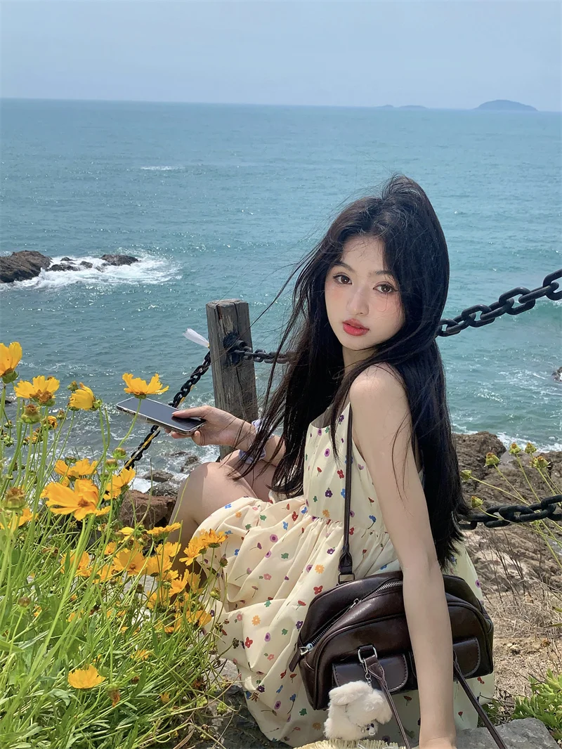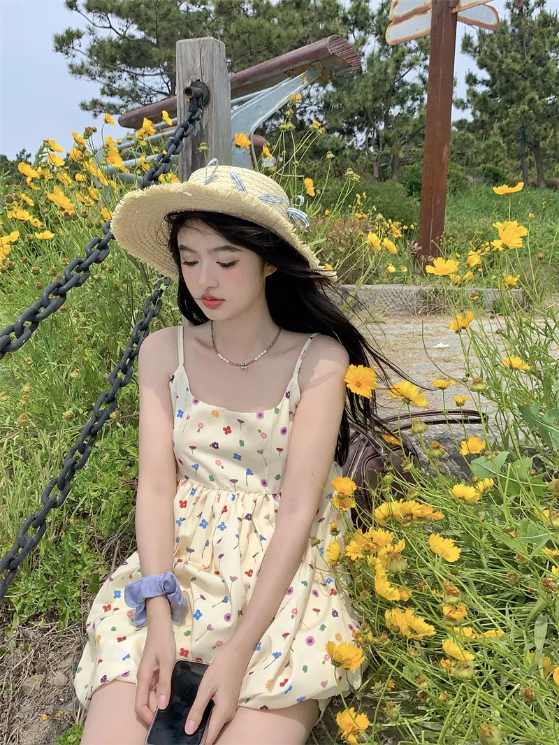 MQTIME - Sweet Young Lady Summer Bud Dress Fashion Printing Women's Strap Dress High Waist Sleeveless Female Floral Dress Holiday Clothes