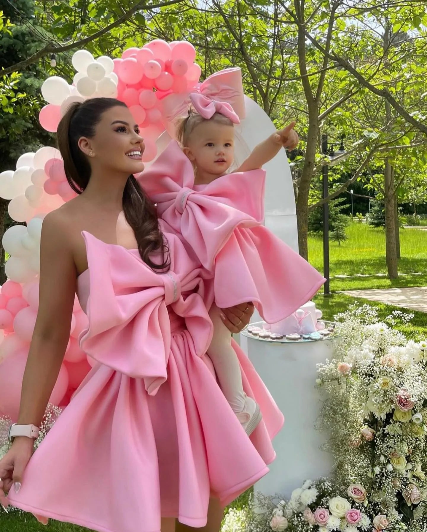 MQTIME - Sweety Cute Light Pink Bow Short Women Dresses To Birthday Party Strapless Big Bow A-line Mini Maxi Dress