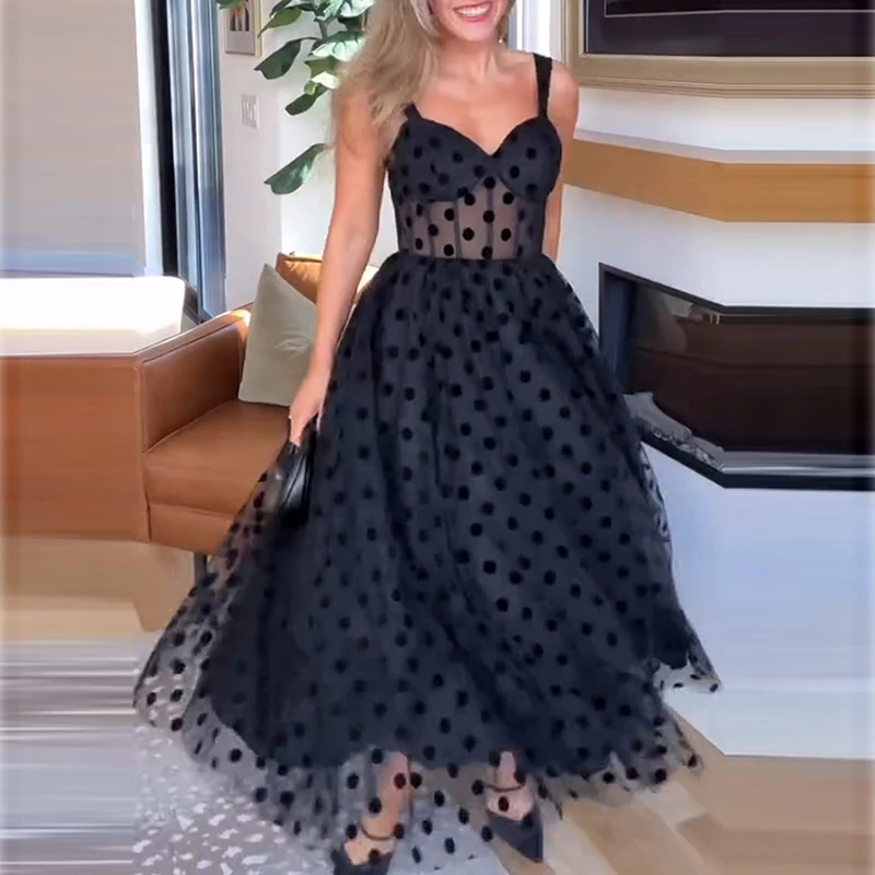 MQTIME - Temperament Polka Dot Slim Long Dress Women Patchwork High Waist Party Dress New Luxury Mesh Suspender Folds A-line Dress