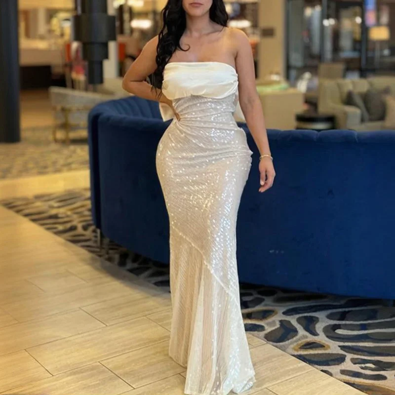 MQTIME - Temperament Strapless Sequins Wedding Party Dress Sexy Off Shoulder Bow Decoration Slim Long Dress Lady Solid Backless Prom Gown