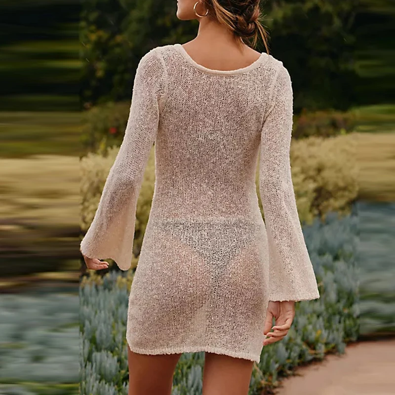 MQTIME - Twist Knitted Hollow Ups Women Fashion Solid V-Neck Crochet Pullover Dress Casual Vacation All Match Long Sleeve Mini Dress