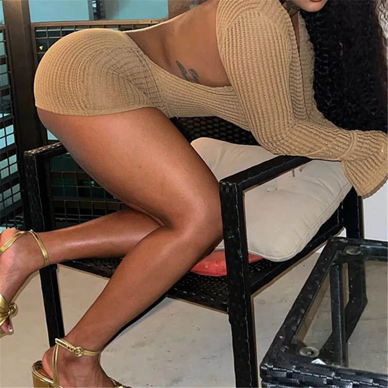 MQTIME - V Neck Backless Beach Mini Dress For Women Knitted Fishnet See Through Long Sleeve Club Sexy Elastic Casual Party Vestidos