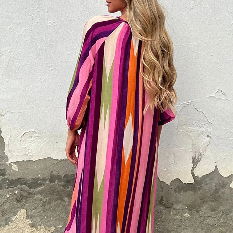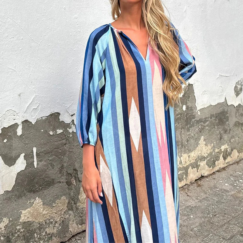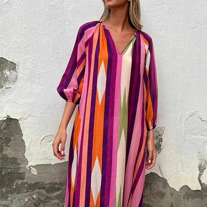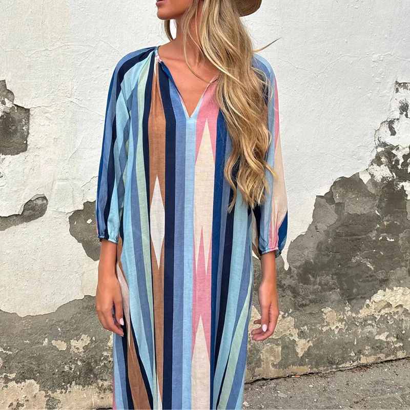 MQTIME - V-neck Long Dress With Sleeves Summer New Ladies Loose Party Dresses Vintage Pleated Stripe Printed Commuting Maxi Dresses