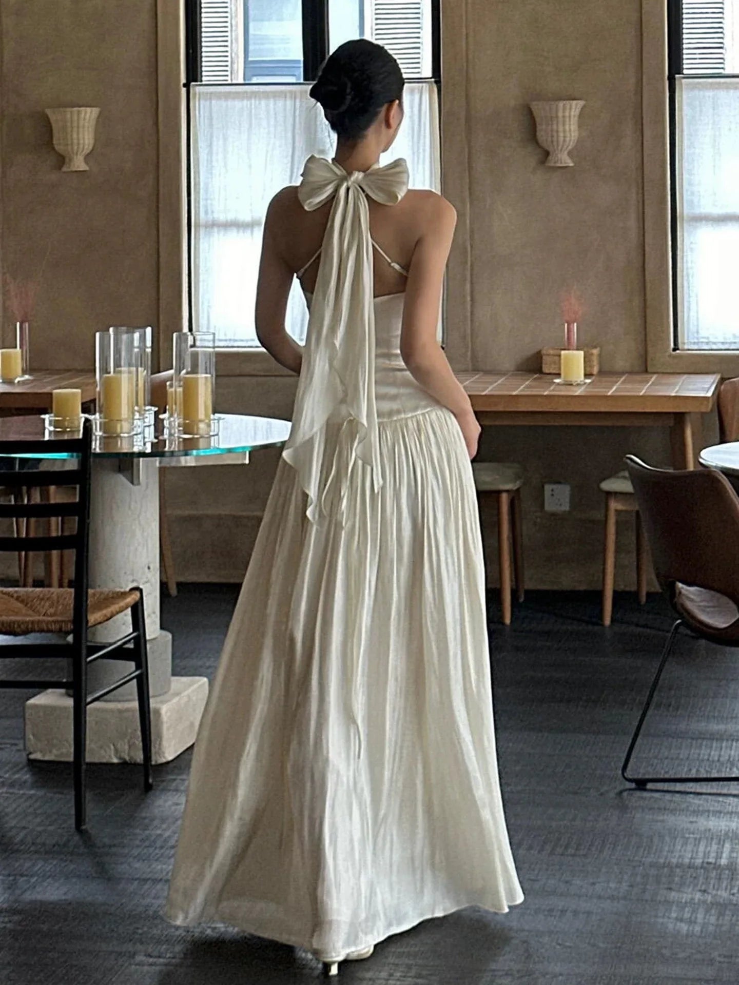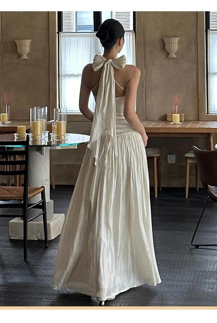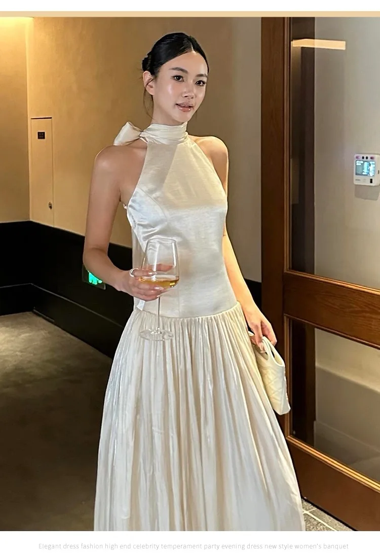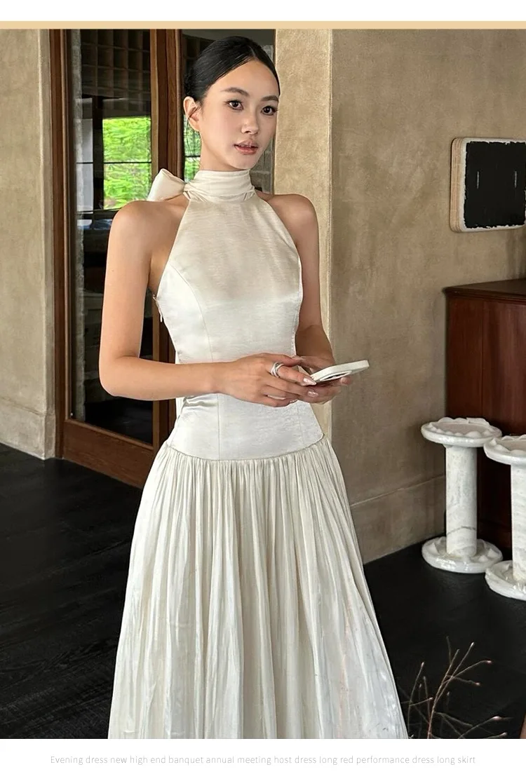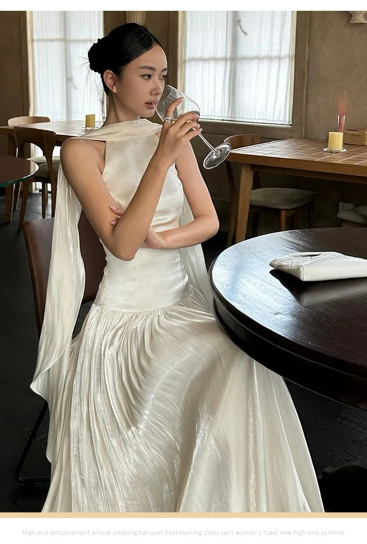MQTIME - White French Style Evening Dress Sleeveless Silk Ribbon Pleated Slim Formal Occasion Dressing Gown Wedding Bridal Toast Dress