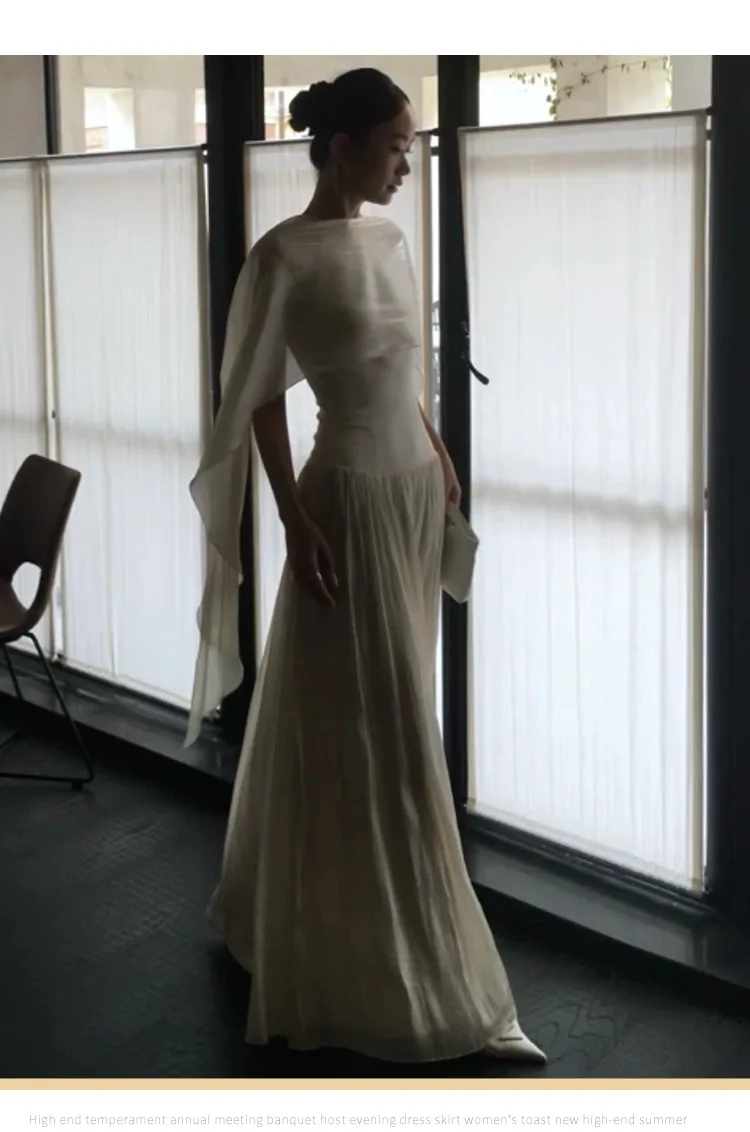 MQTIME  -  White French Style Evening Dress Sleeveless Silk Ribbon Pleated Slim Formal Occasion Dressing Gown Wedding Bridal Toast Dress