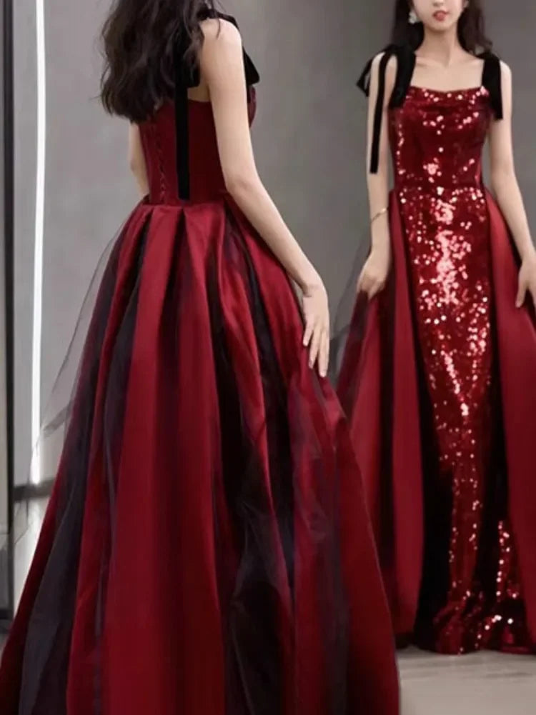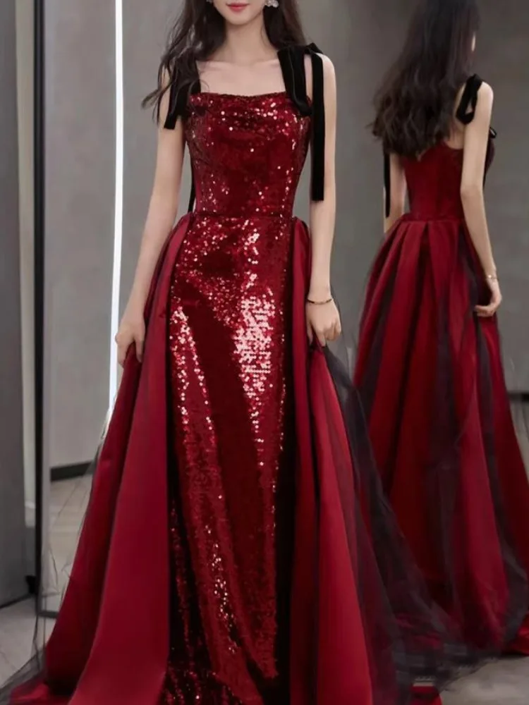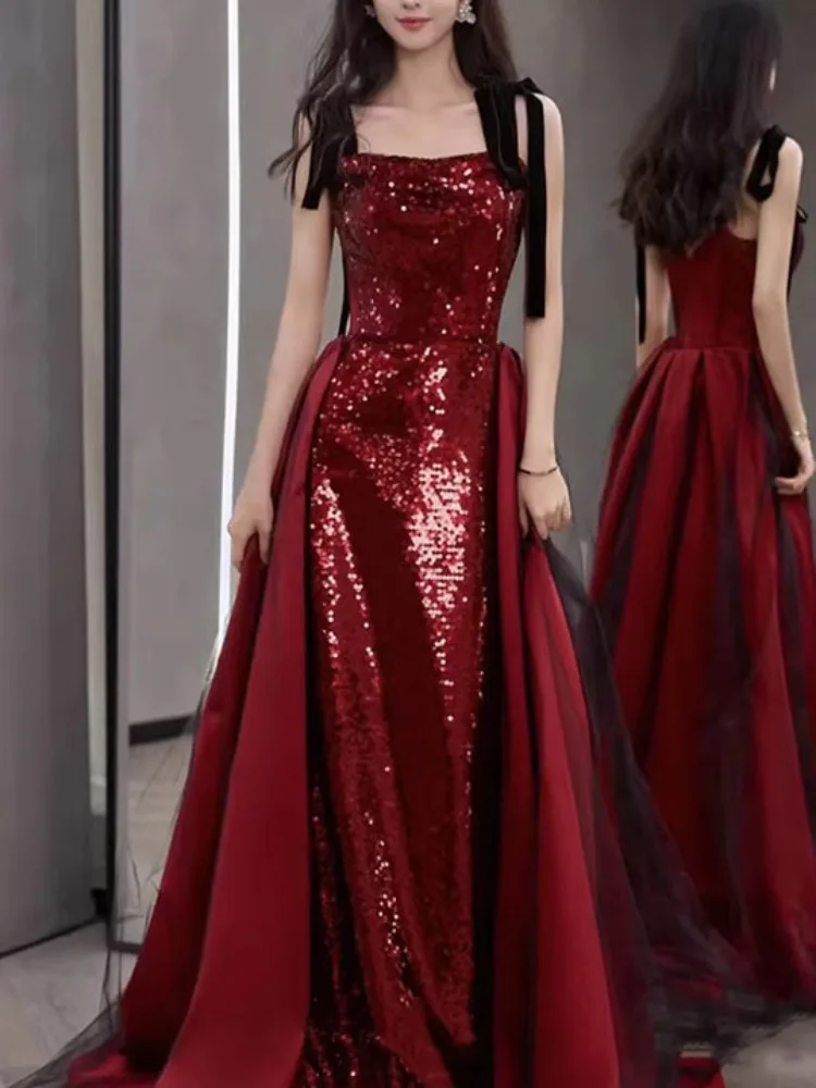 MQTIME - Wine Red Temperament Sling Wedding Party Dresses Slim Waist Sequin Patchwork Prom Vestidos Elegant Lace-up Long Eveni