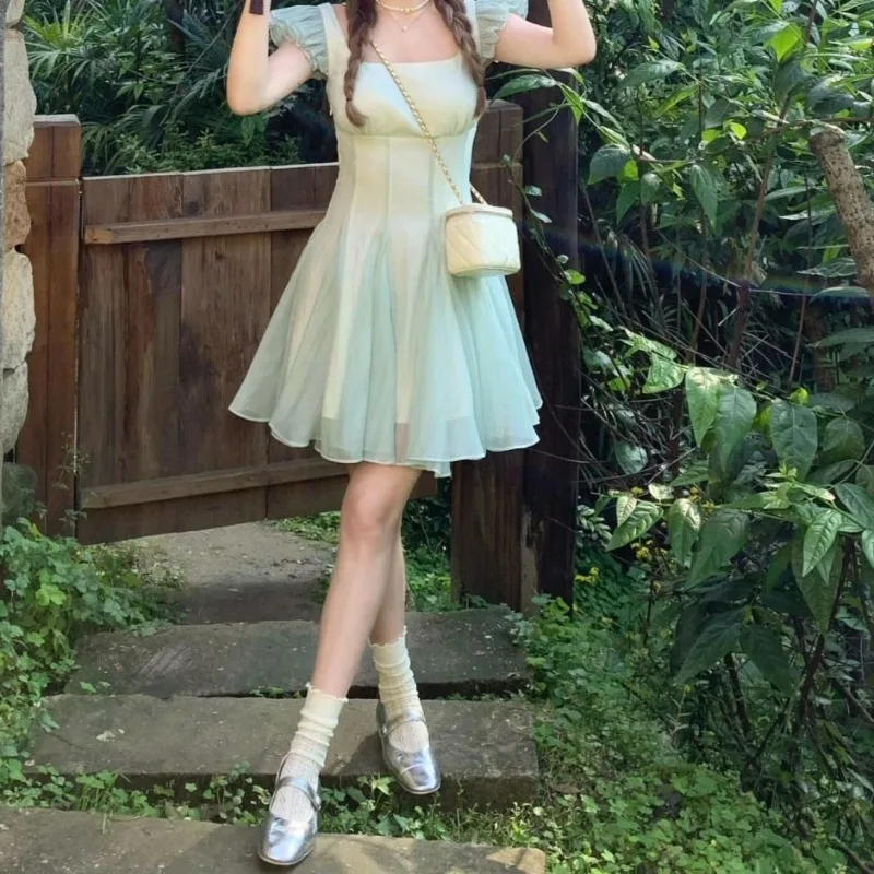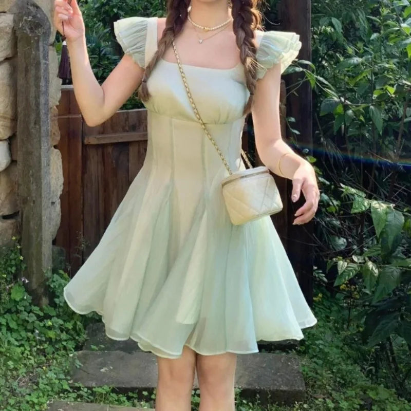 MQTIME - Woman Dress Elegant French Style Flying Sleeve Summer Fashion Casual Square Collar Party Mini Dresses Sweet Ladies