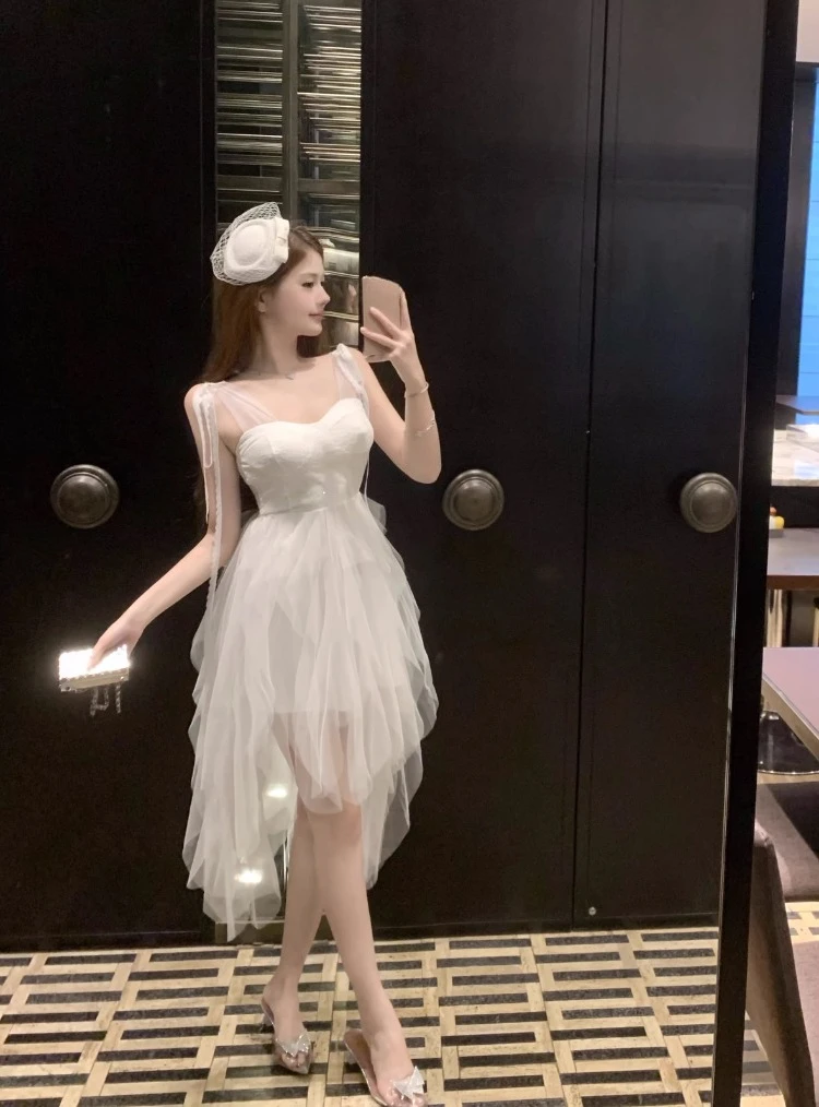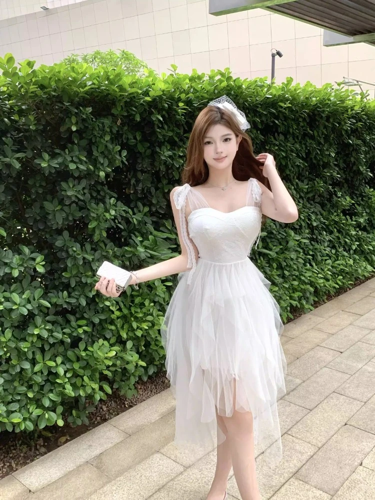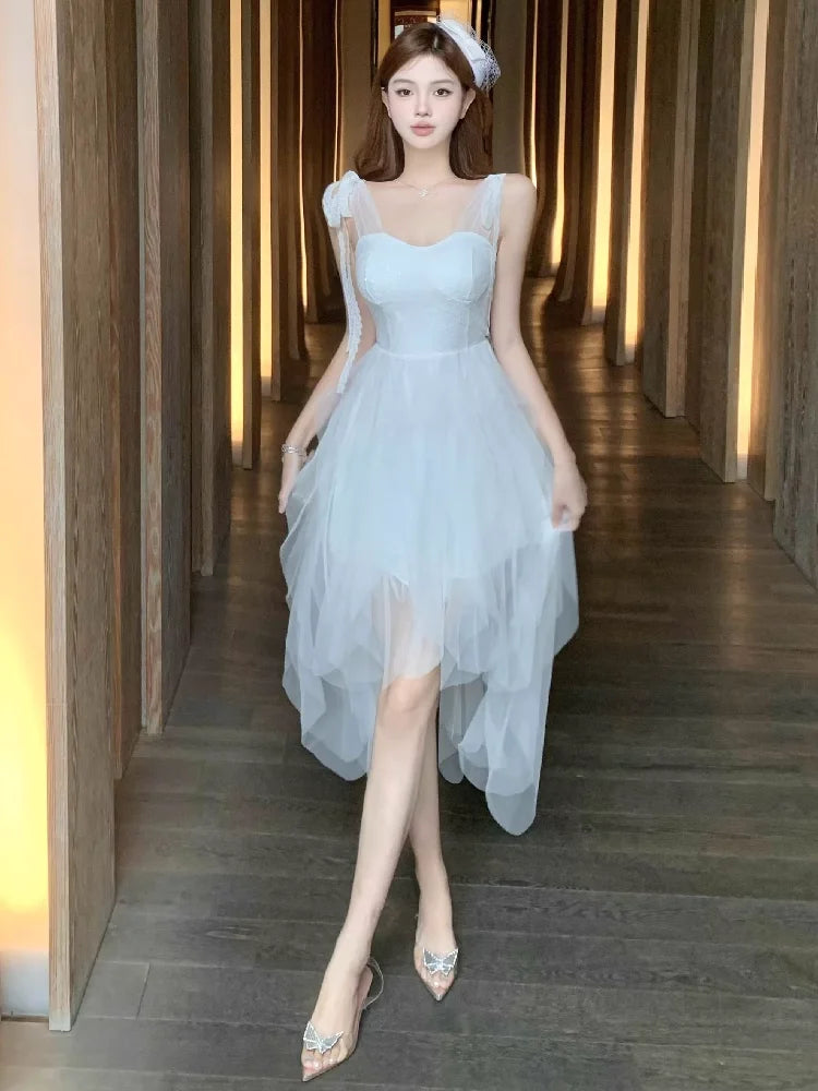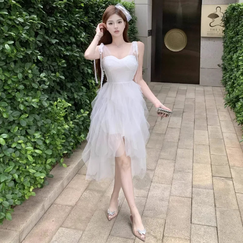 MQTIME - Woman Dress Mesh Patchwork Sleeveless Irregular Slim V Neck Ribbon Princess Sweet Elegant Party Dresses Female Fashion