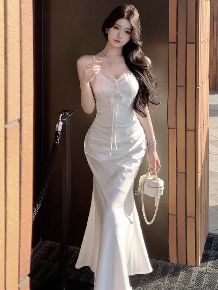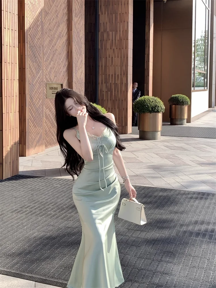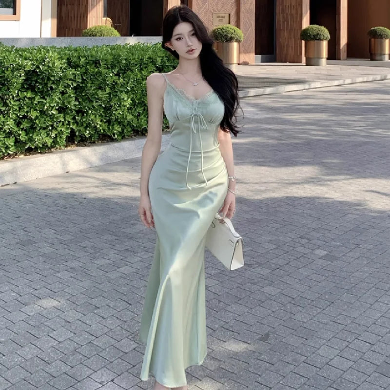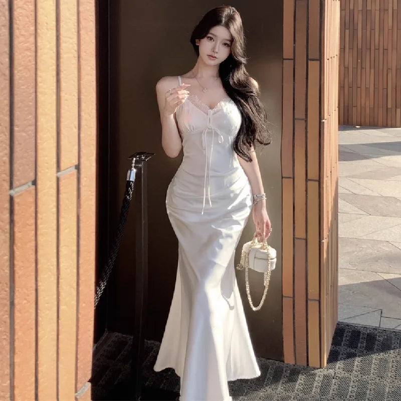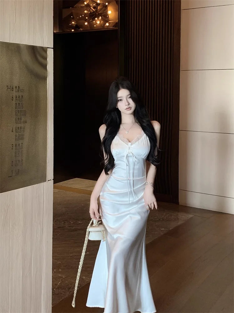 MQTIME  -  Woman Dress Sleeveless Satin V Neck Lace Patchwork Bandage Sexy Elegant Backless Mermaid Dresses Party Female Fashion