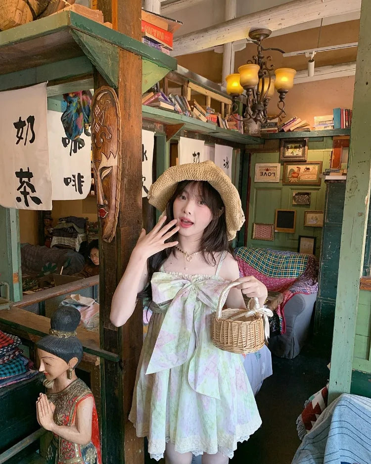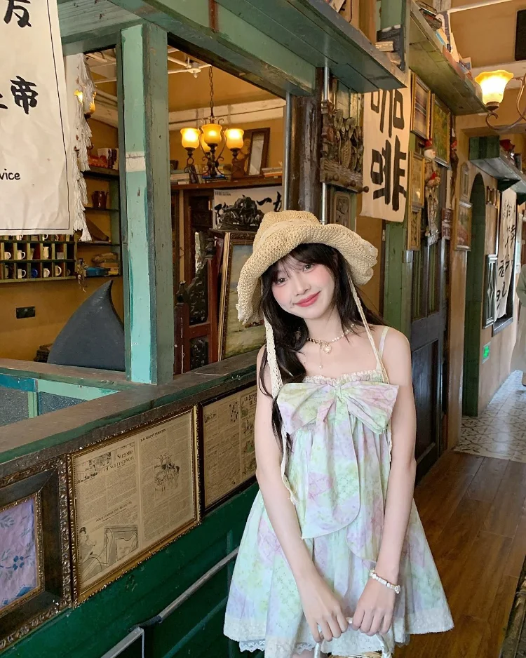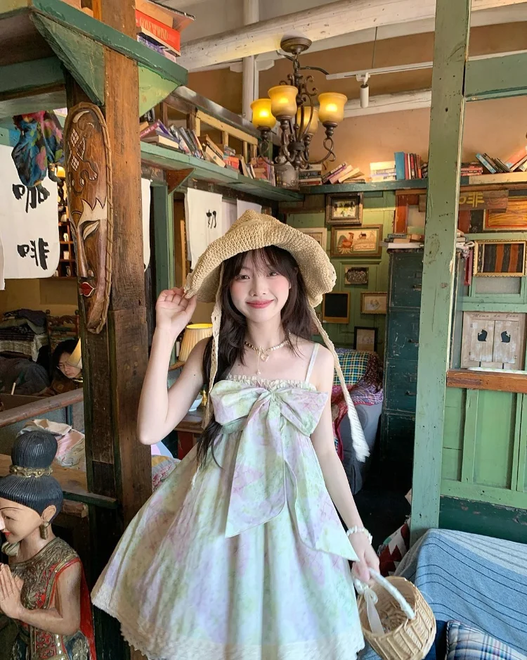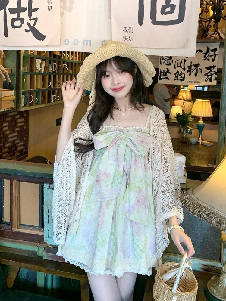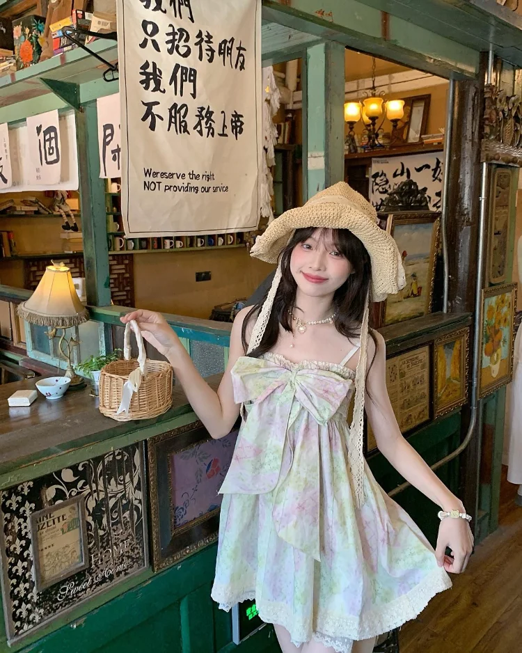 MQTIME - Woman Dress Sweet Elegant Floral Printed Lace Patchwork Sleeveless Bow Summer Fashion Party Mini Dresses Female Casual